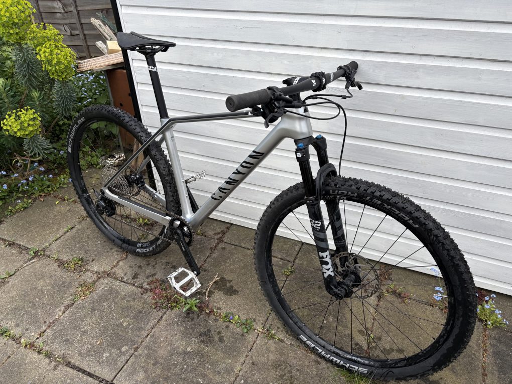 Canyon Exceed CF5 HT with Deore 12 Speed groupset – size medium. I am 5 ft 11 and this bike fits me well!