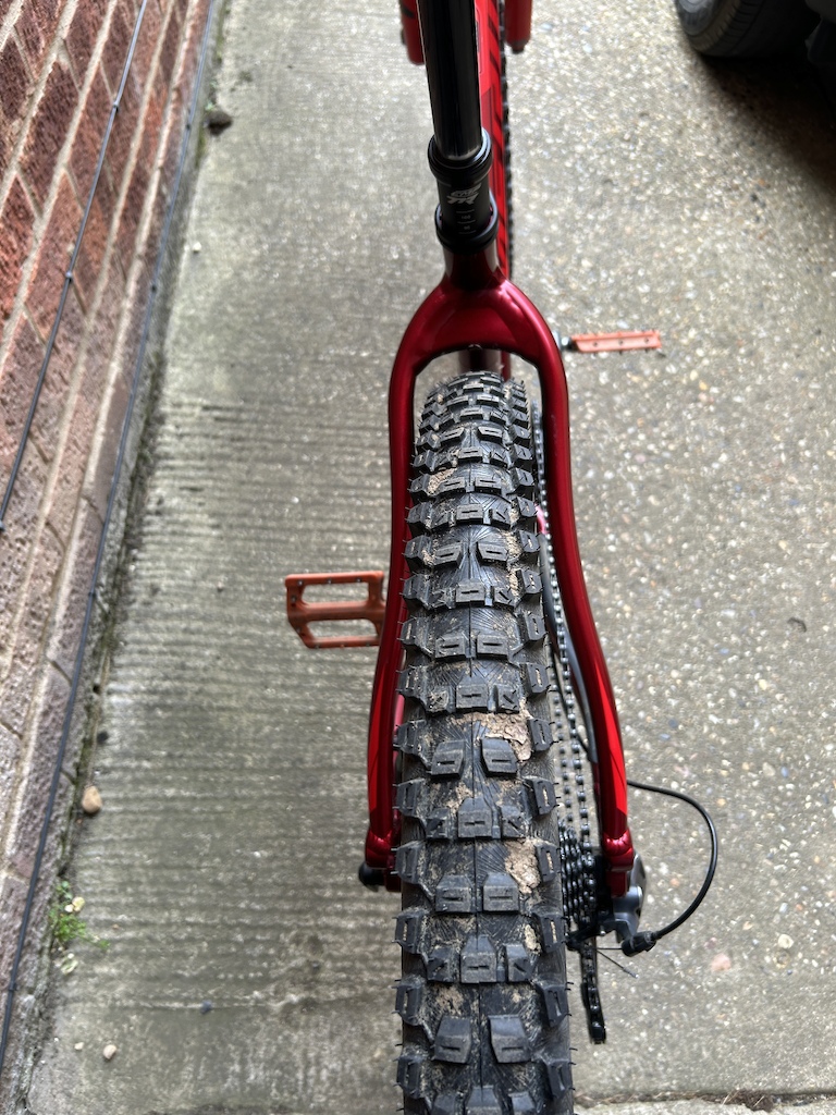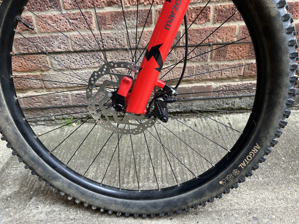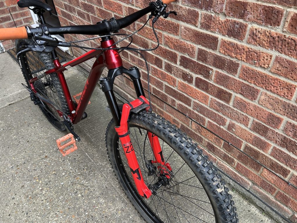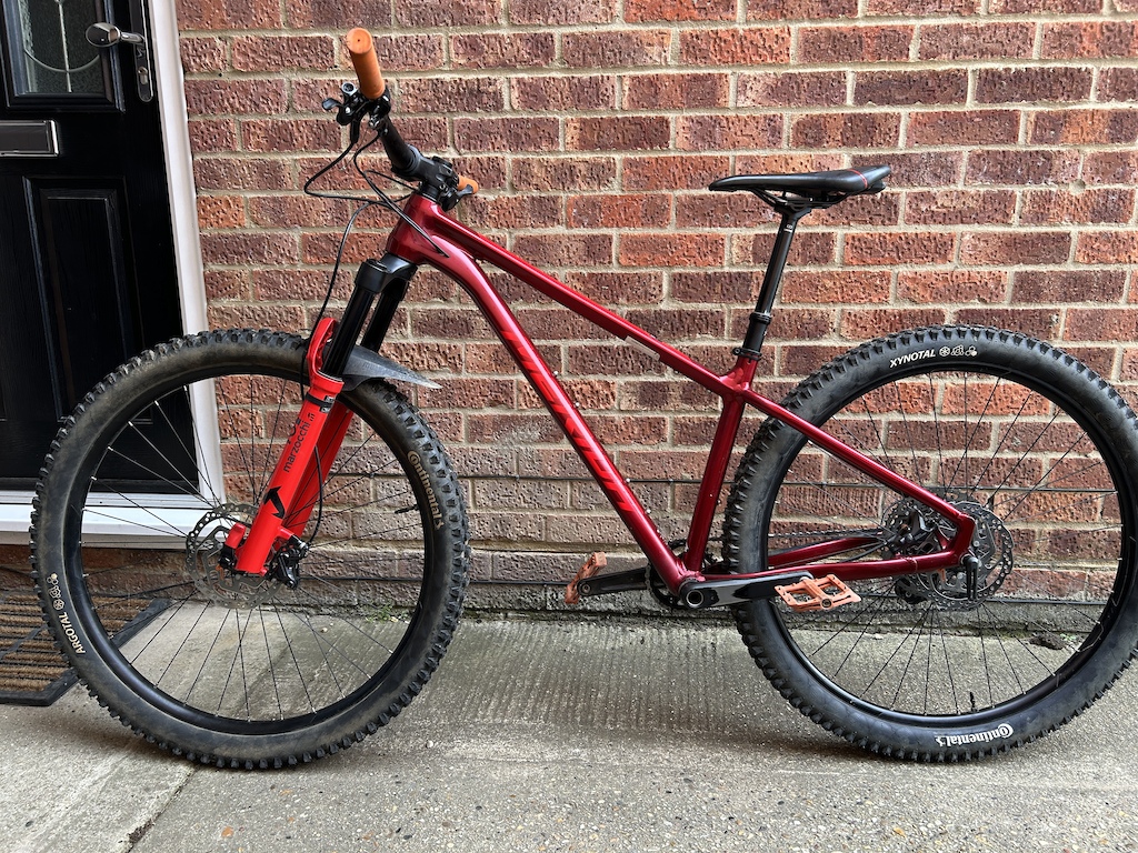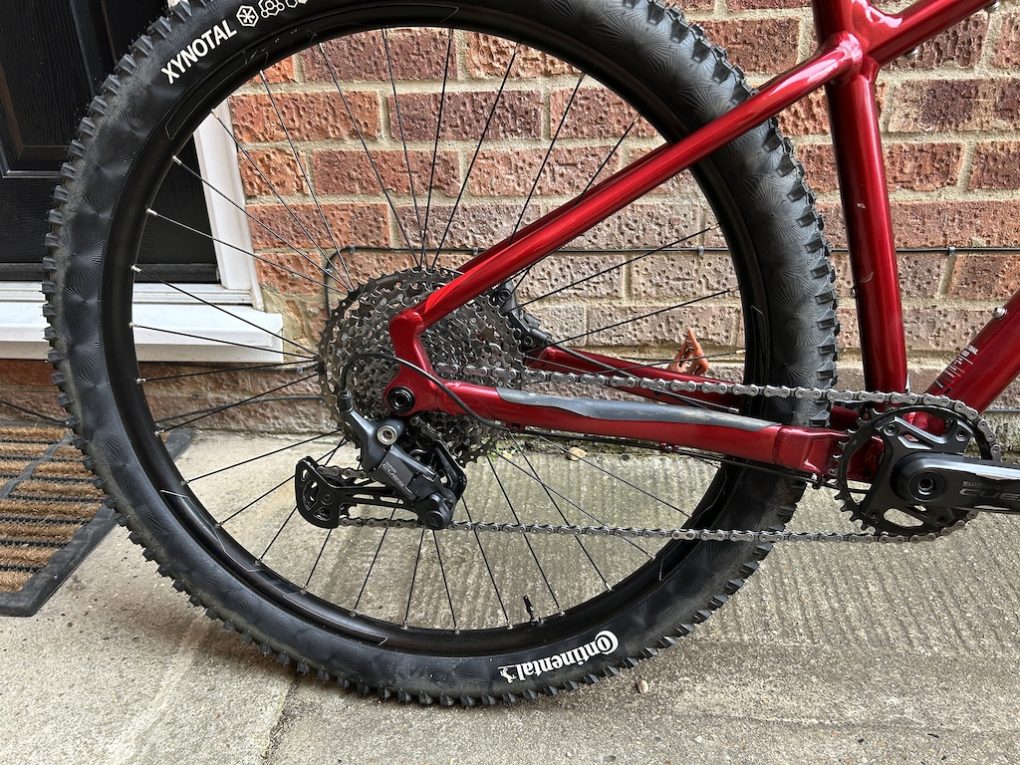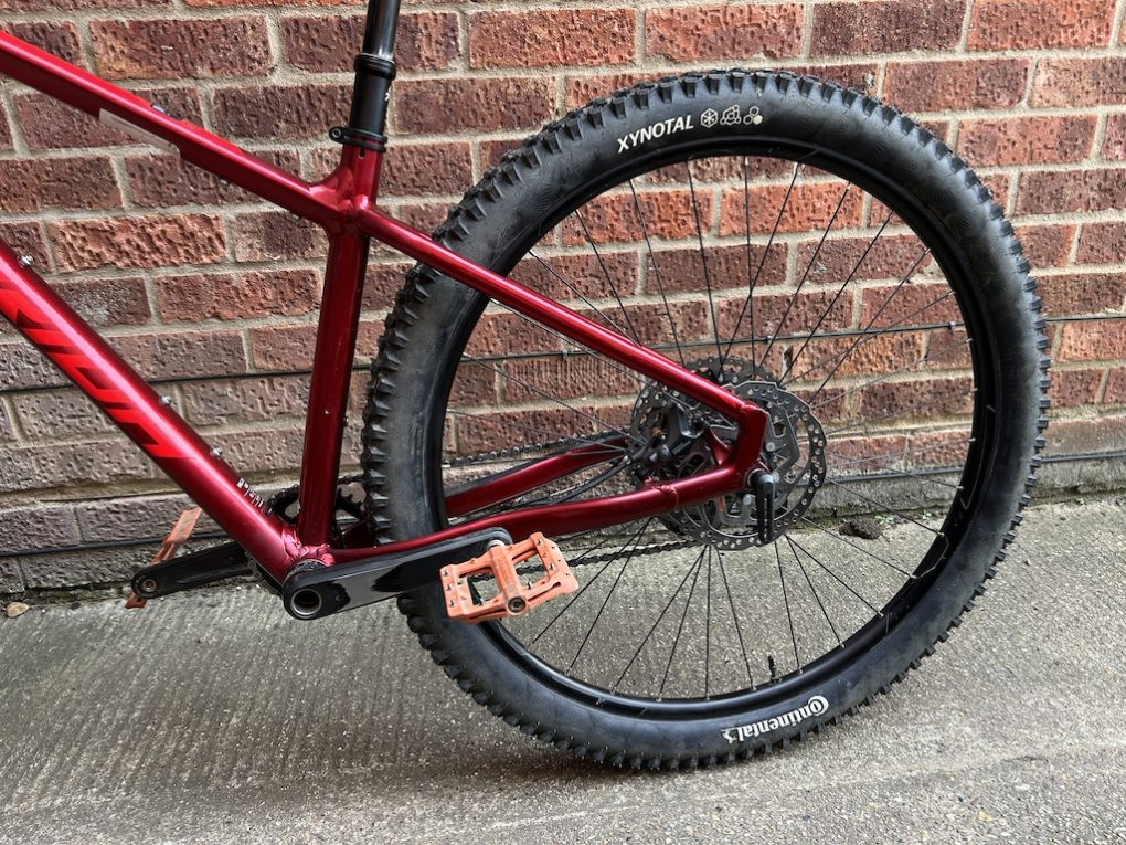 29 inch wheels with upgraded tyres; Continental Argotal (front) and Xynotal (rear). Rear tyre is basically brand new – Both are set up tubeless.