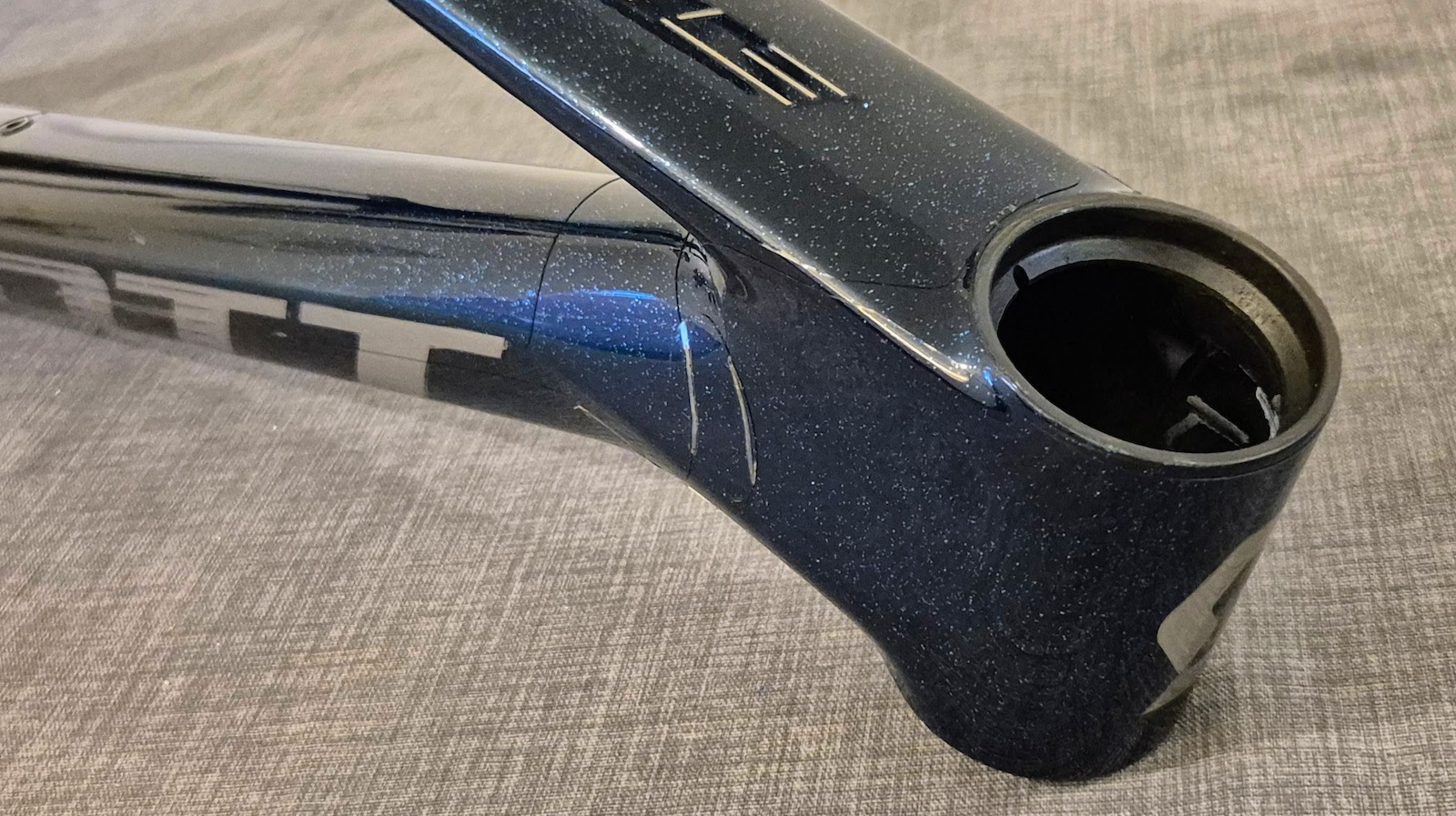 Incredibly light – circa 1kg. Beautifully finished frame only paintjob in Navy blue sparkly fade.
