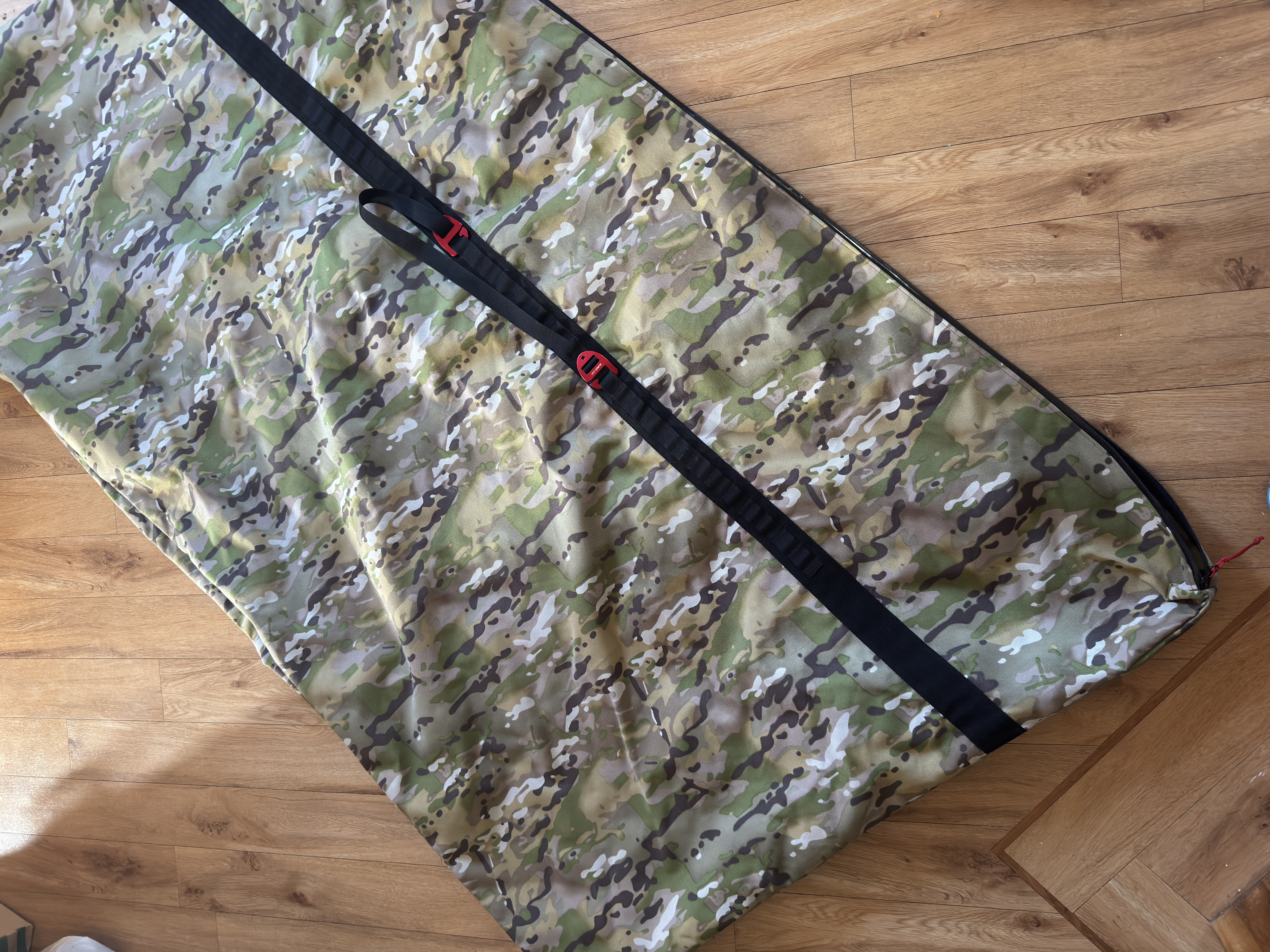 Up for sale is my DIY bike bag. It was based upon the Duff Bags but was made much much bigger. It was designed to fit a large full suss 29er with a 150mm lyrik and 800mm bars and keeping the rear wheel with chunky 2.5 tyres in place. It did also fit my last XL Hightower with a 150mm fork but doesn’t fit my new XL bike with a longer wheelbase and with a 160mm fork.  It’s very close to fitting just not quite  I could unpick and put in an end panel but it will be much quicker to make a new one Â