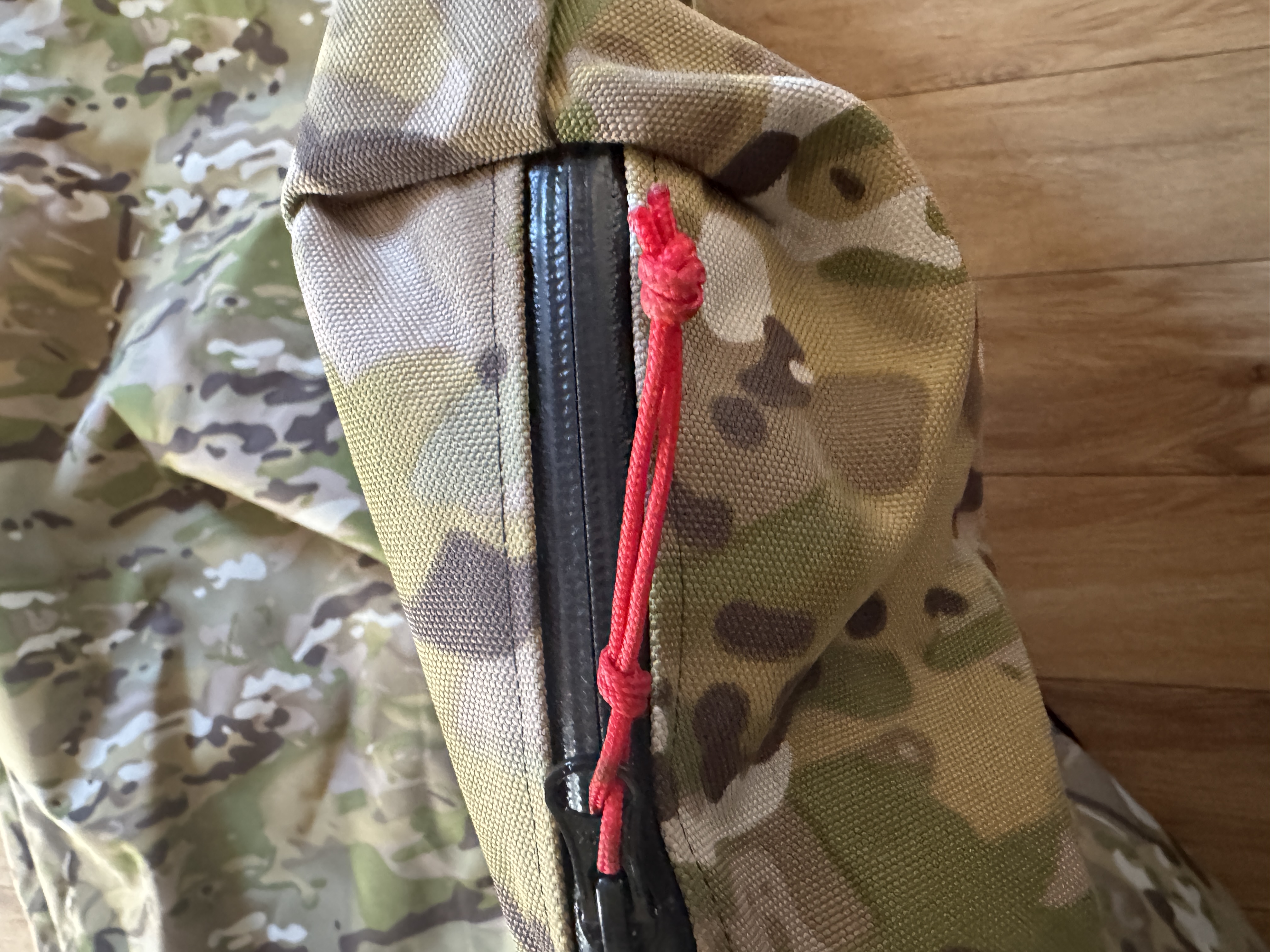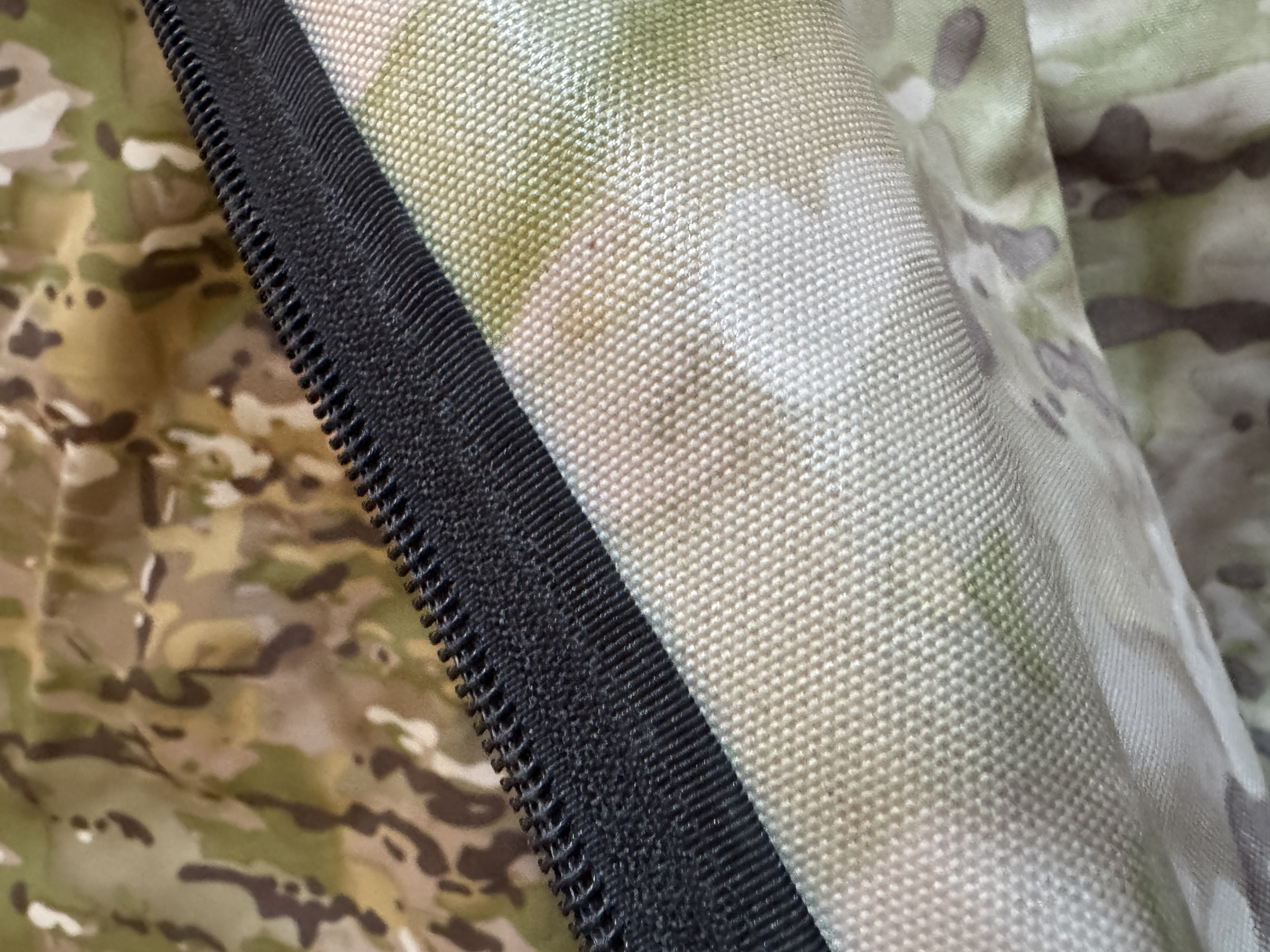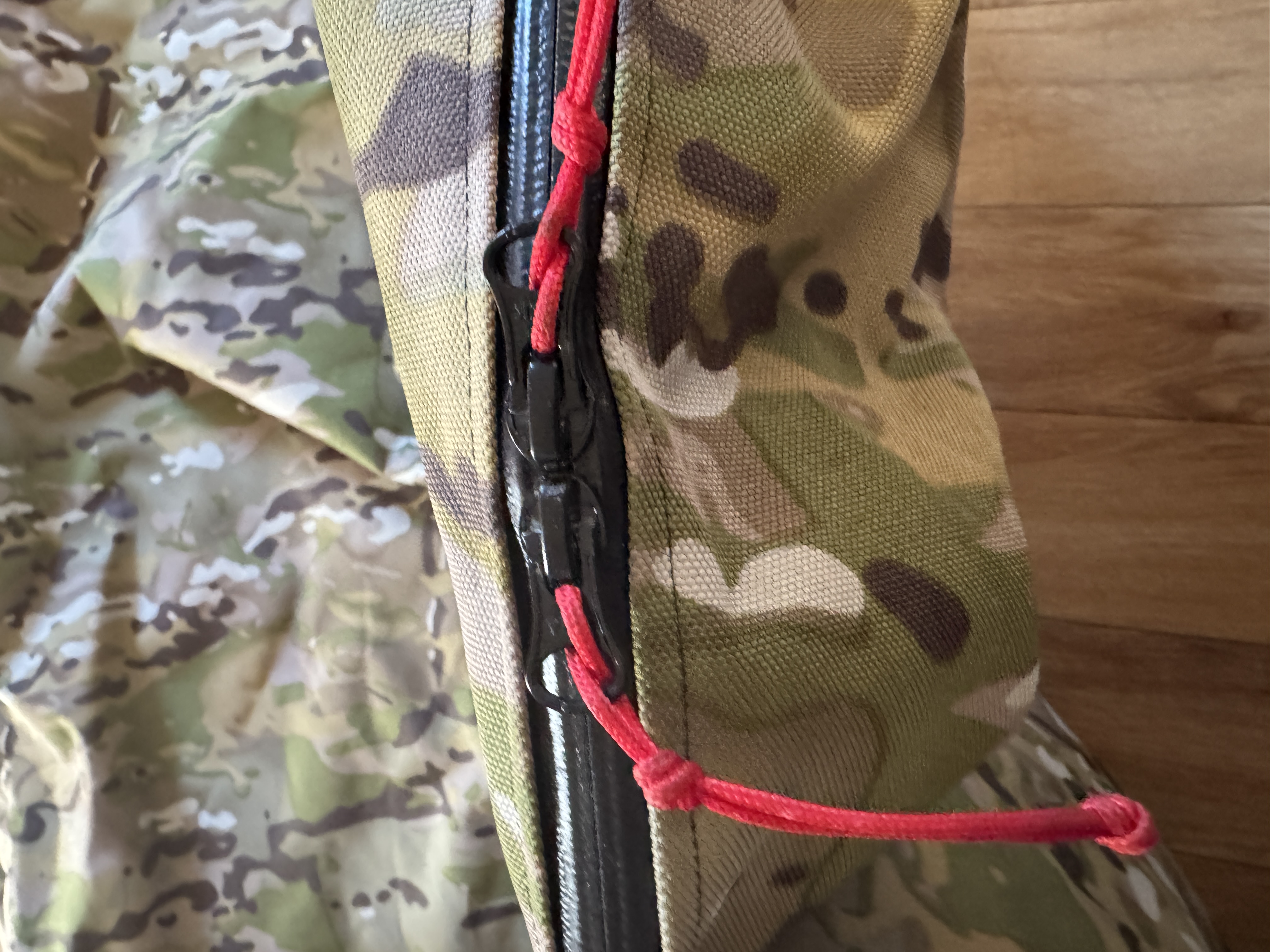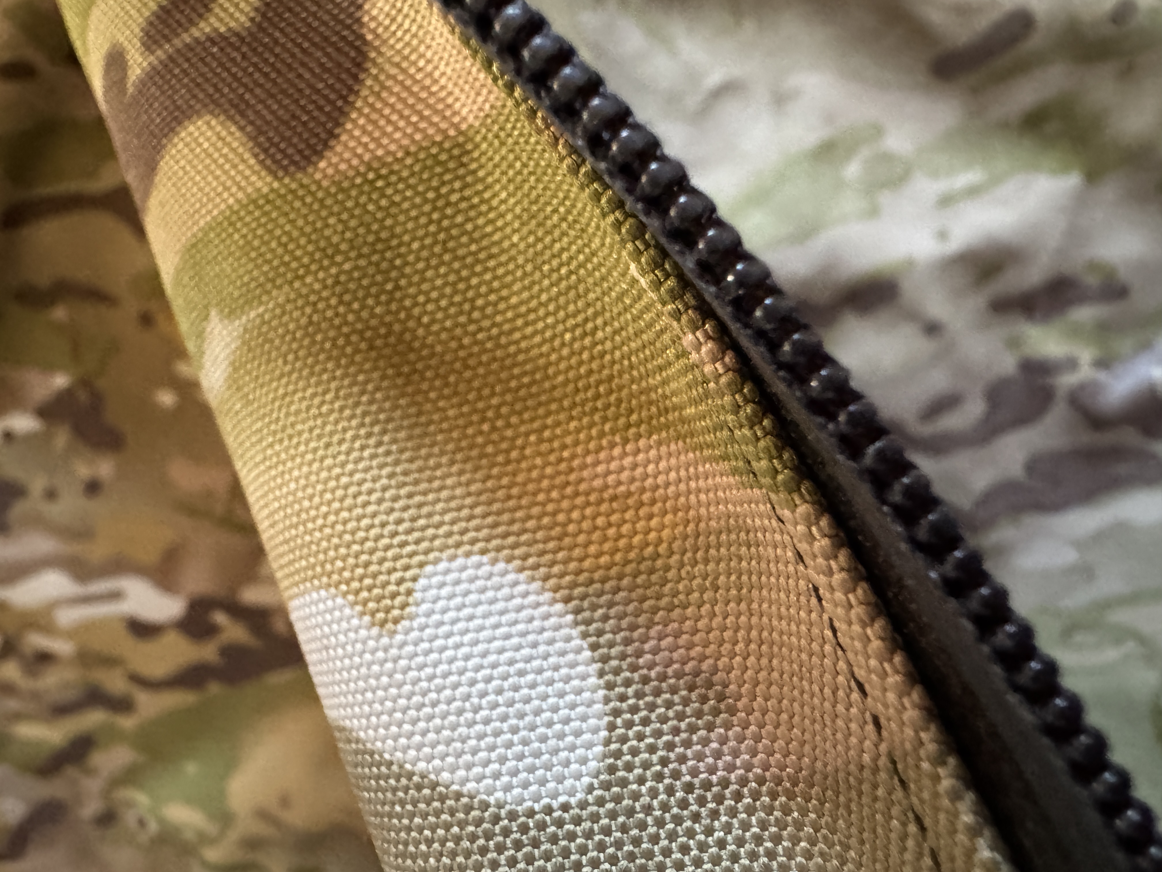 I built this for me so I didn’t skimp on material. It is made from heavy duty Cordura (the real stuff) with a double weatherproof YKK zip. Sewn with black 100% polyester Gutterman thread. All seams have been stitched and then bound with gross grain tape.Â