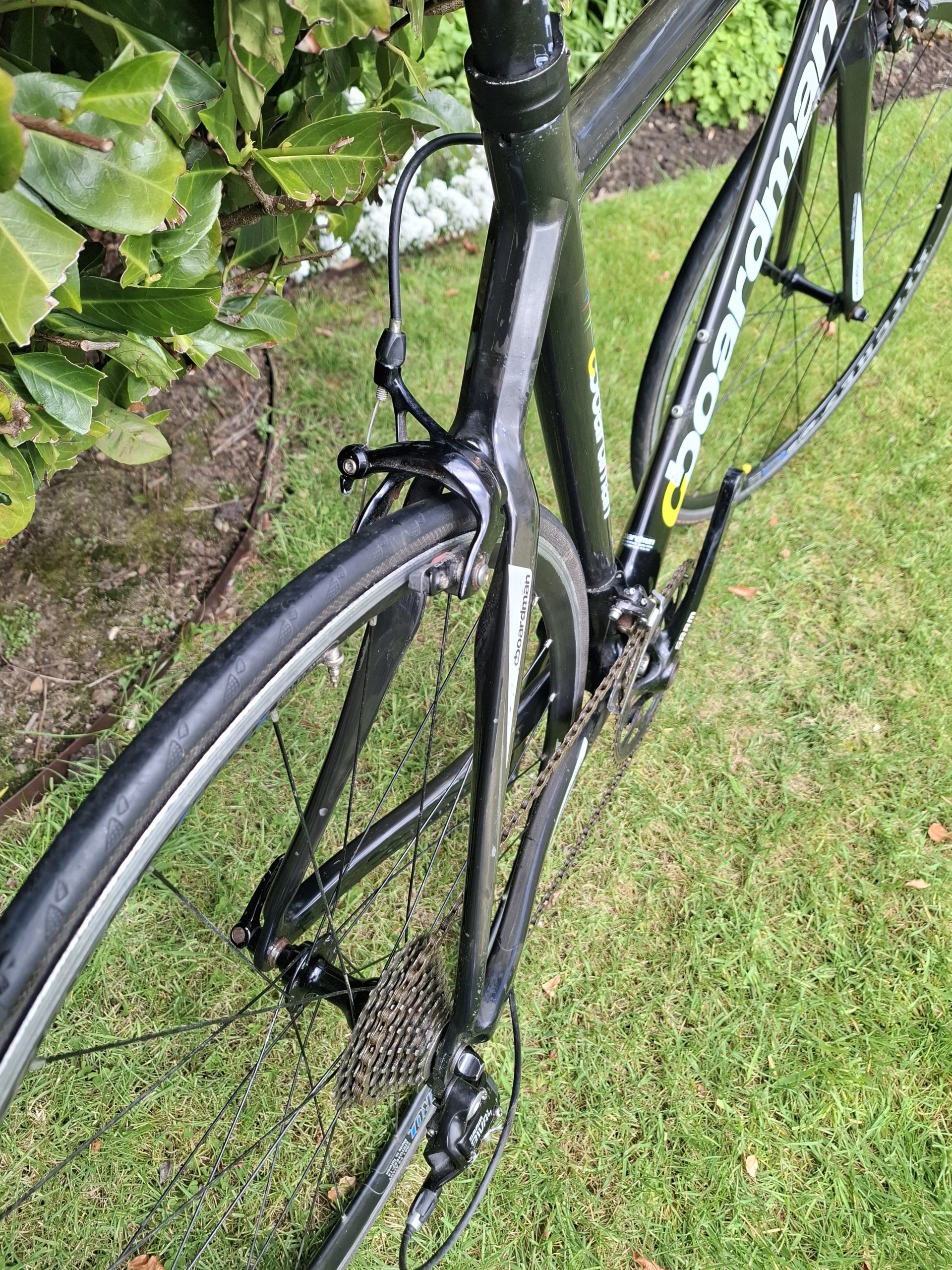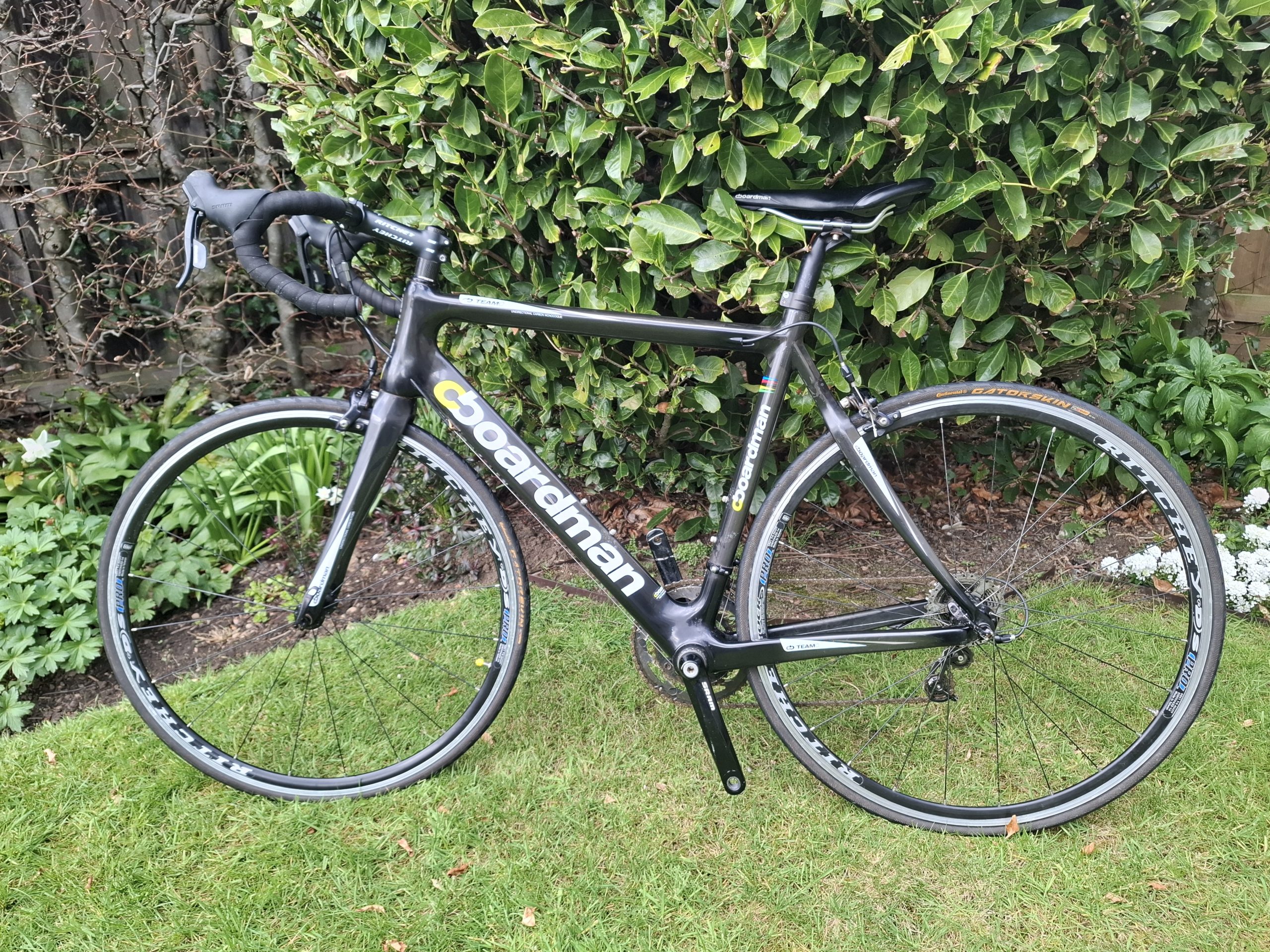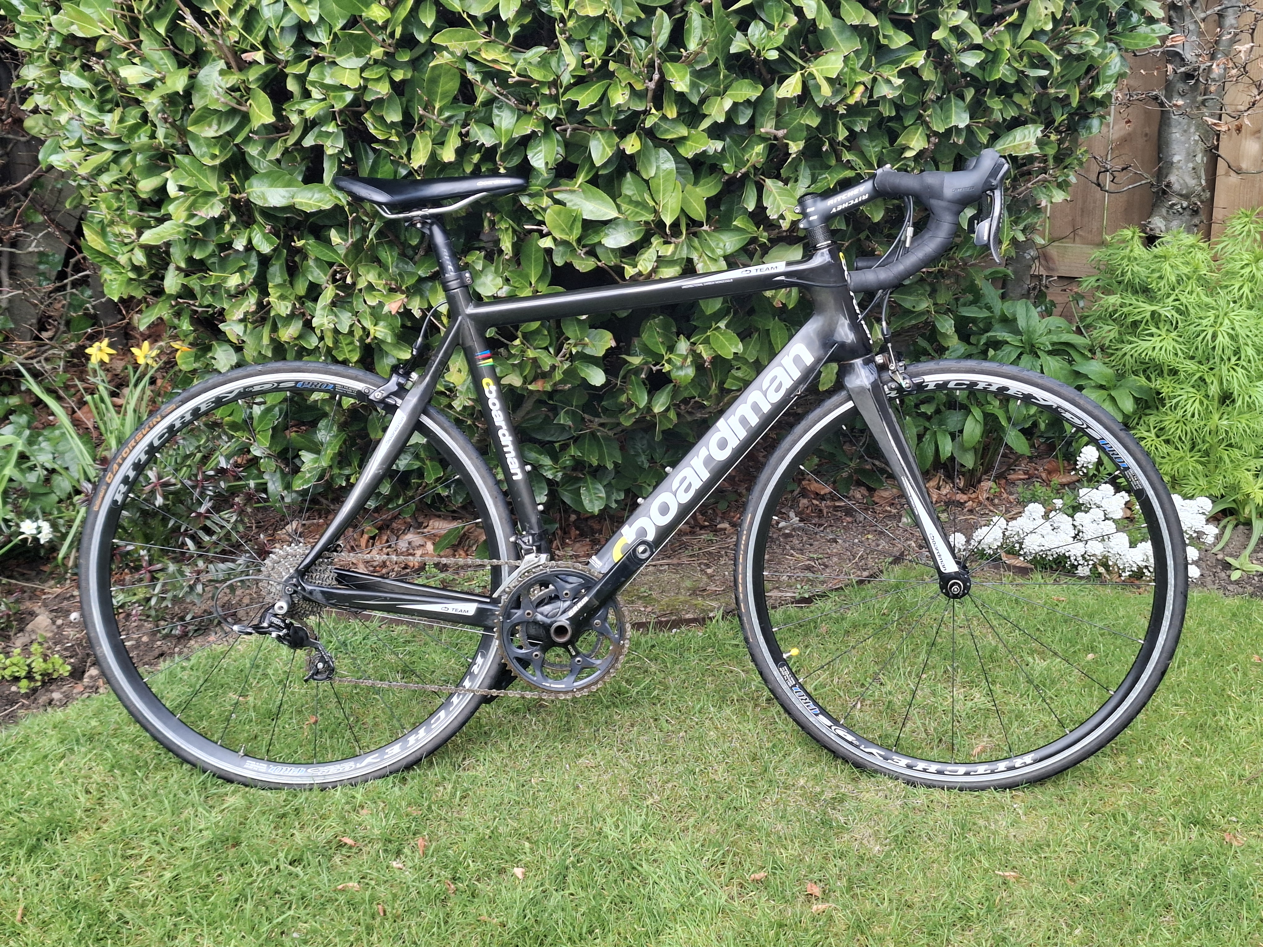 Boardman Team C, Carbon frame and forks, skinny wheels. Size? Not sure, it’s 51cm BB to top of top tube, 56cm BB to top of seat tube.