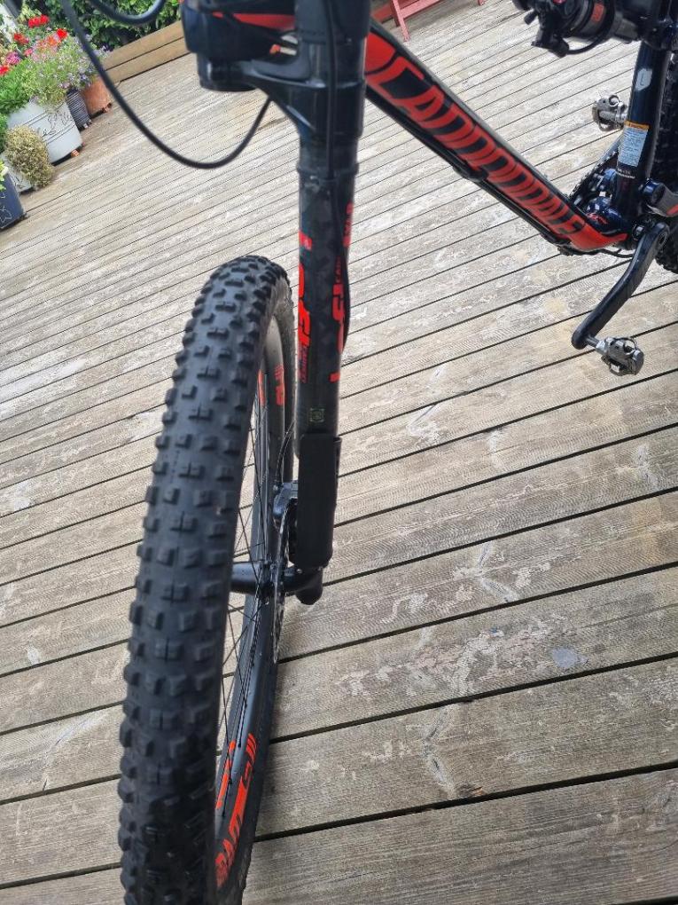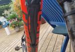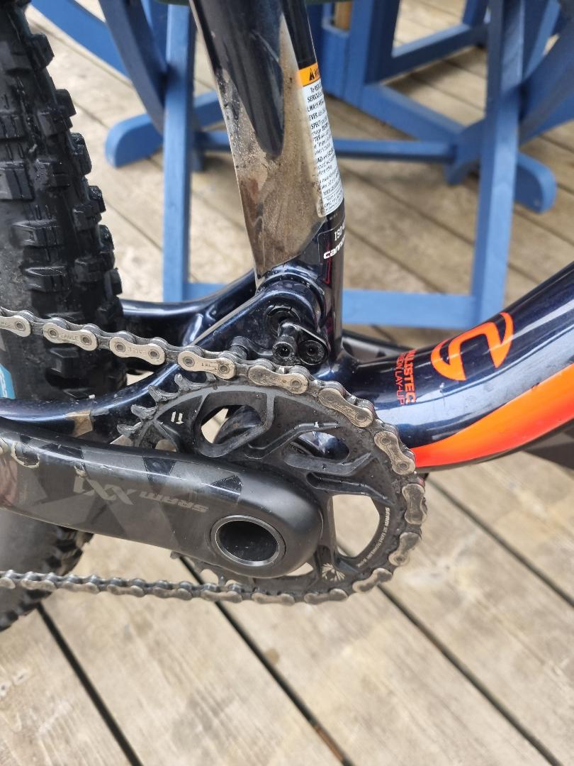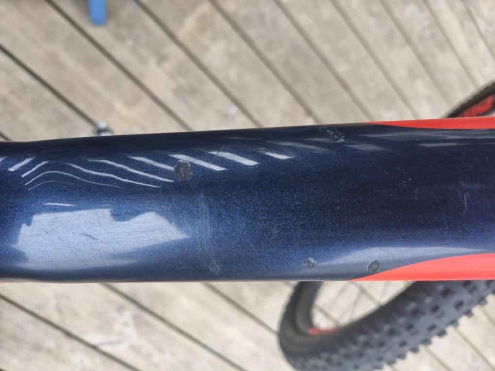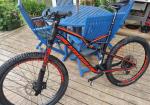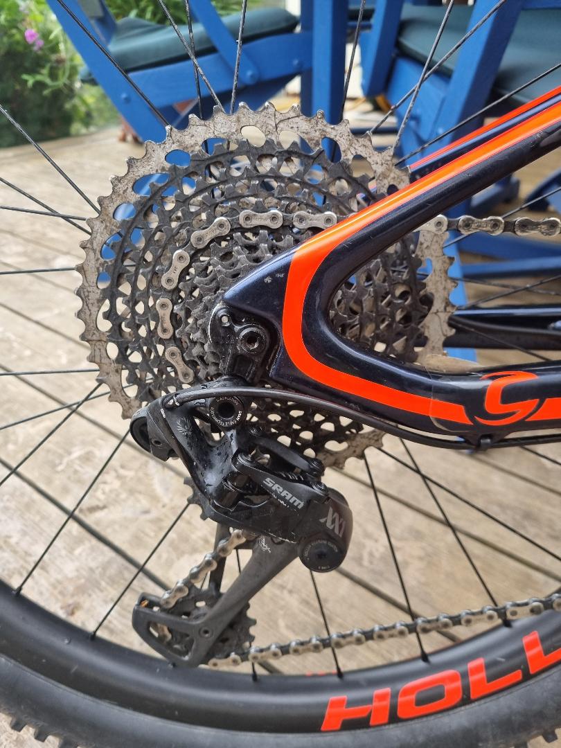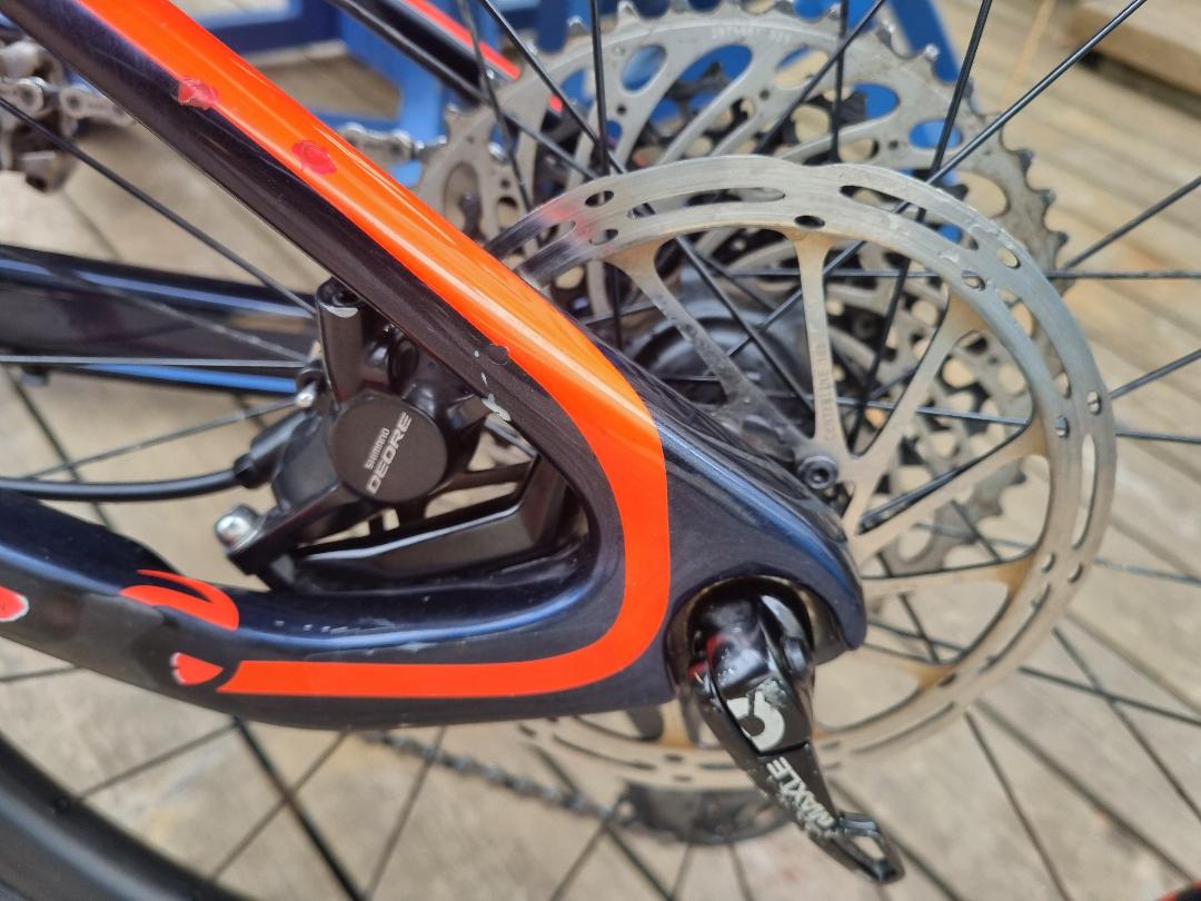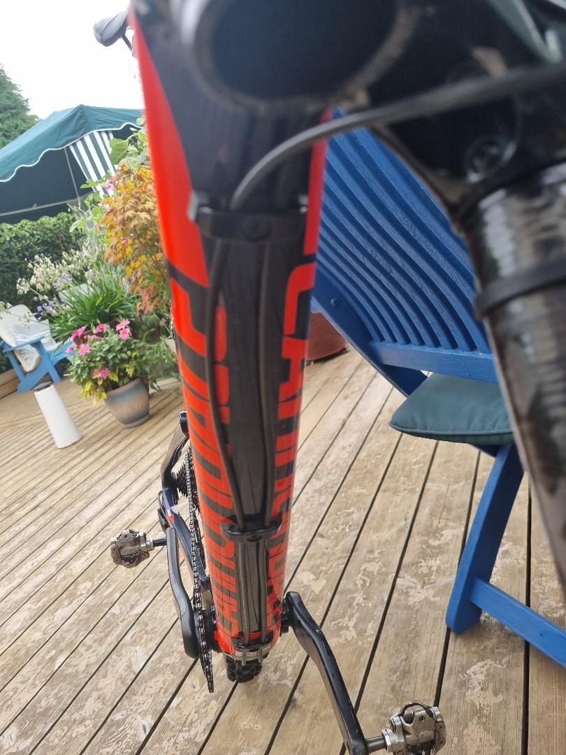 “Used in great condition with a few minor chips on top tube and chainstays – only gel coat chips. Comes with two good tyres. Pedals not included. Gears chain brakes dropper post all in good condition. Carbon everything including wheels. Has some (peeling) invisiframe on downtube and other areas. Collection ONLY from Reading/Ascot/Swinley forest area. Selling as I need the space.”
