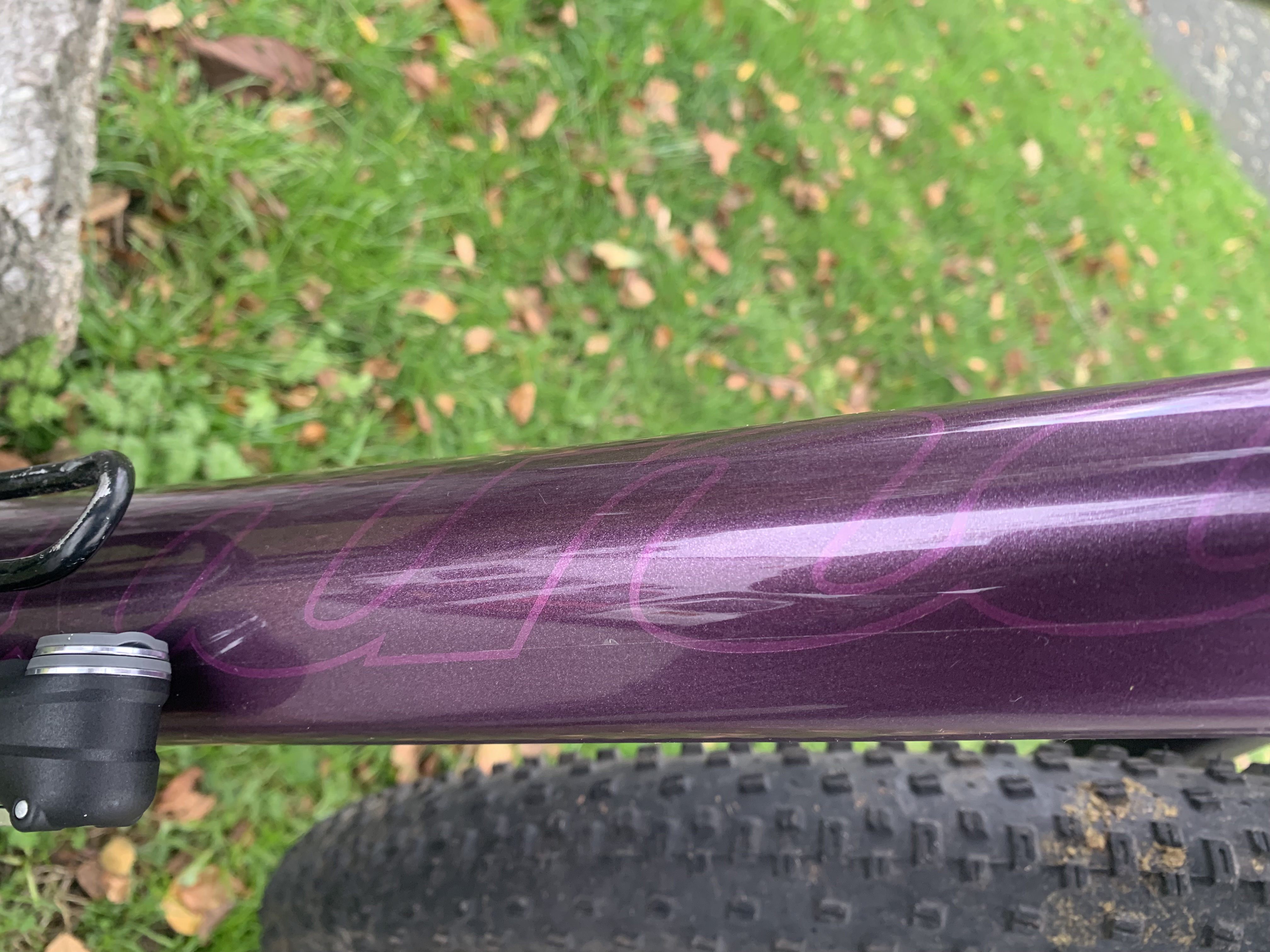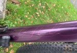 – Shand Oykel full carbon frame in custom purple and grey fade paintwork with the Shand logo in the paint on the down tube and head tube, and a picture of Steven Shand in the paint on the back of the seat tube/BB junction (these are very hard to photograph but look stunning in real life!). There are a few small scuffs and scratches but no knocks or damage to the carbon. The top tube and the graphics to the head tube and down tube are all protected by helitape.