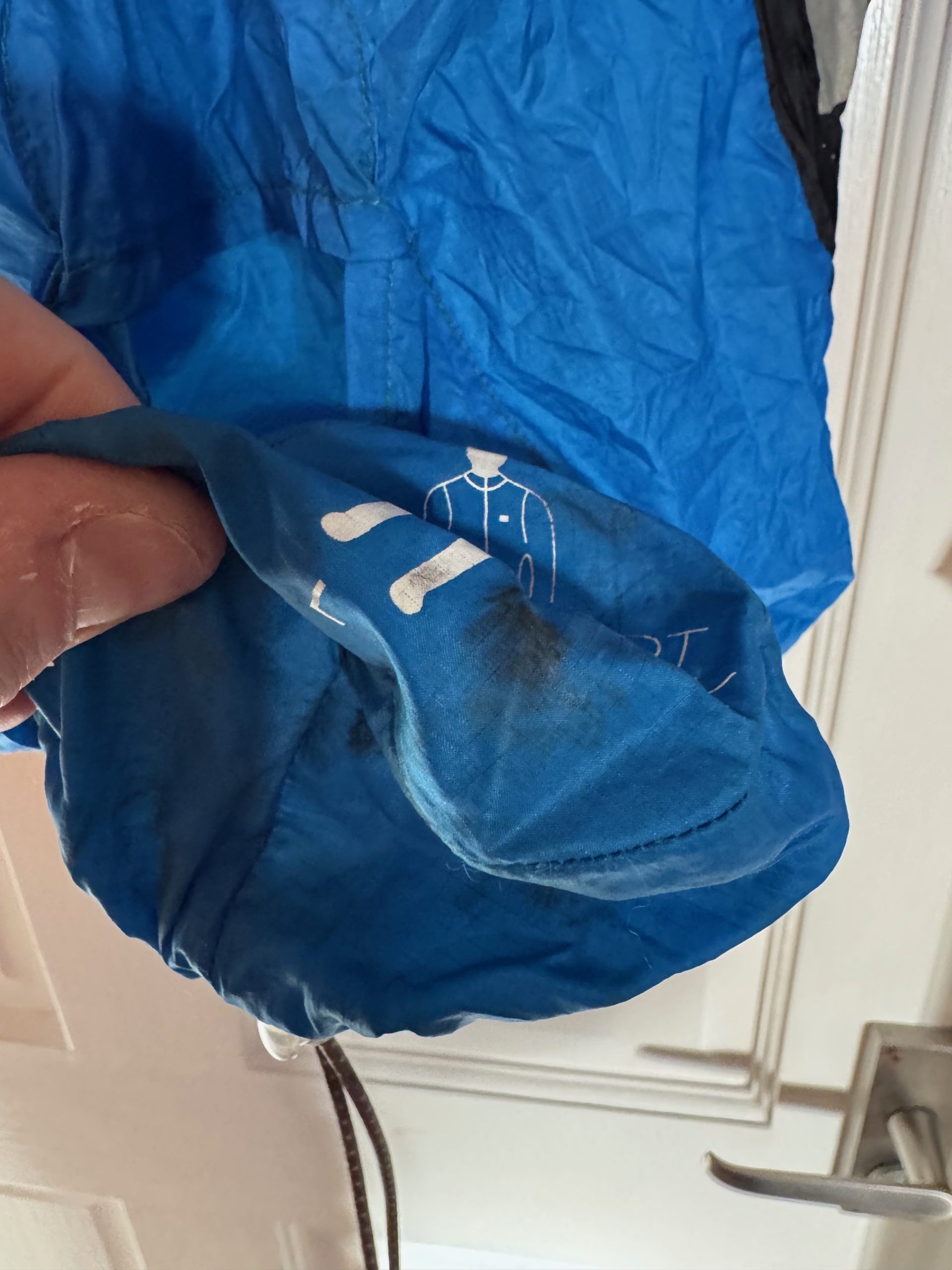 Jacket is unmarked, but the tiny bag its folds up into has some dirty marks on it. Just been sat in my bag/rucksack as a spare/just in case jacket.