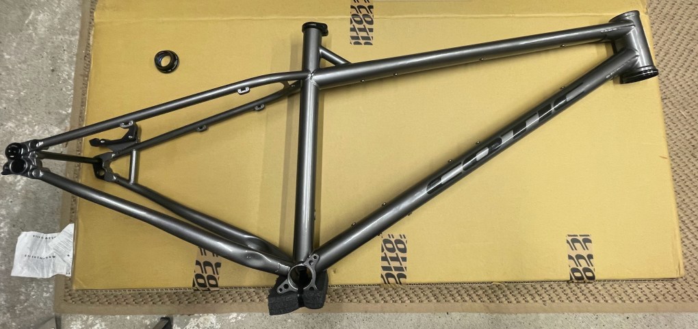 The frame comes with a Cane Creek headset transferred from the old frame. It’ll need some bearings, and there are a couple of cosmetic marks on the headset (shown in the photos).