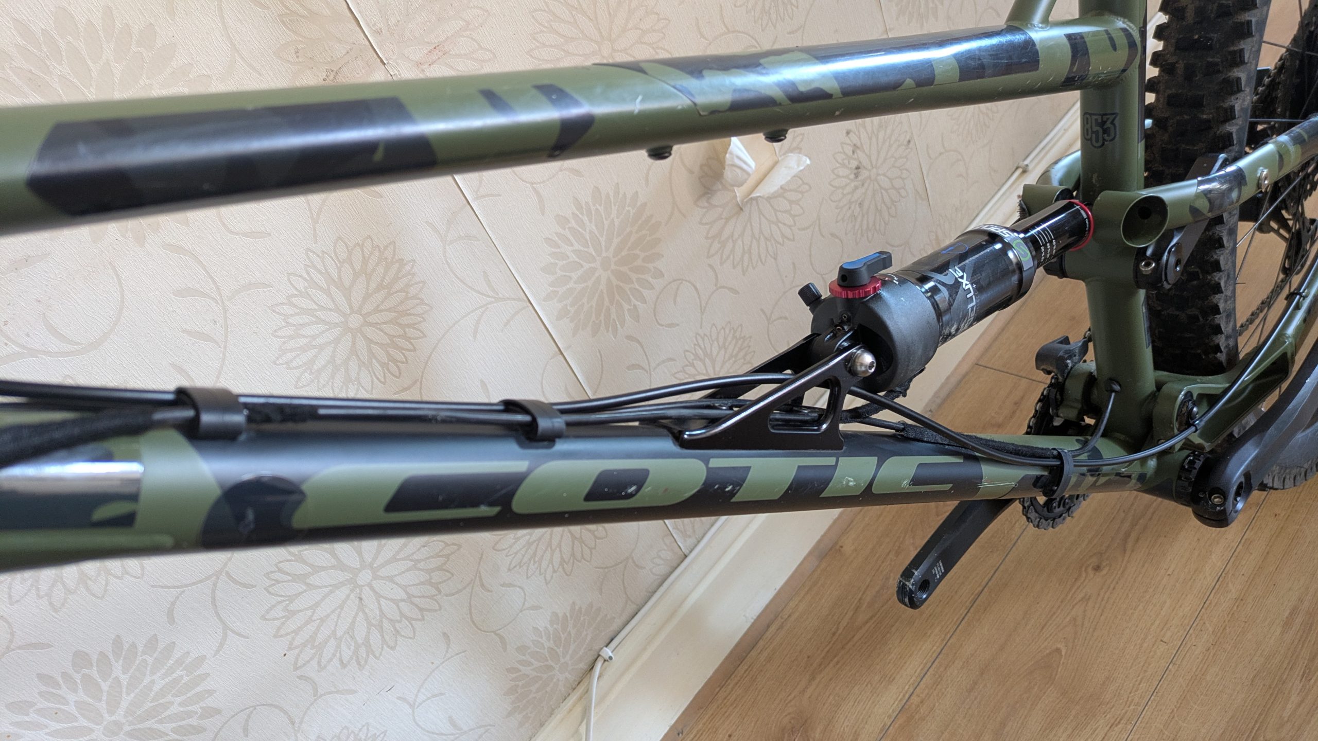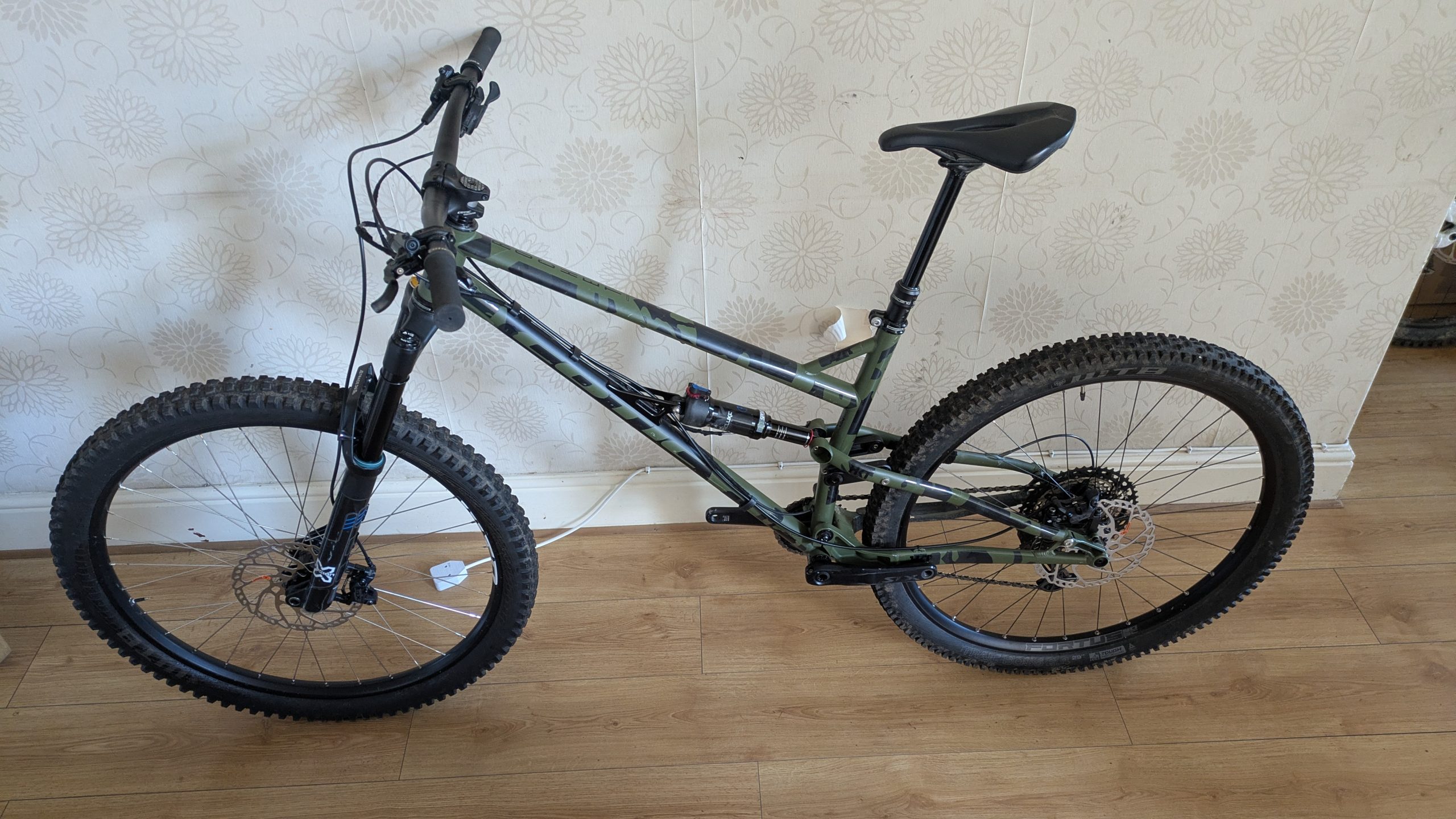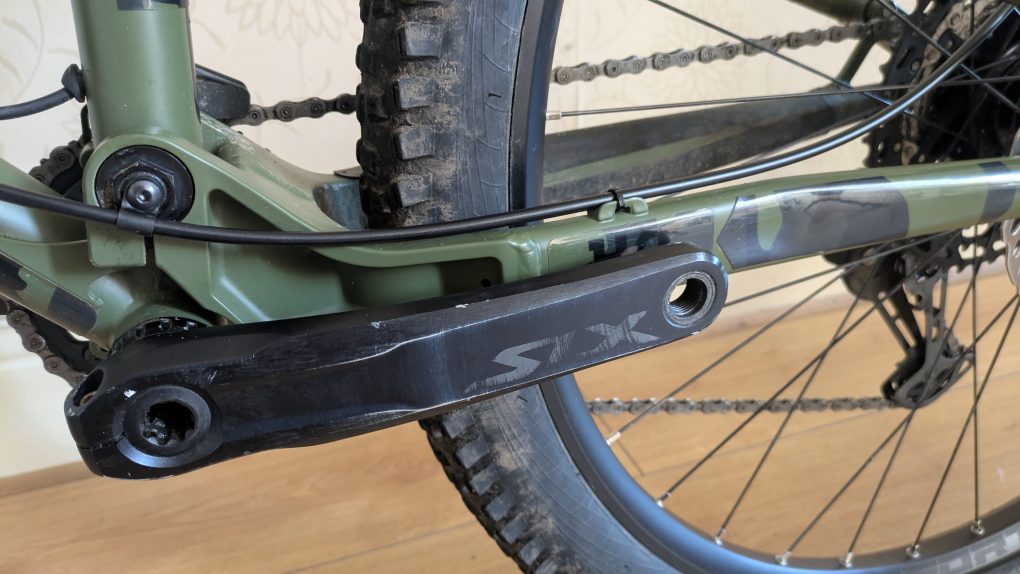 Frame – Size large, wrapped in the camo frame protection before first ride, with the exception of a few little bits which were done post scratch/cable rub unfortunately. Has battle scars, the wear on the top tube is from it being transported with other bikes in the car, no dents anywhere but plenty of scratches and scuffs.