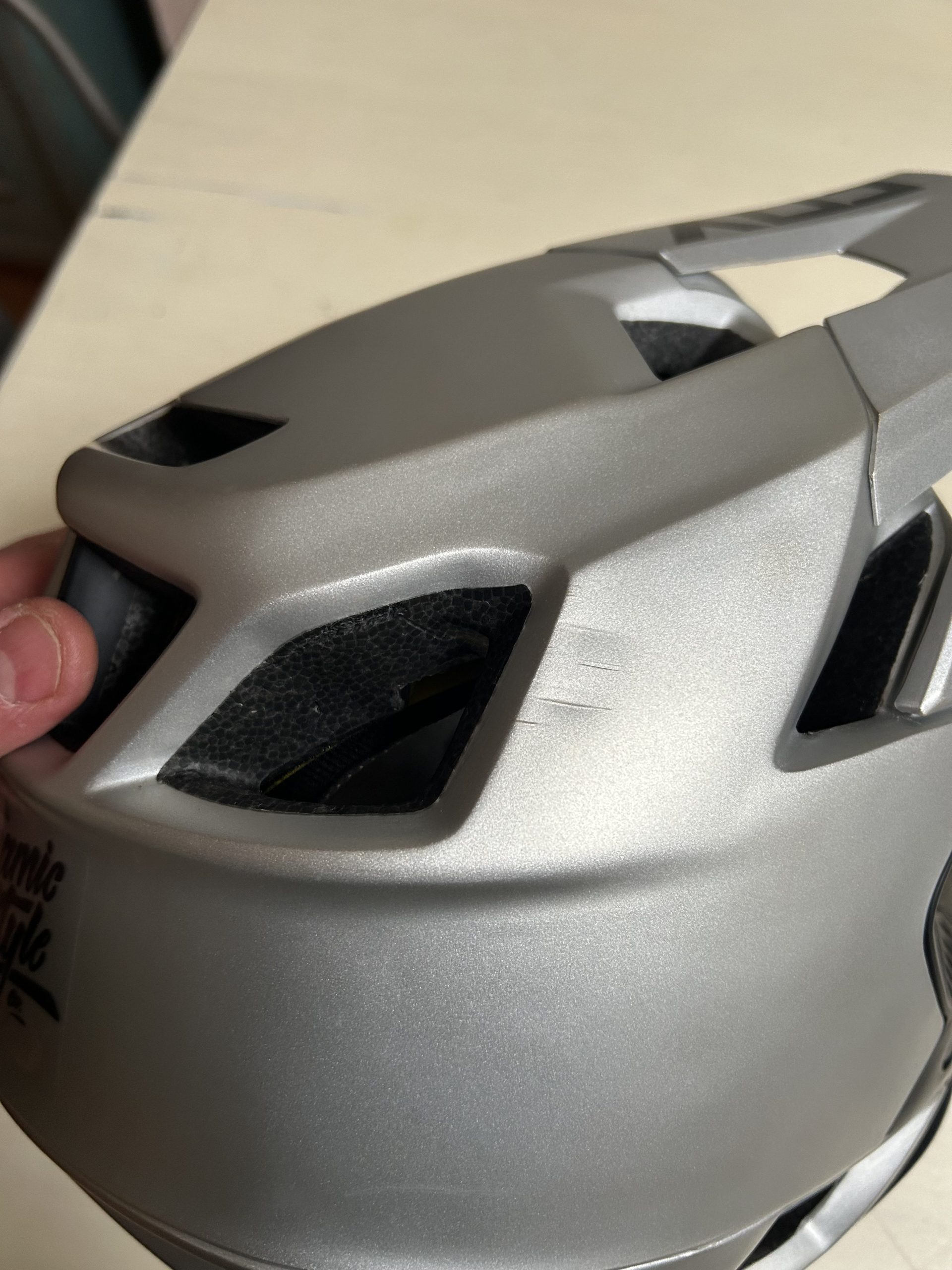 There are some ‘dents’ and a scuff from transport/storage but I have not crashed in this helmet (it would be in the bin).  Please see pics to be sure.