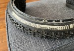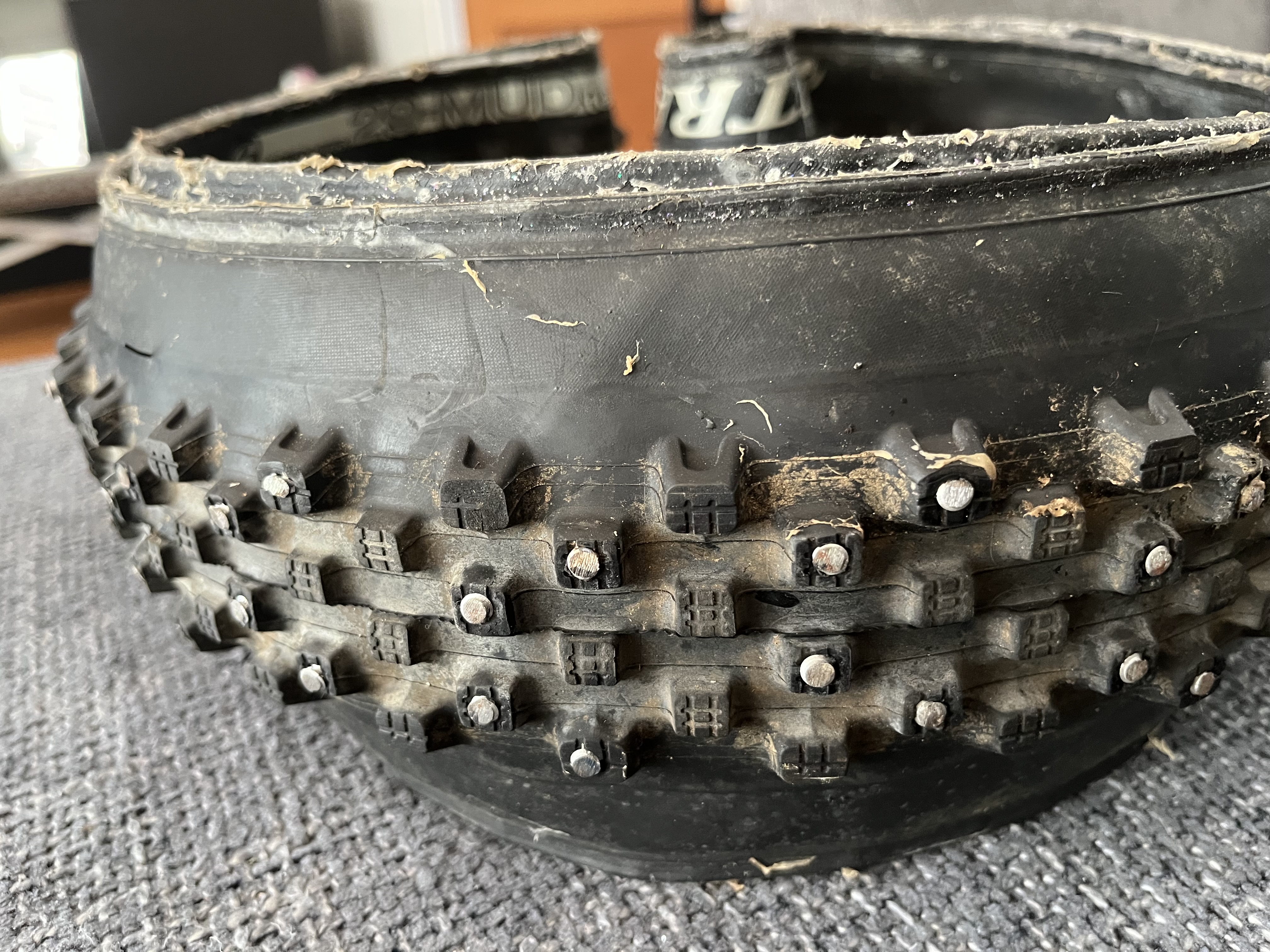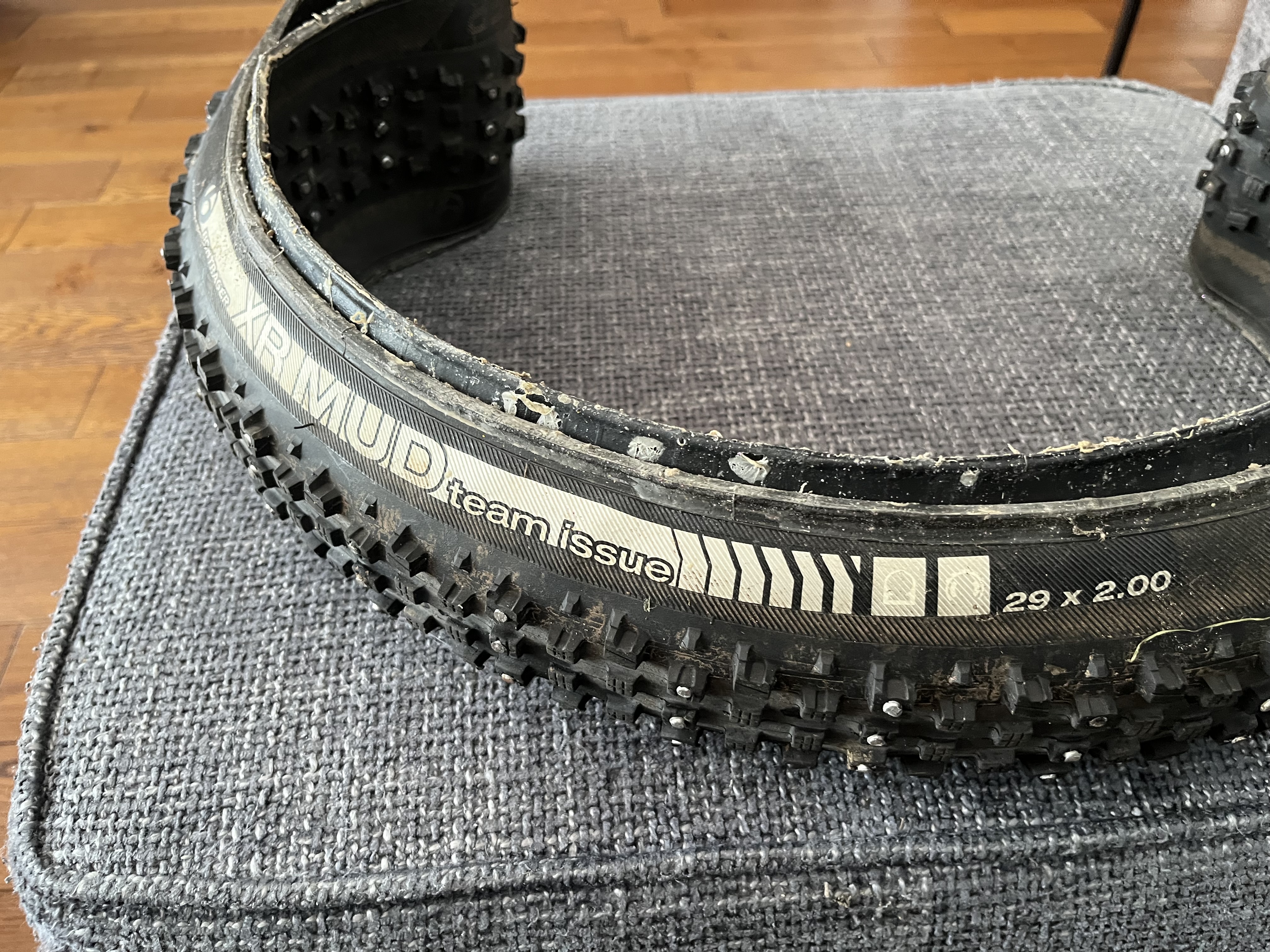 Bontrager Mud X tyres 29 x 2.0. I made these into ice spiked tyres using self drilling screws and grinding the lethal pointy bit off!!.  They work really well but it’s just not cold enough here any more to keep fitting them. They seal with tubeless sealant and weight 830g and 930g so not super heavy. Very sketchy on tarmac.Â