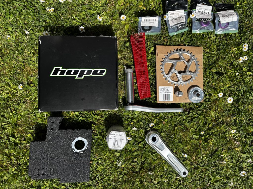 Brand new hope evo crankset 170mm with 32t oval spiderless chain ring, hope bottom bracket, hope installation tools and a selection of coloured crank bolts
