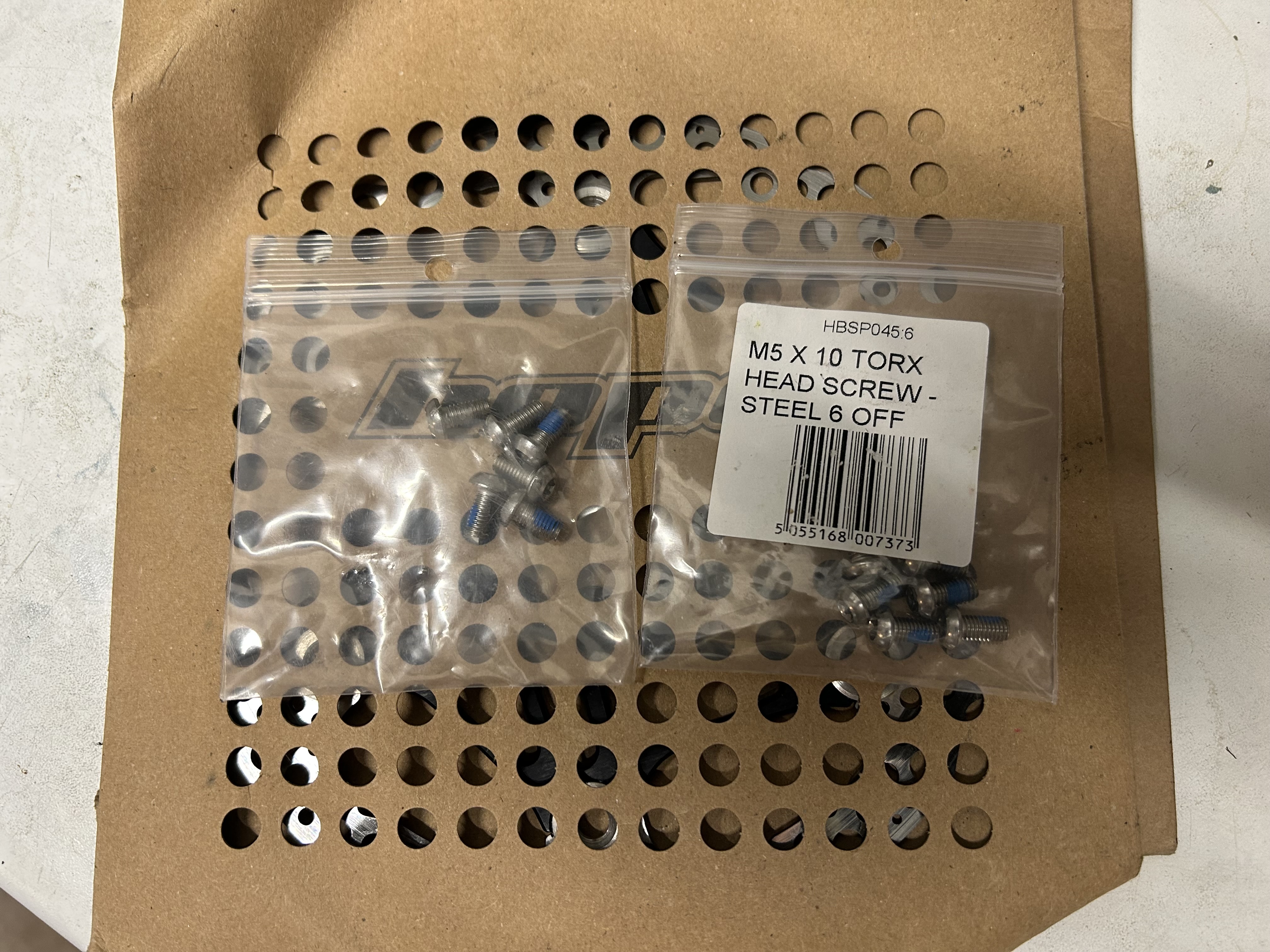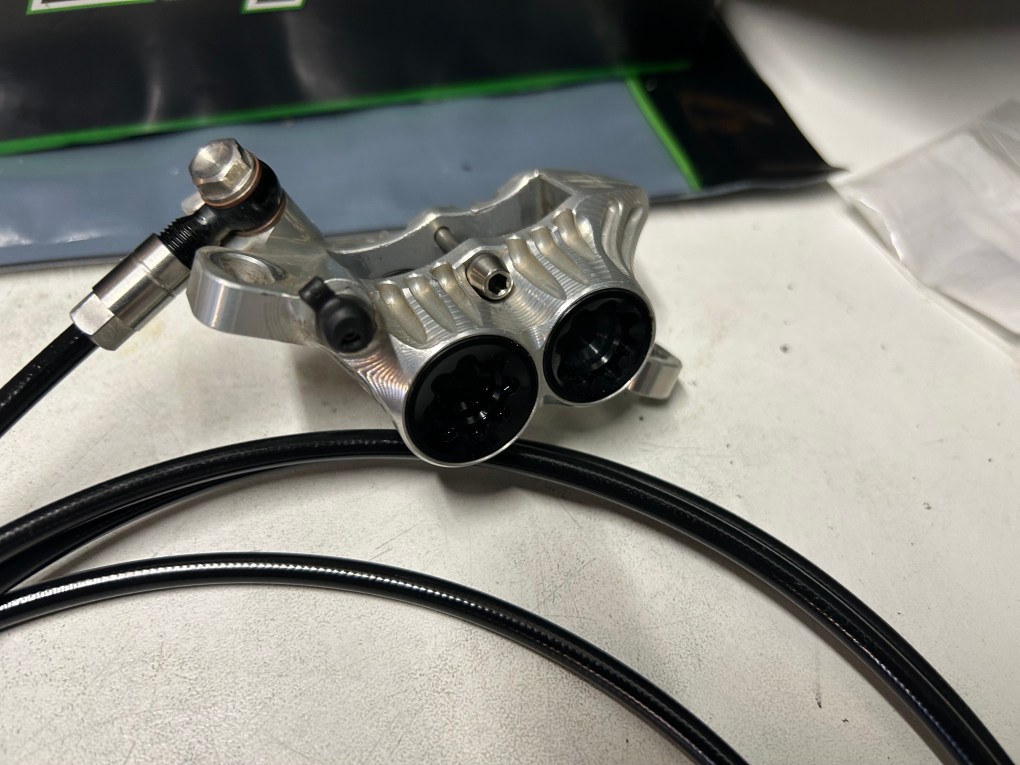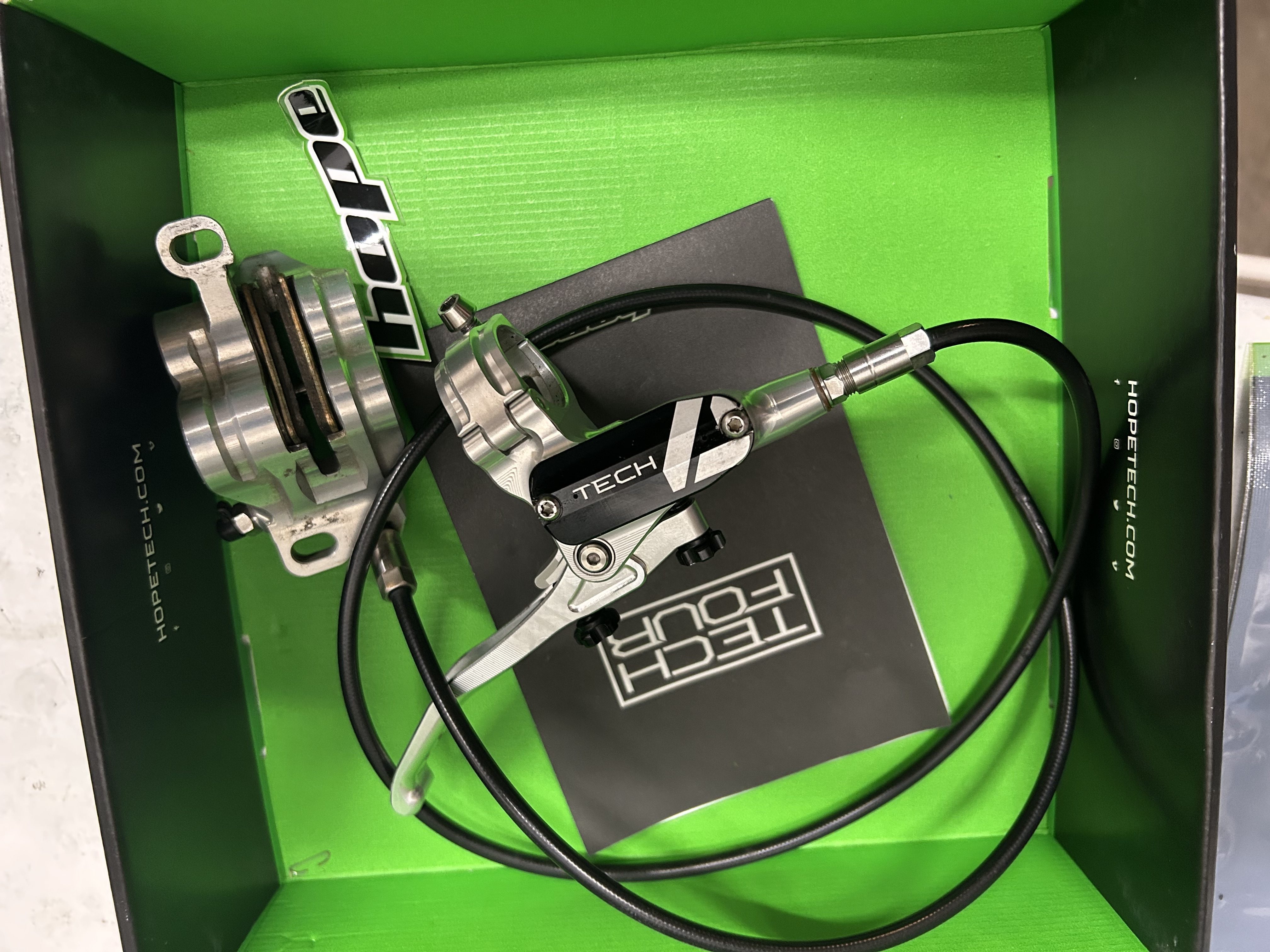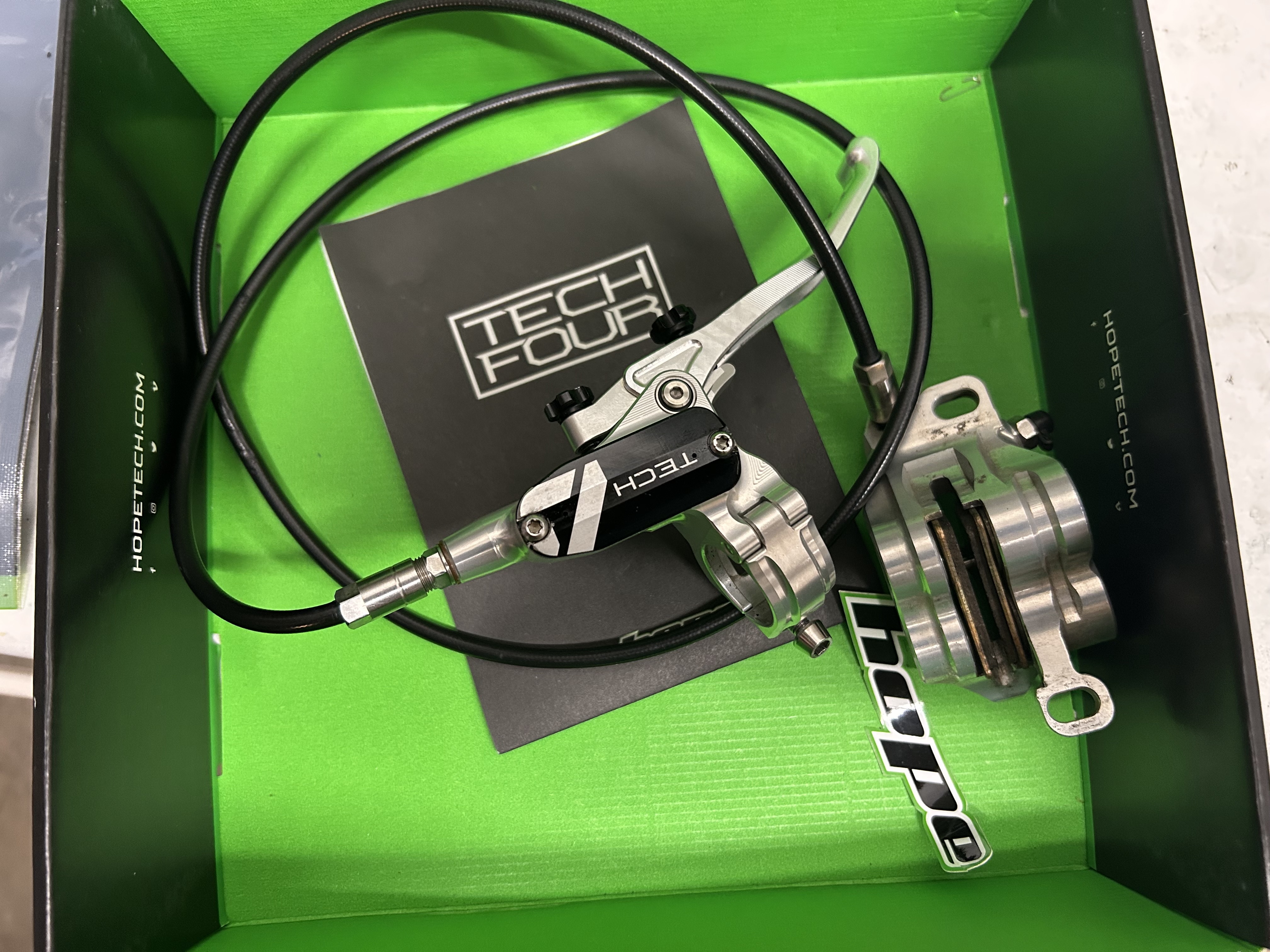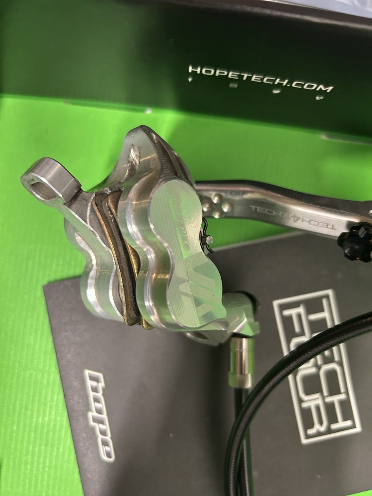 In excellent condition comes with many extras including:Gold Hope pads fitted, spare red and purple new Hope pads, spare master cylinder diagphrams, some lever rebuild parts, spare olives, rear hooe hose has been replaced with a brand new hose hence rear brake required full re-bleed so I have included an unopened bottle of Hope dot 5,1 brake fluid and a Hope bleed cup.Â