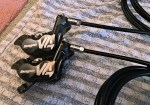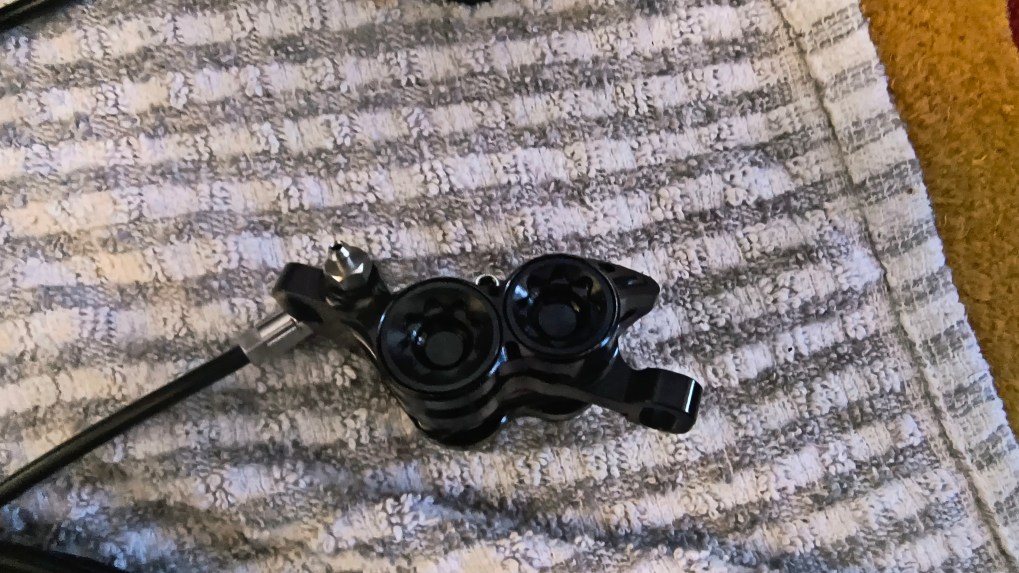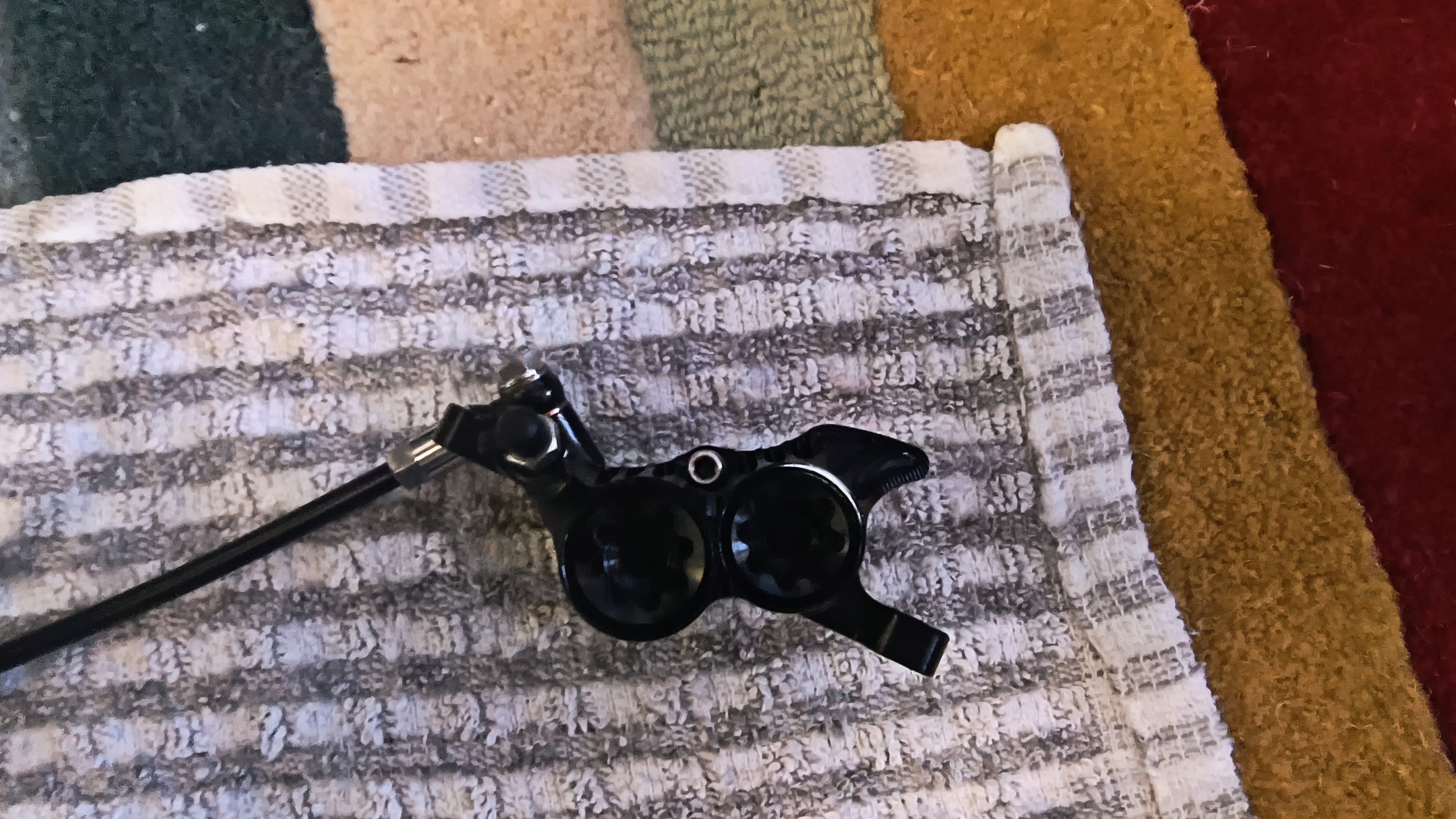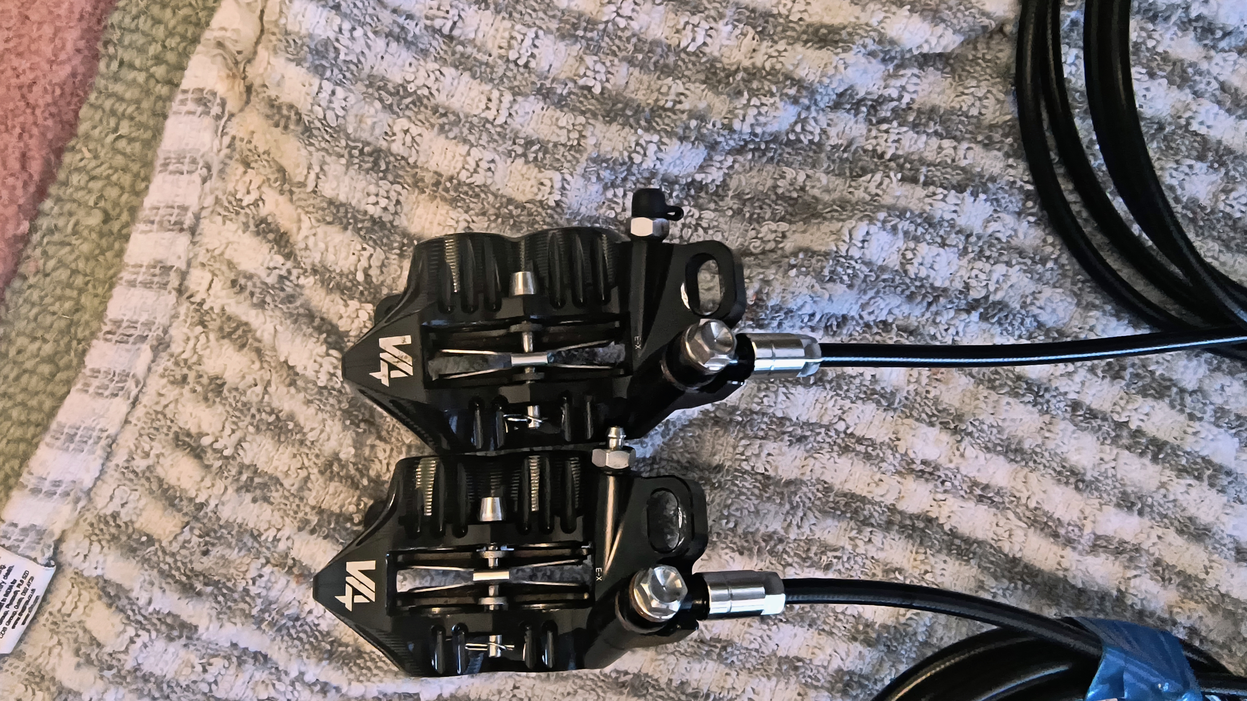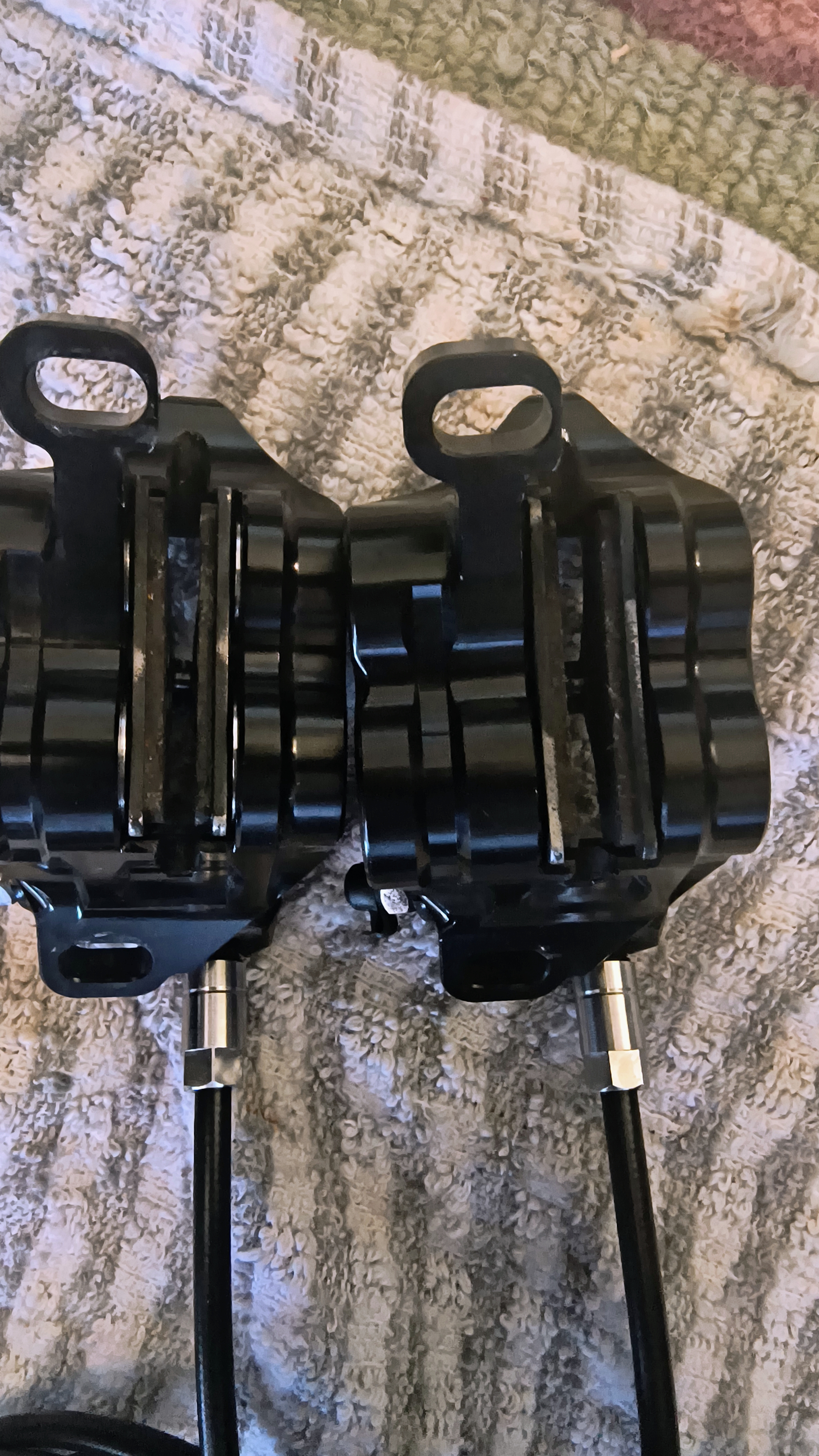 6 months old, in excellent condition, apart from slight wear to the anodising by one of the bore caps. Pads have plenty of life in them, and I’ll chuck in 2 pairs of unused Hope red pads.