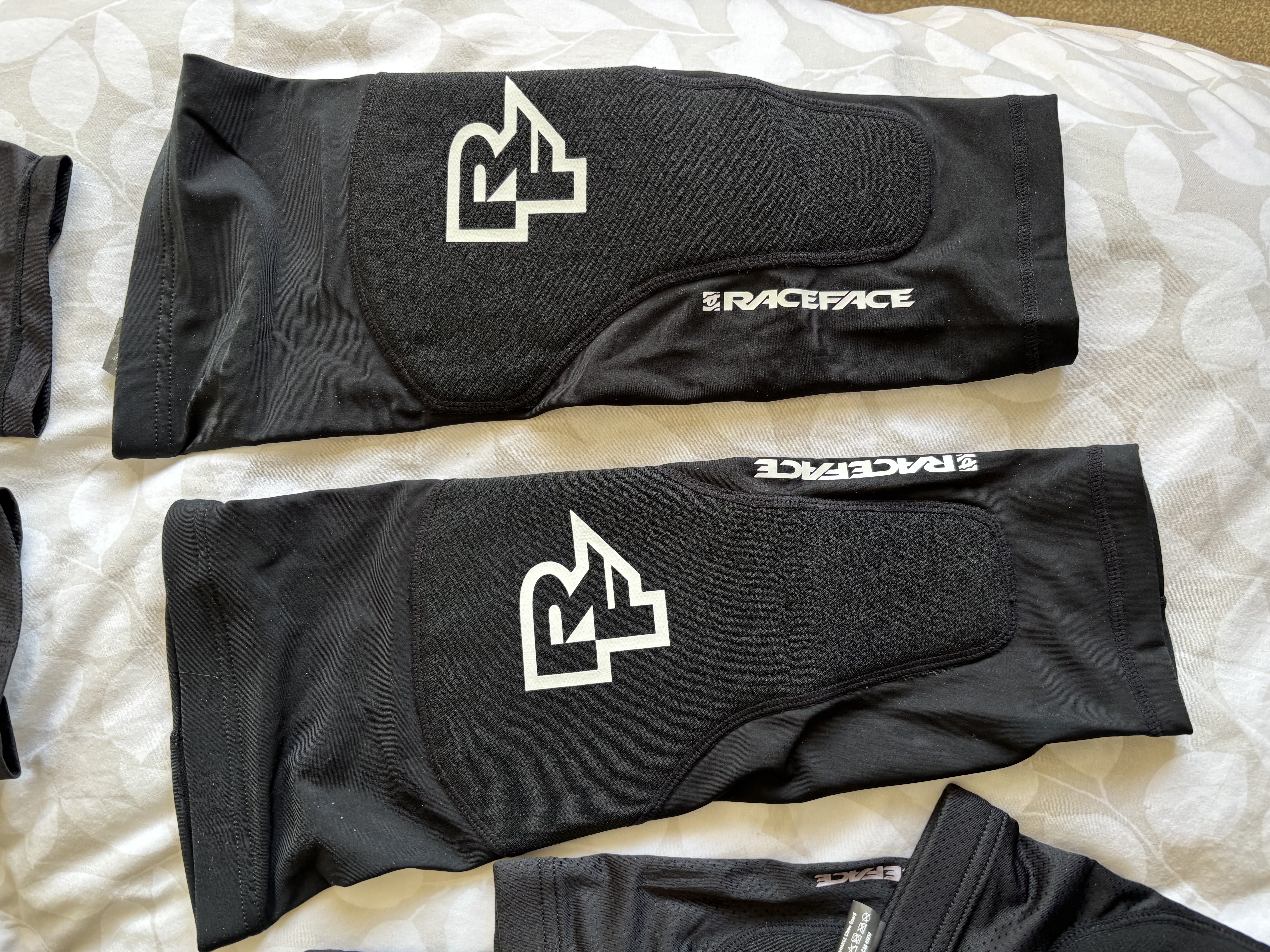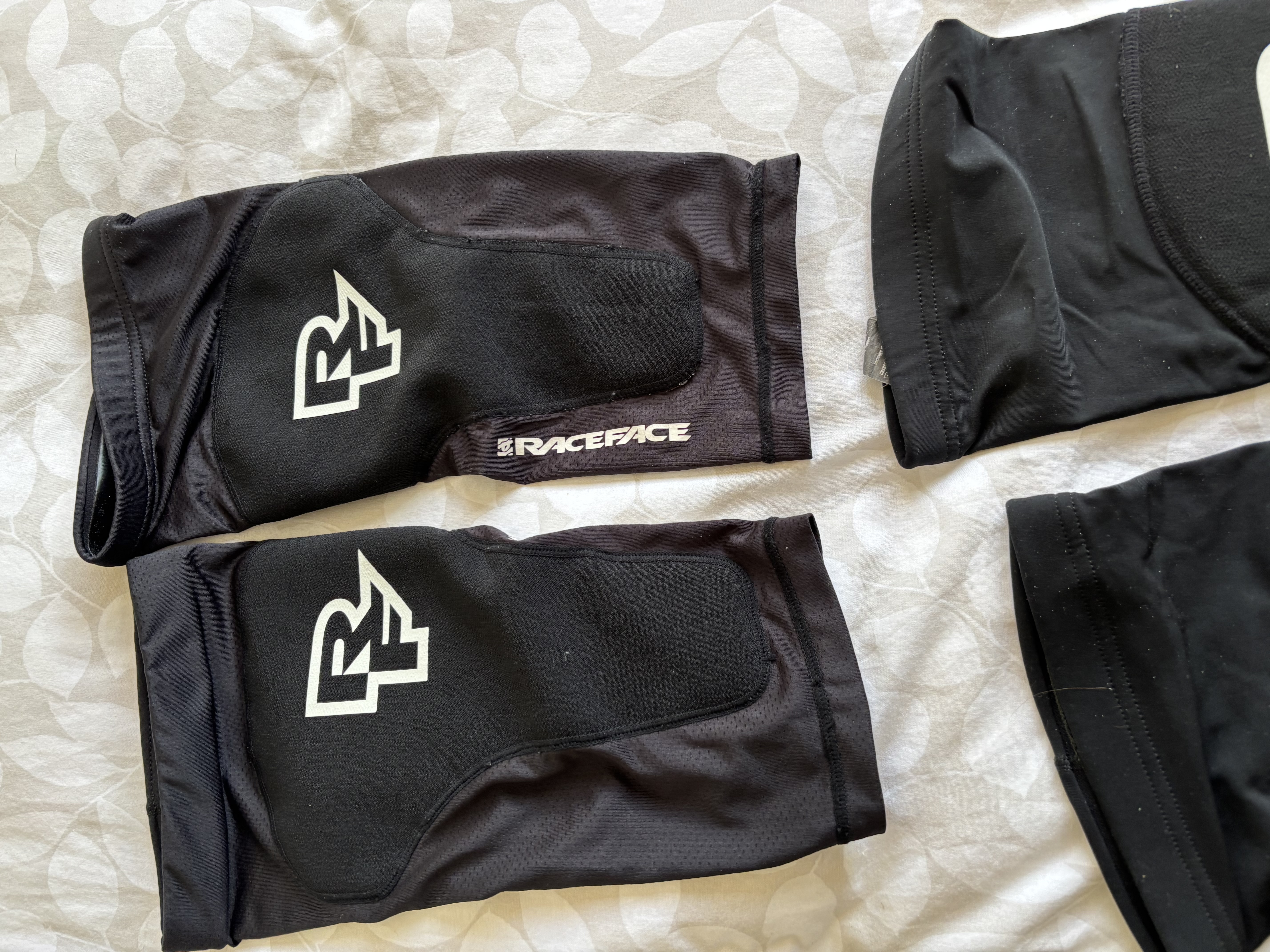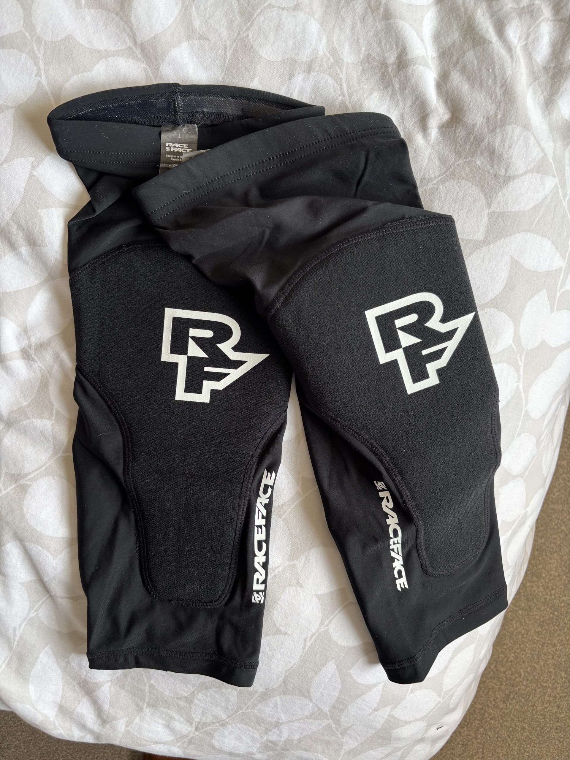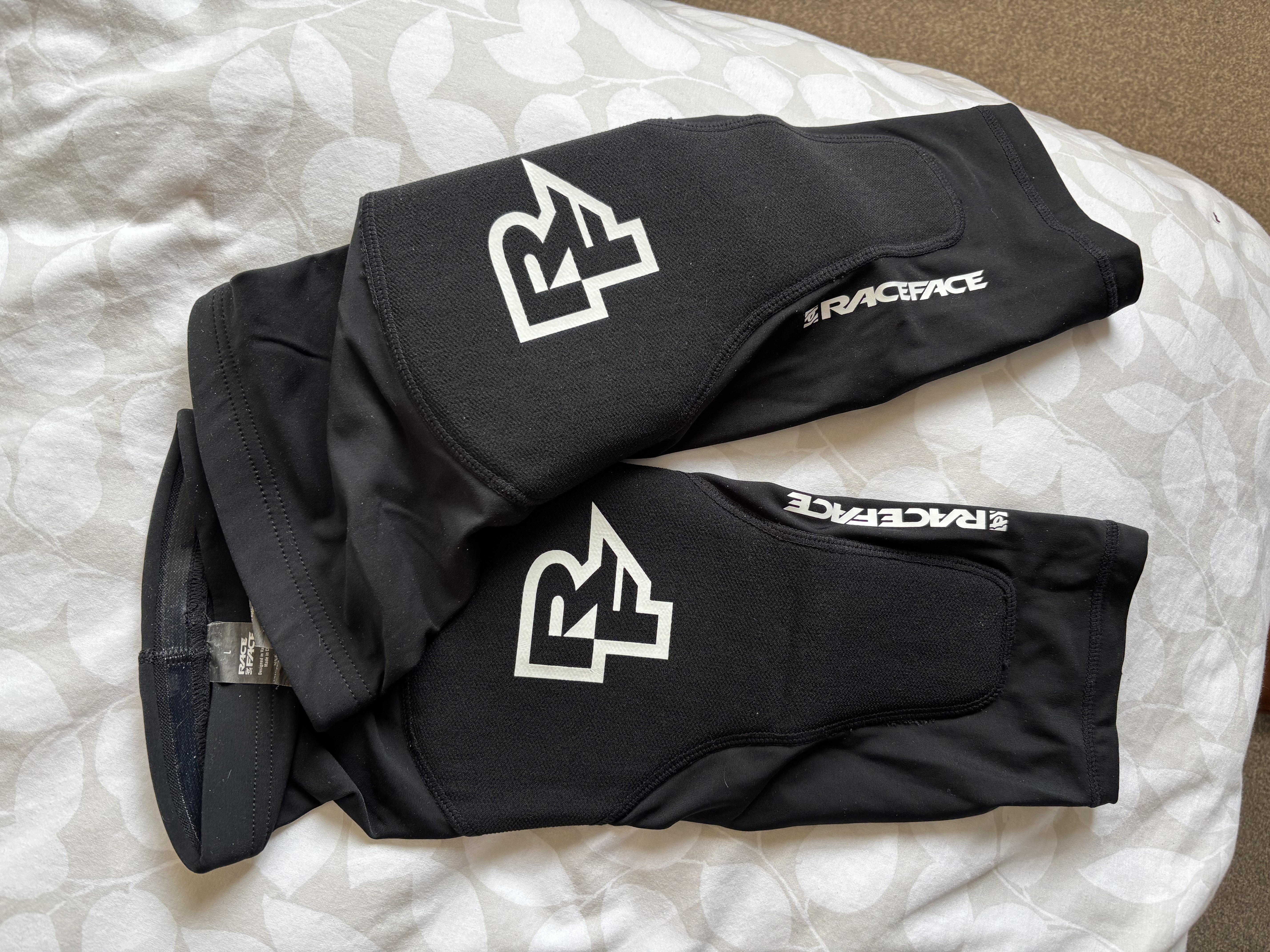 RaceFace charge knee sleeves, one regular, one thermal and longer, all size L, worn once. £20 a pair.