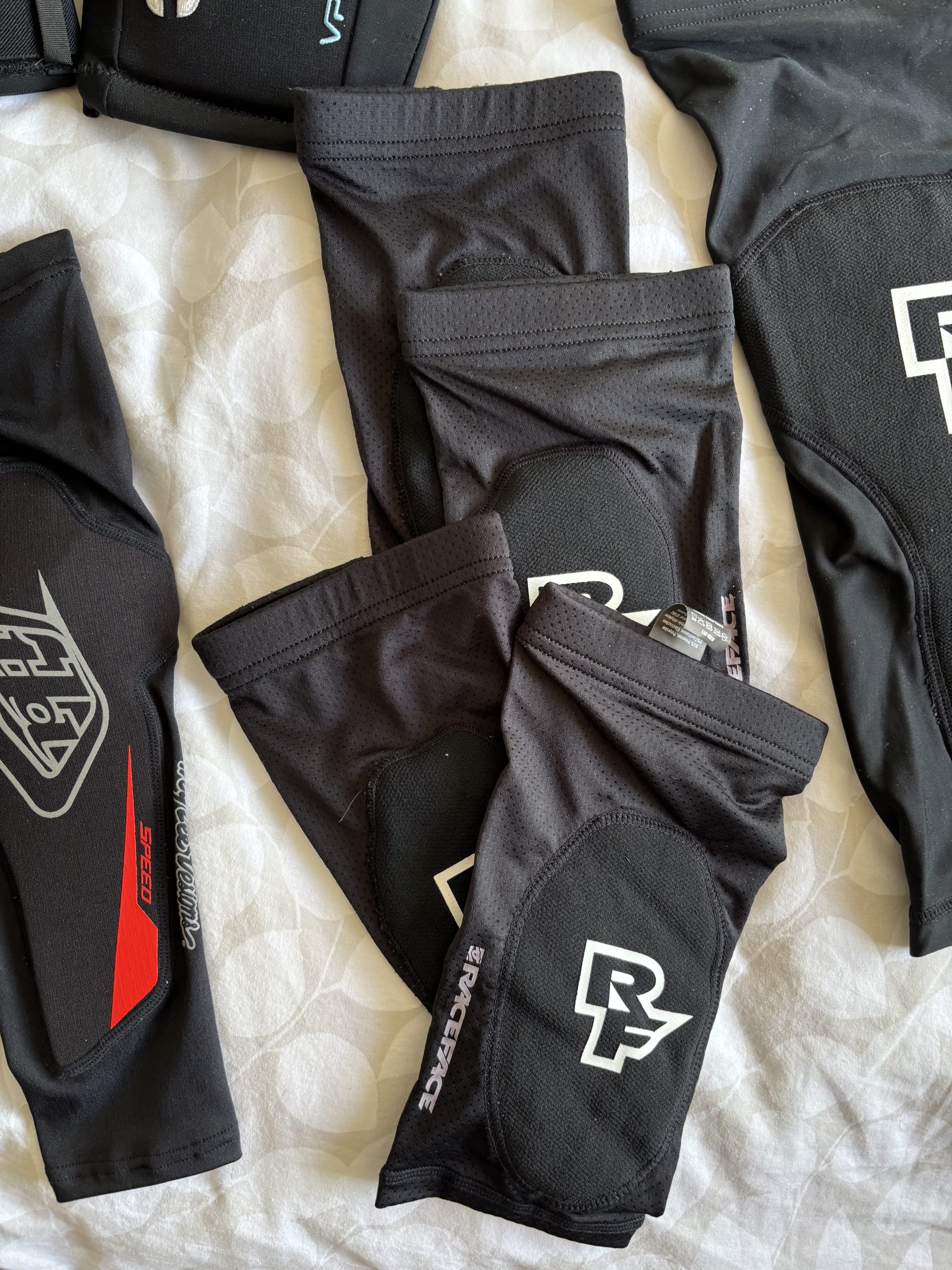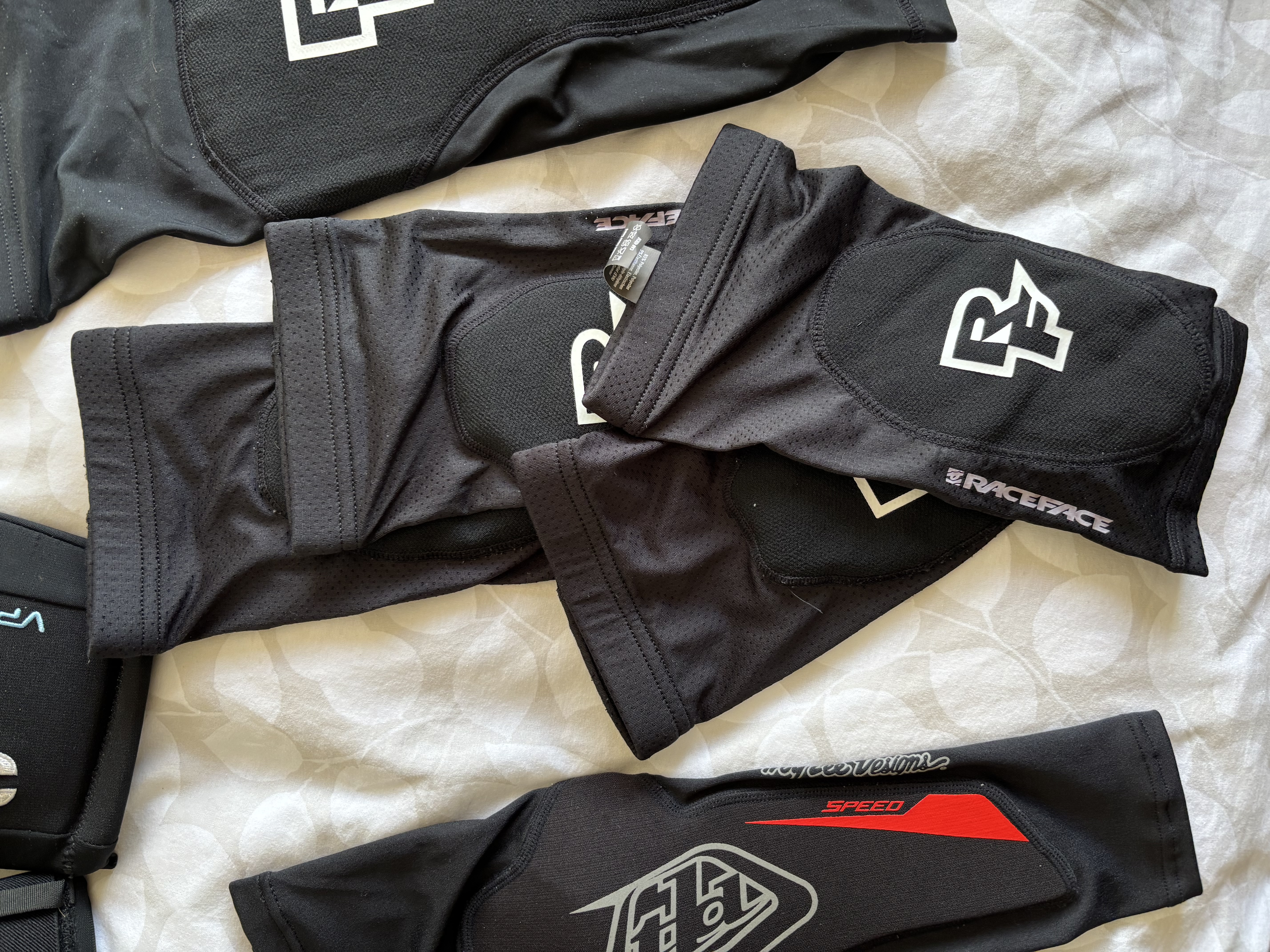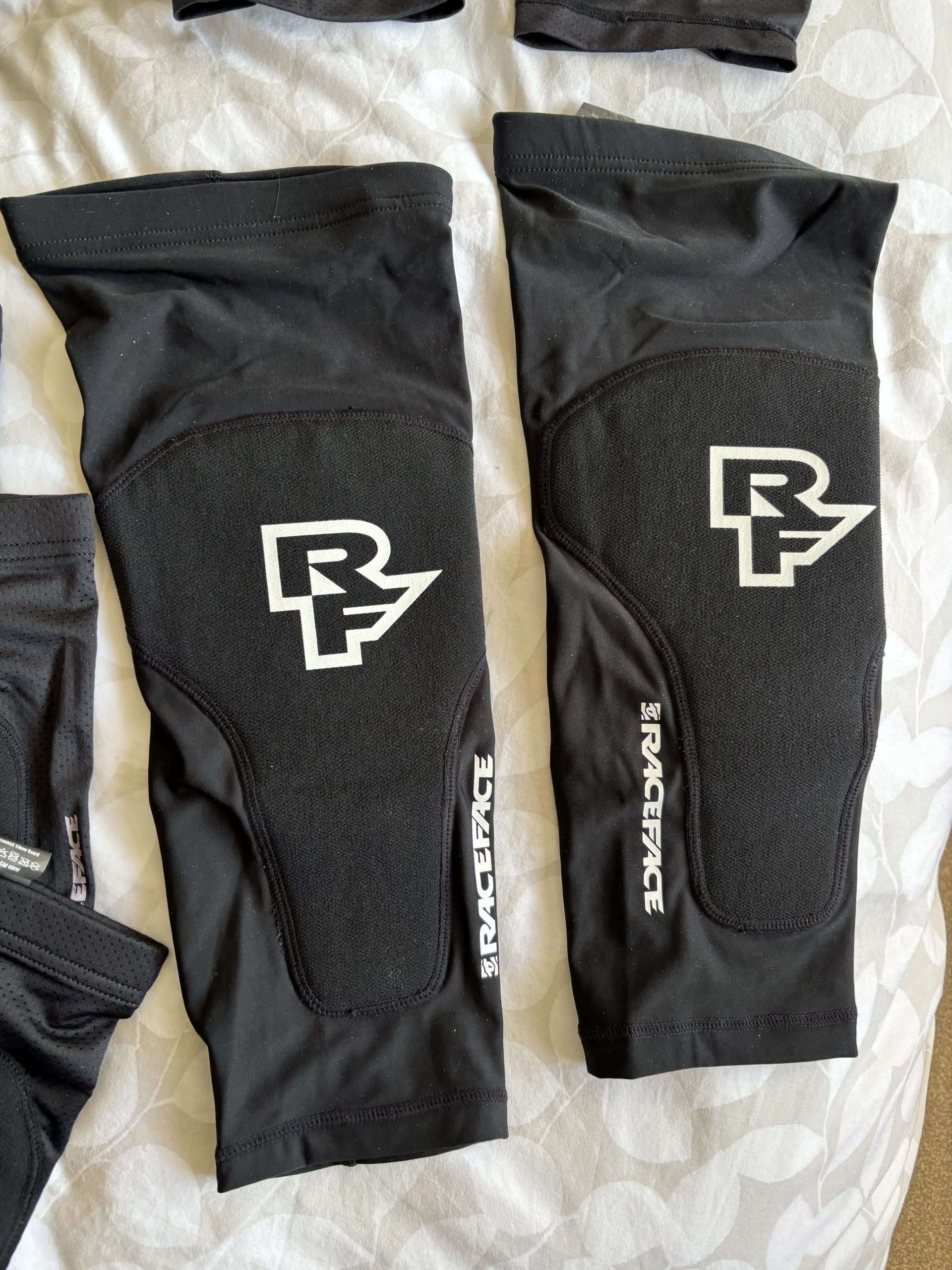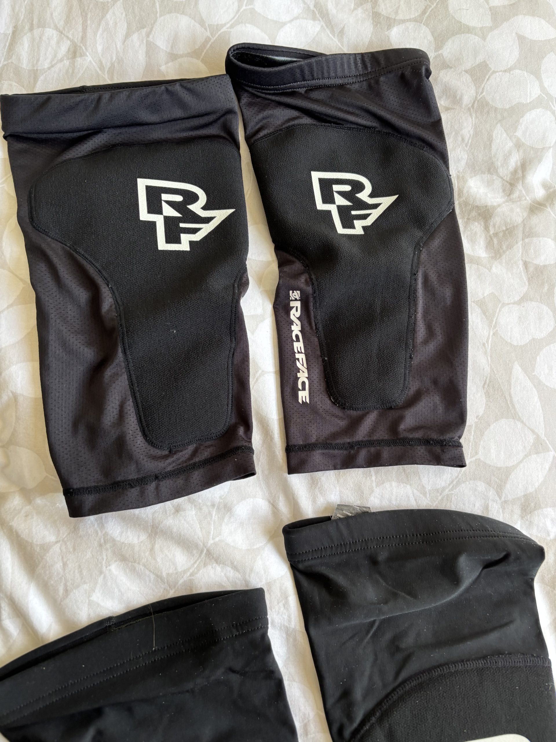 RaceFace charge knee sleeves, one regular, one thermal and longer, all size L, worn once. £20 a pair.