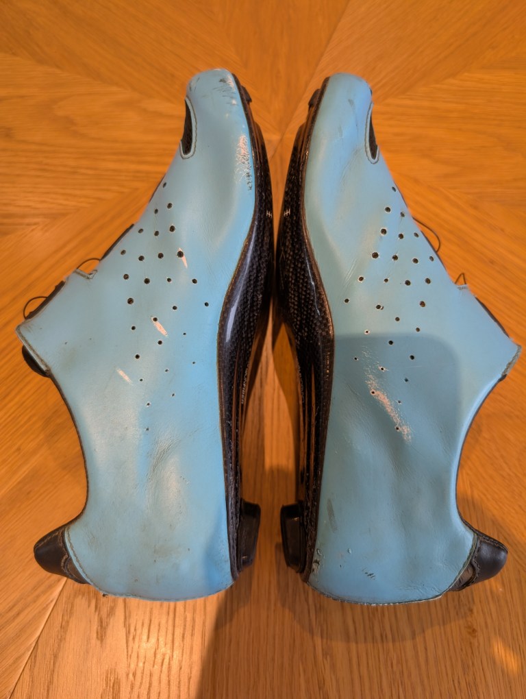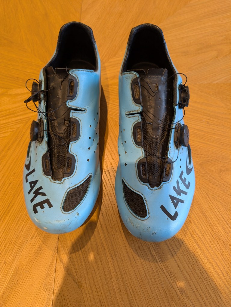 Lake CX237 in blue, size 45. To be honest, they are quite scuffed hence the price but they are very stiff and the twin boas operate as expected. Will do a good job on the turbo or for winter under overshoes.