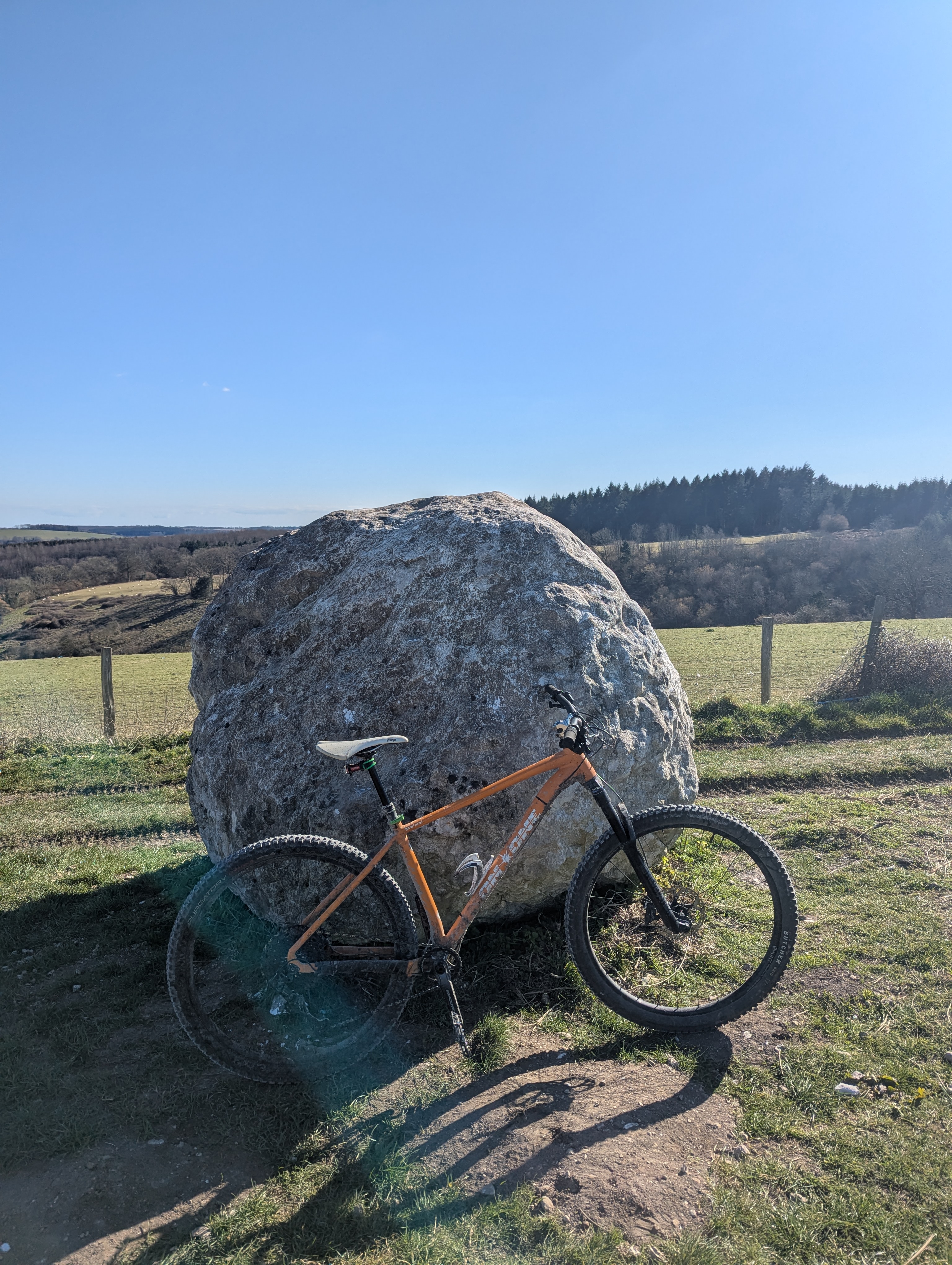 Large Orange On One Scandal. Fitted with random green seatclamp, Hope headset and bottom bracket. Fair number of scratches and scrapes as i bought it 2nd hand but a great frame. I will leave the internally routed inners in – £1o0.00 ONO