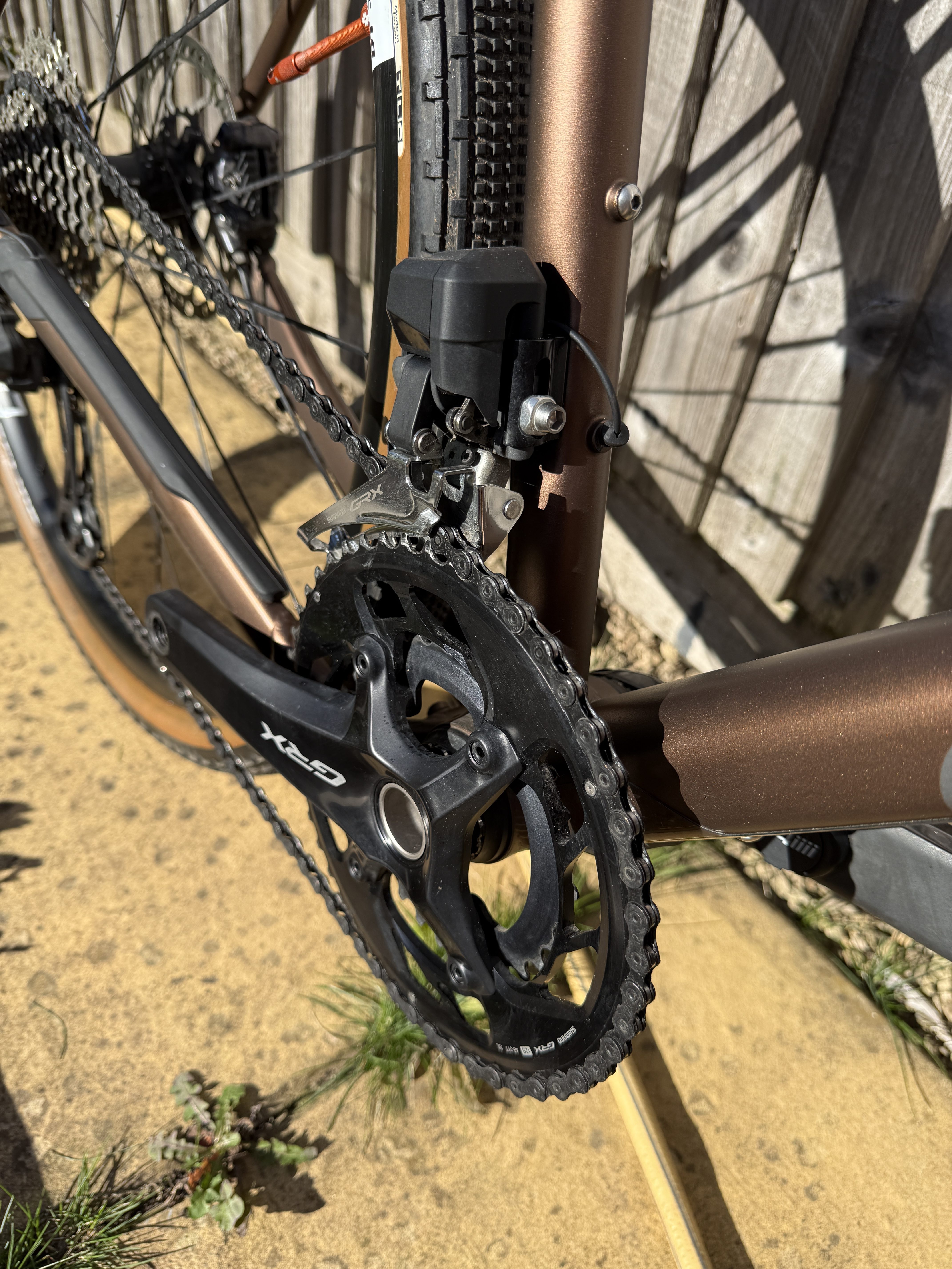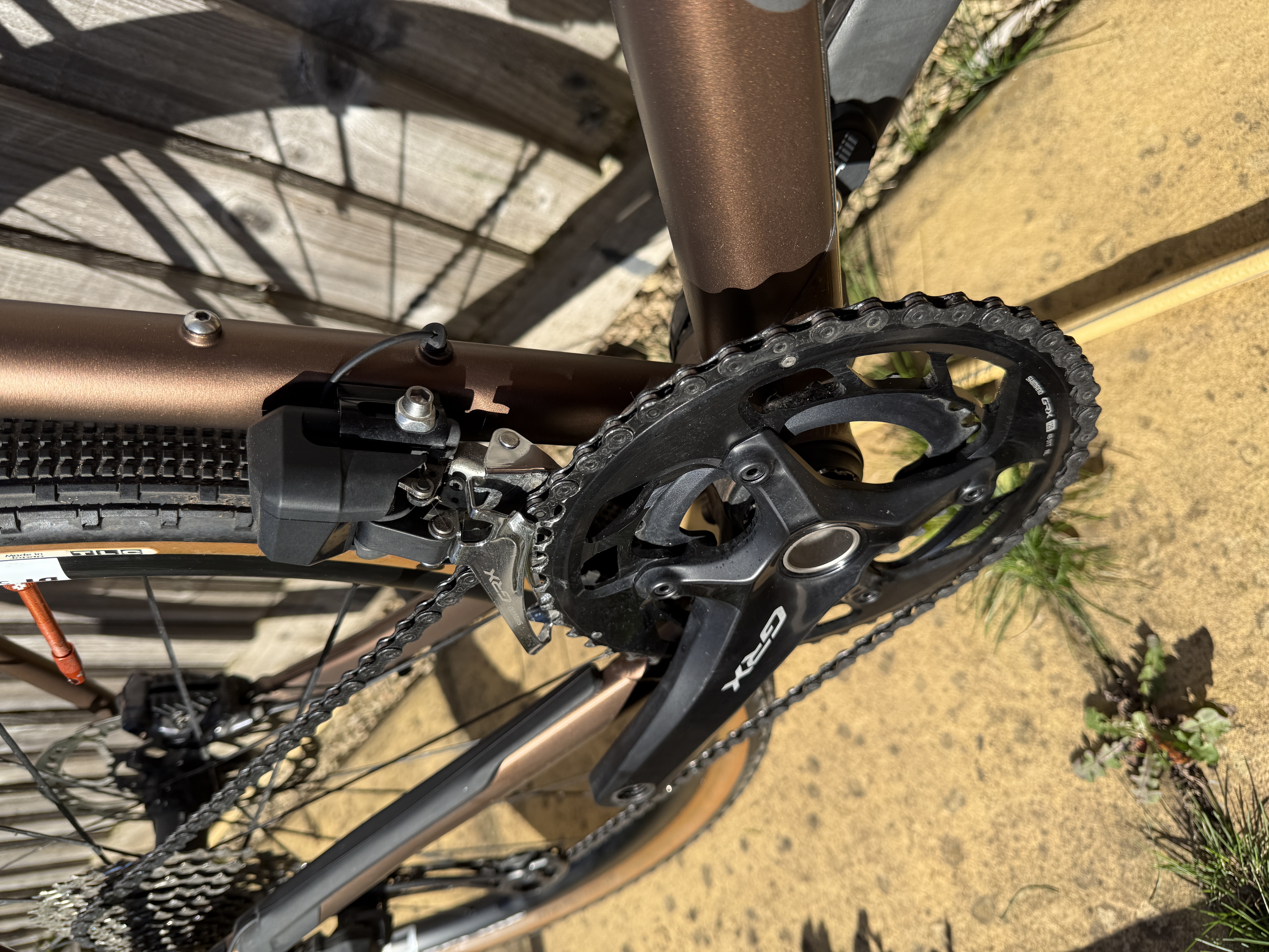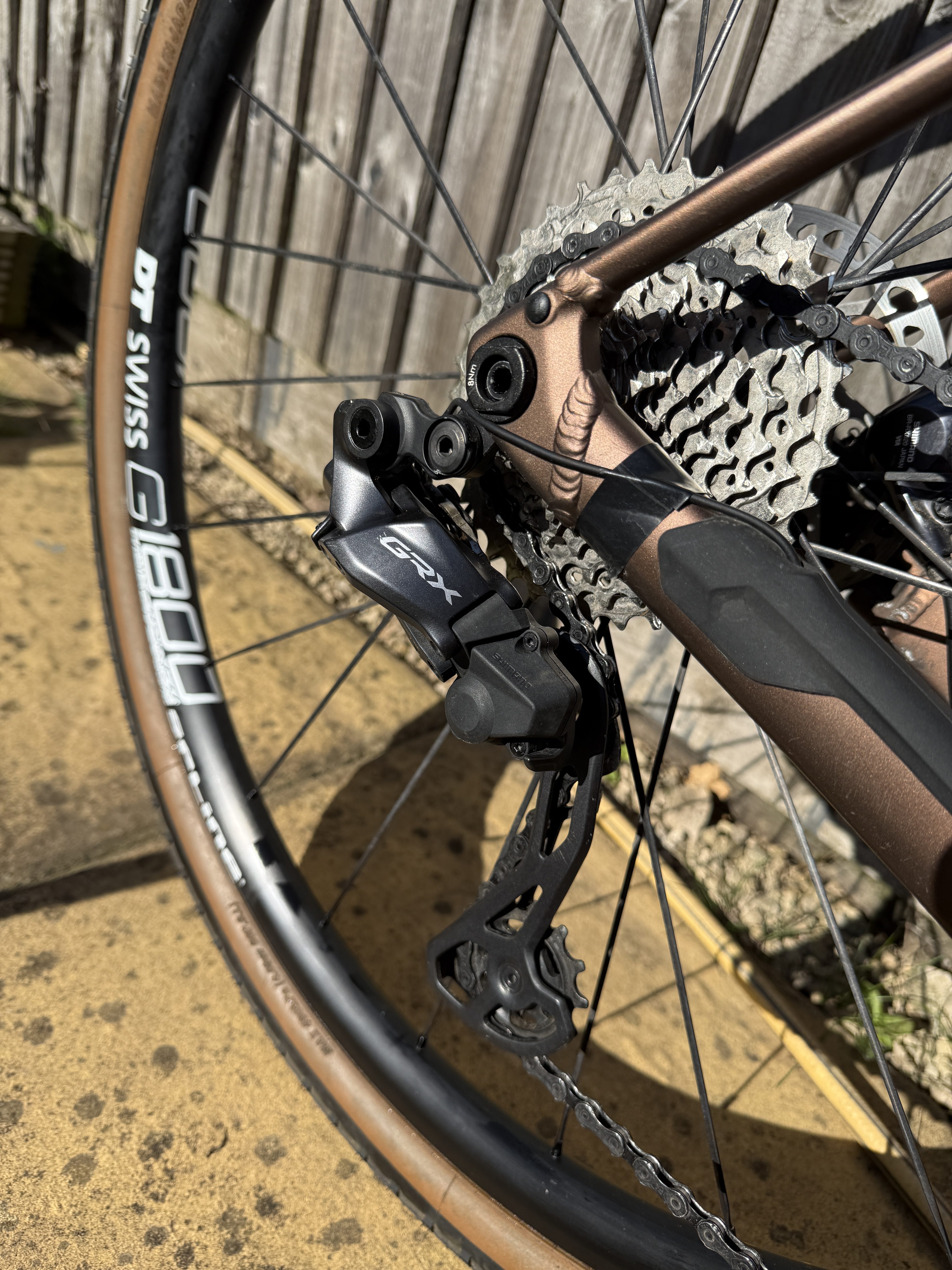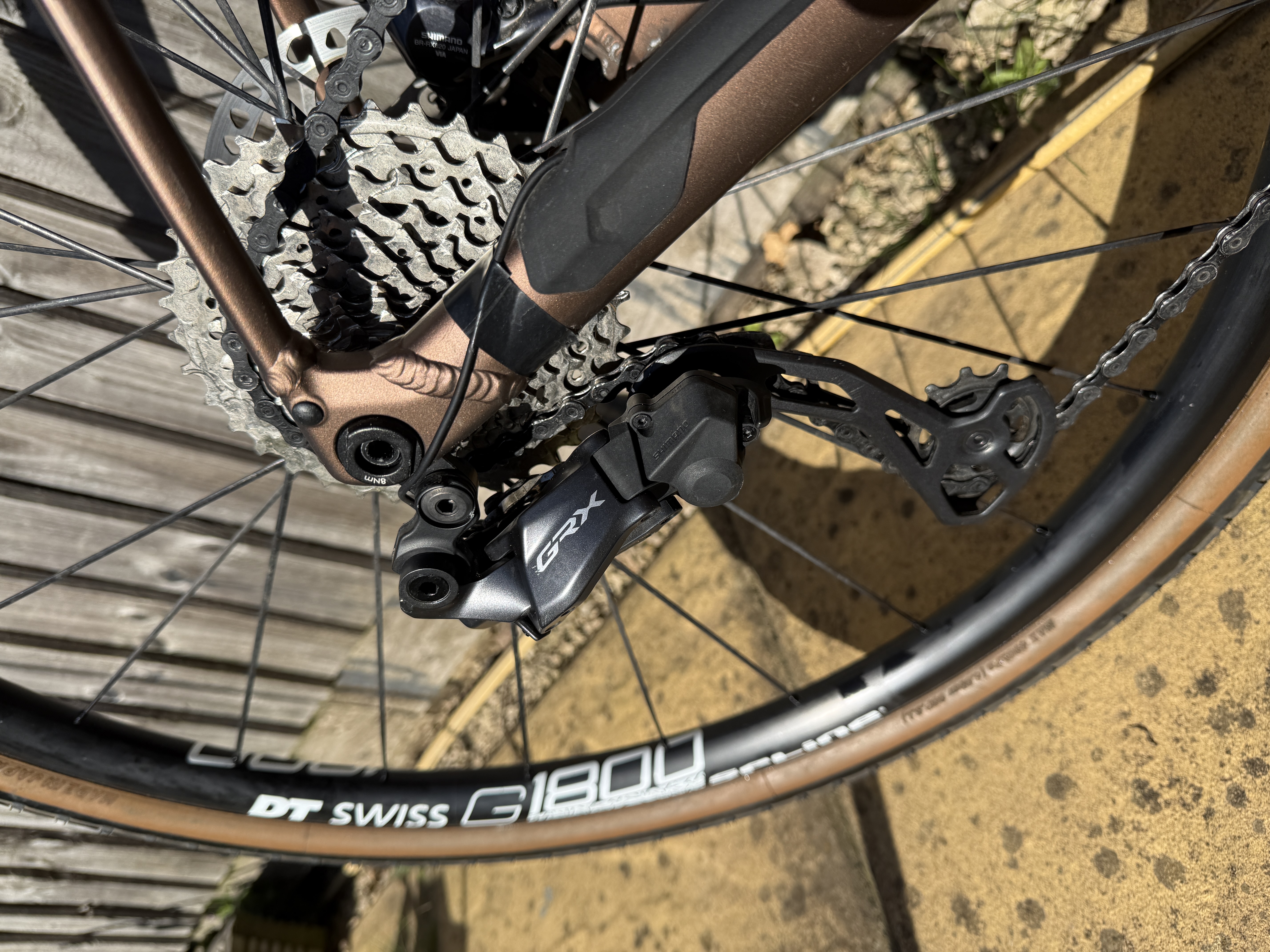 – Shimano GRX 2 x 12 Di2 (48-31 up front). 2024 model which is wireless for the shifters. The derailleurs are run from a battery mounted in the seatpost. The frame isnt technically Di2 compatible but I have put the wire through the rear bottle cage mount hole.