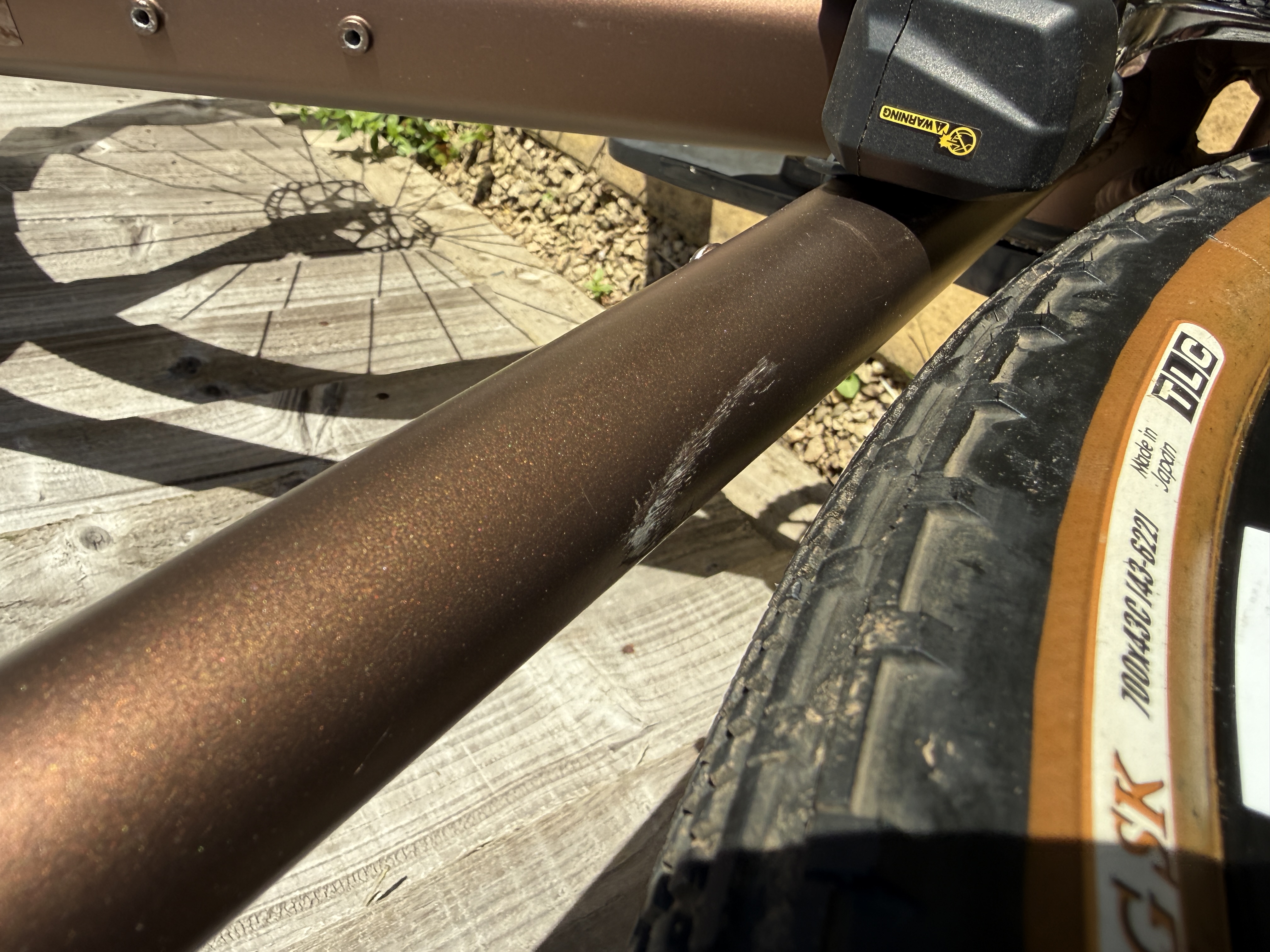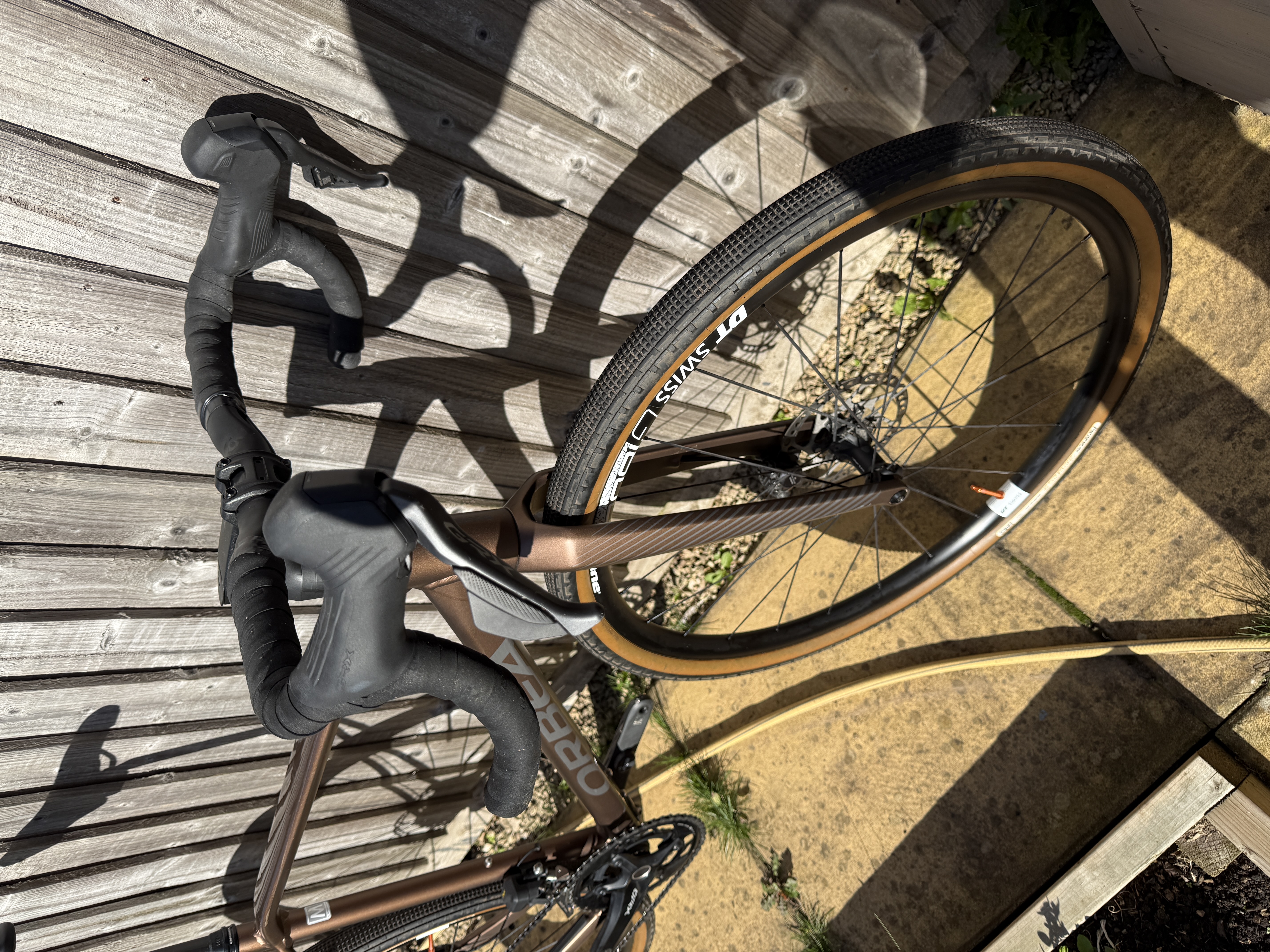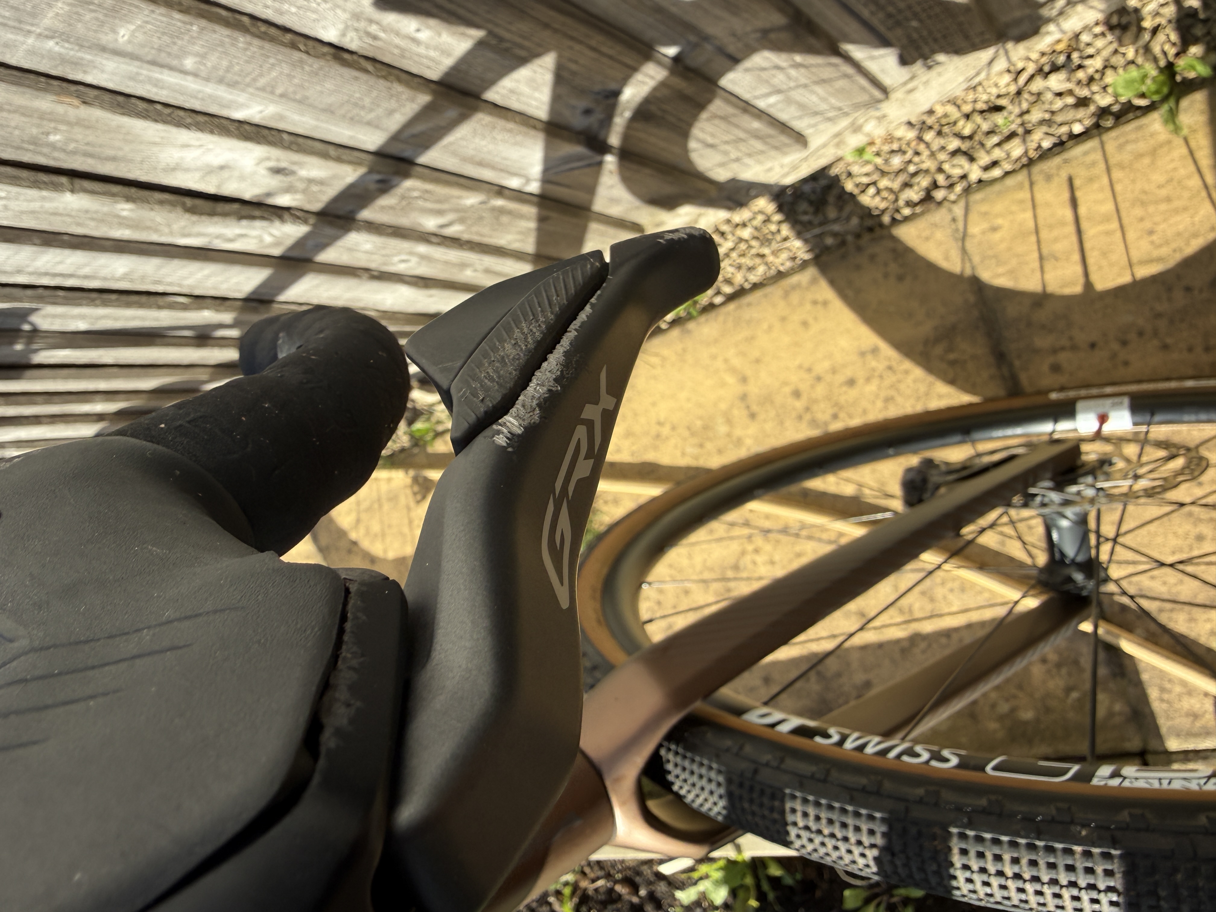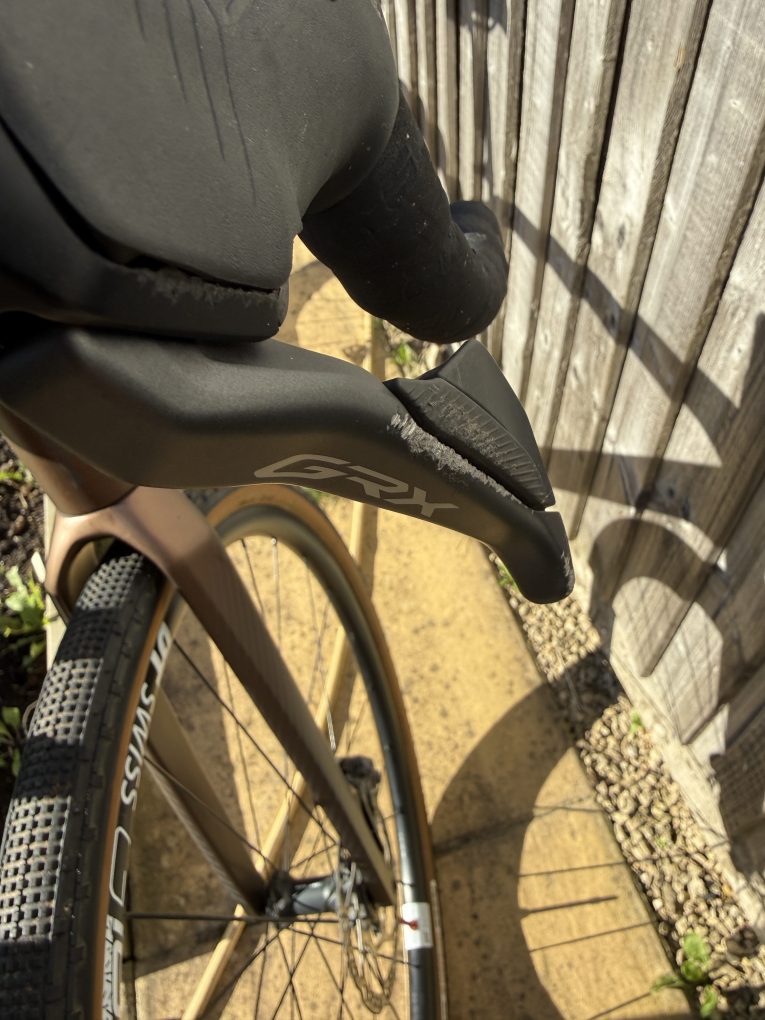 – Shimano GRX 2 x 12 Di2 (48-31 up front). 2024 model which is wireless for the shifters. The derailleurs are run from a battery mounted in the seatpost. The frame isnt technically Di2 compatible but I have put the wire through the rear bottle cage mount hole.