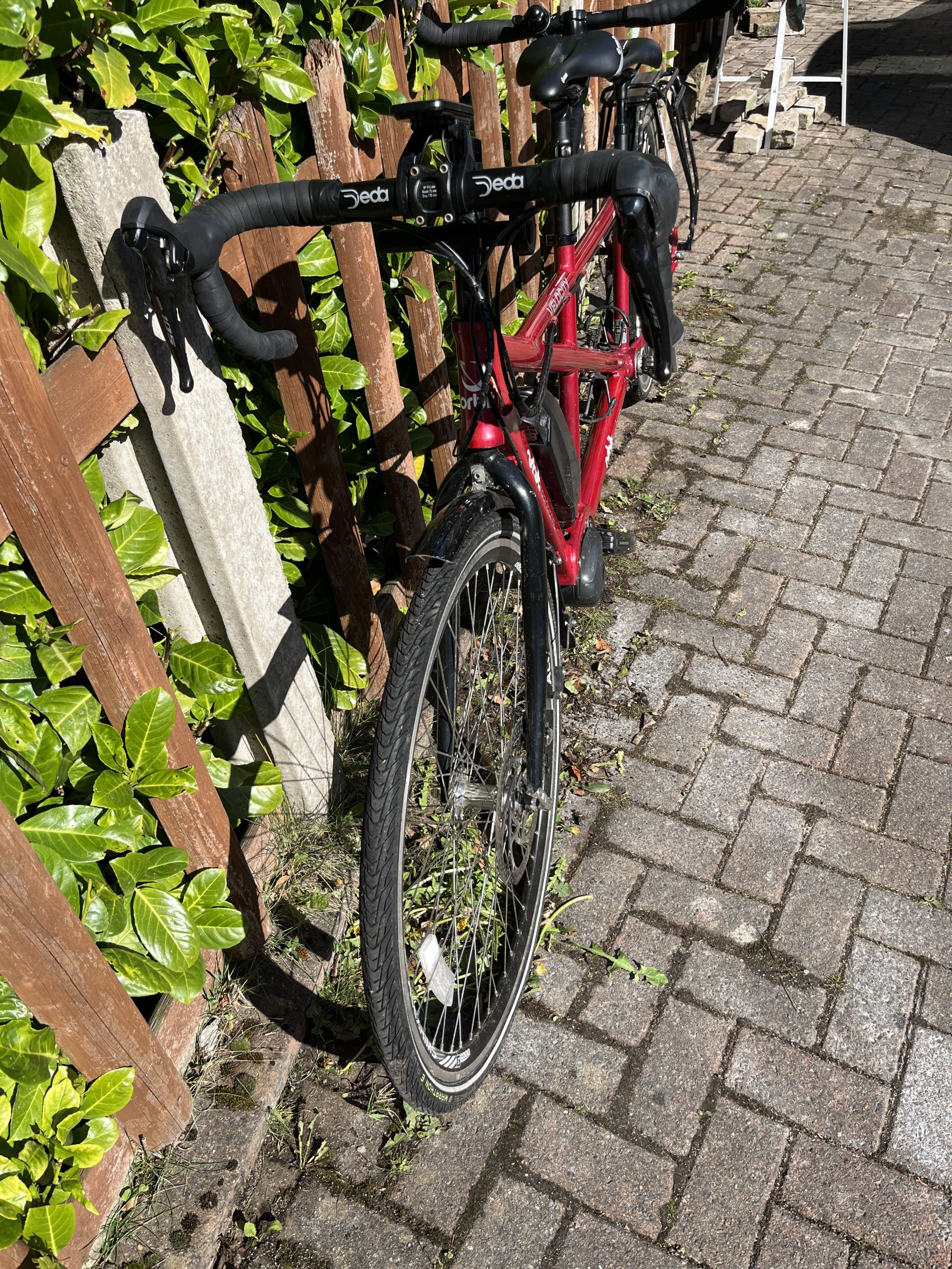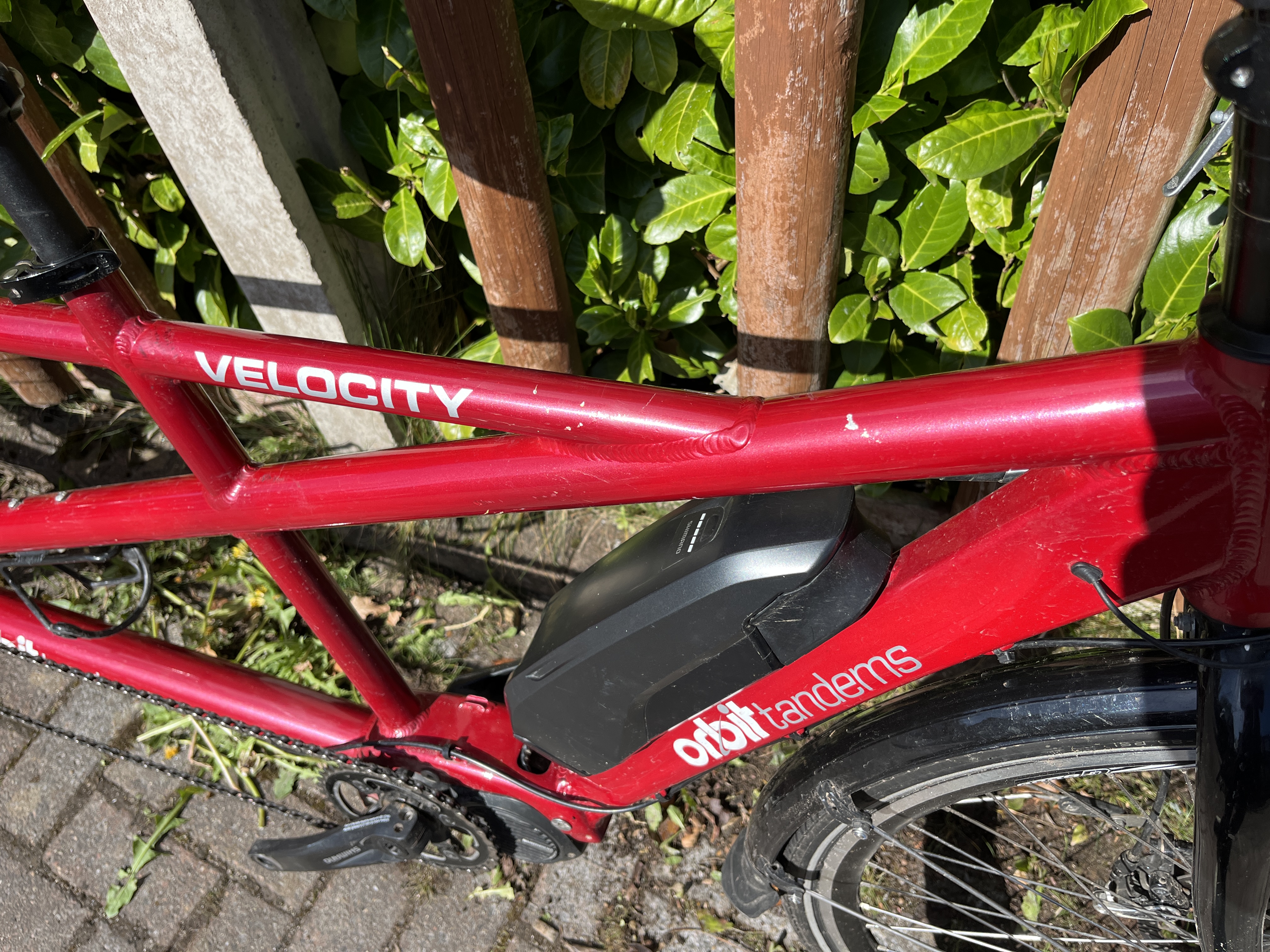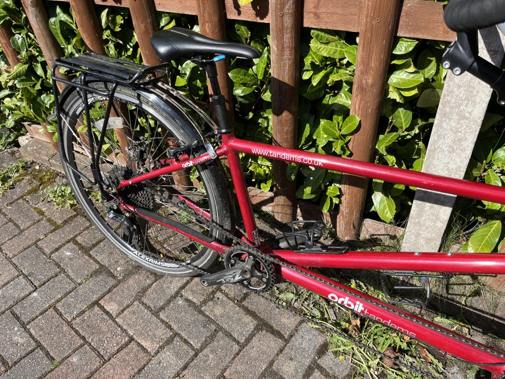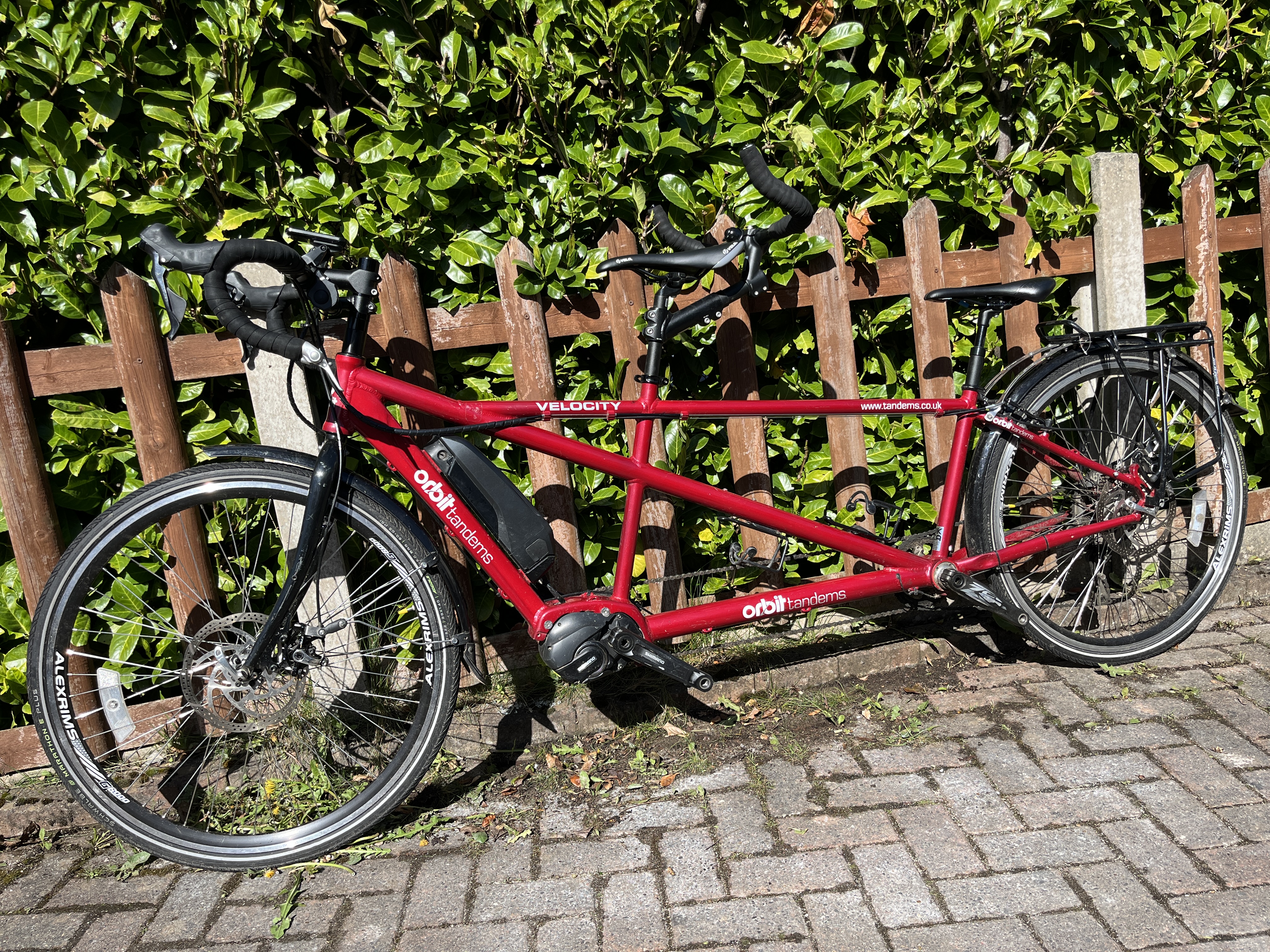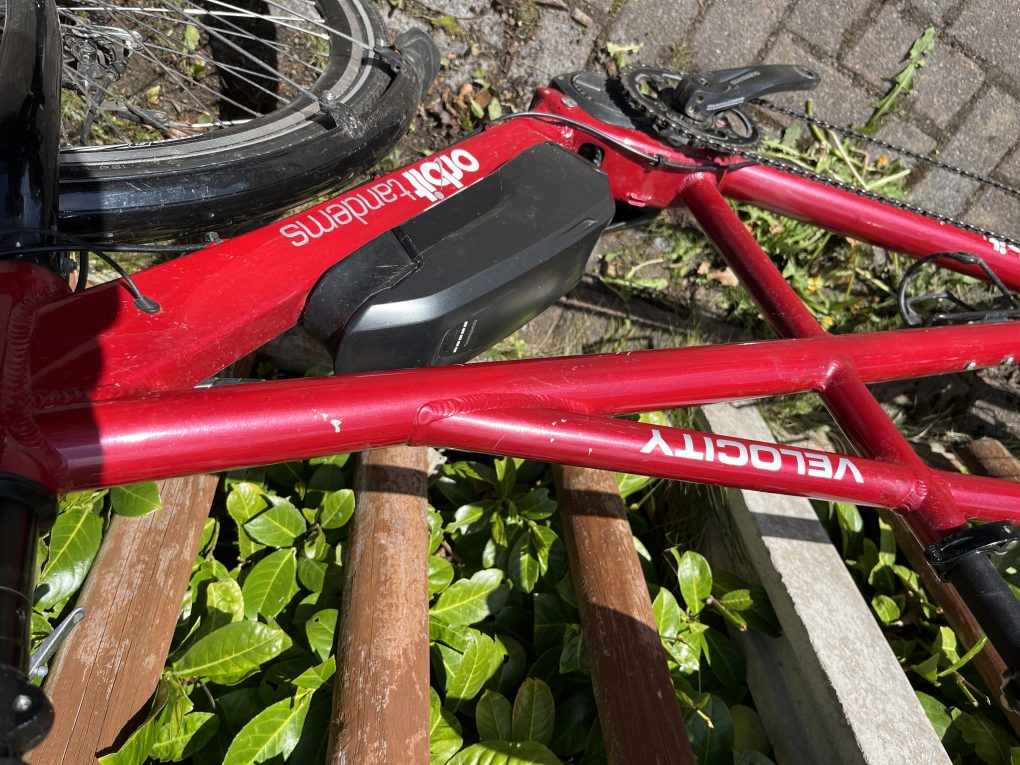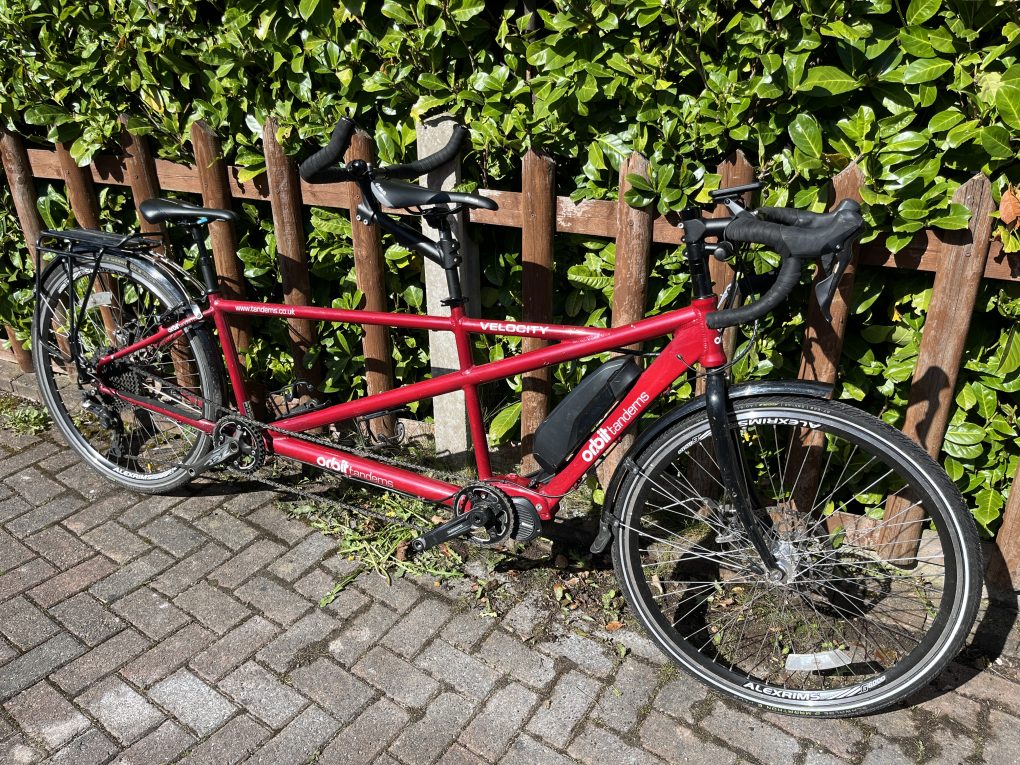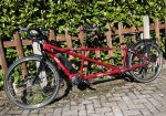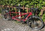 Orbit Velocity Electric Assist Tandem in 20/16” – sized for 5’9″ captain and 5’4″ stoker in the photos, with plenty of room for adjustment either way. It’s a great bike, but we have found that we prefer a flat bar tandem so this needs to find a new home