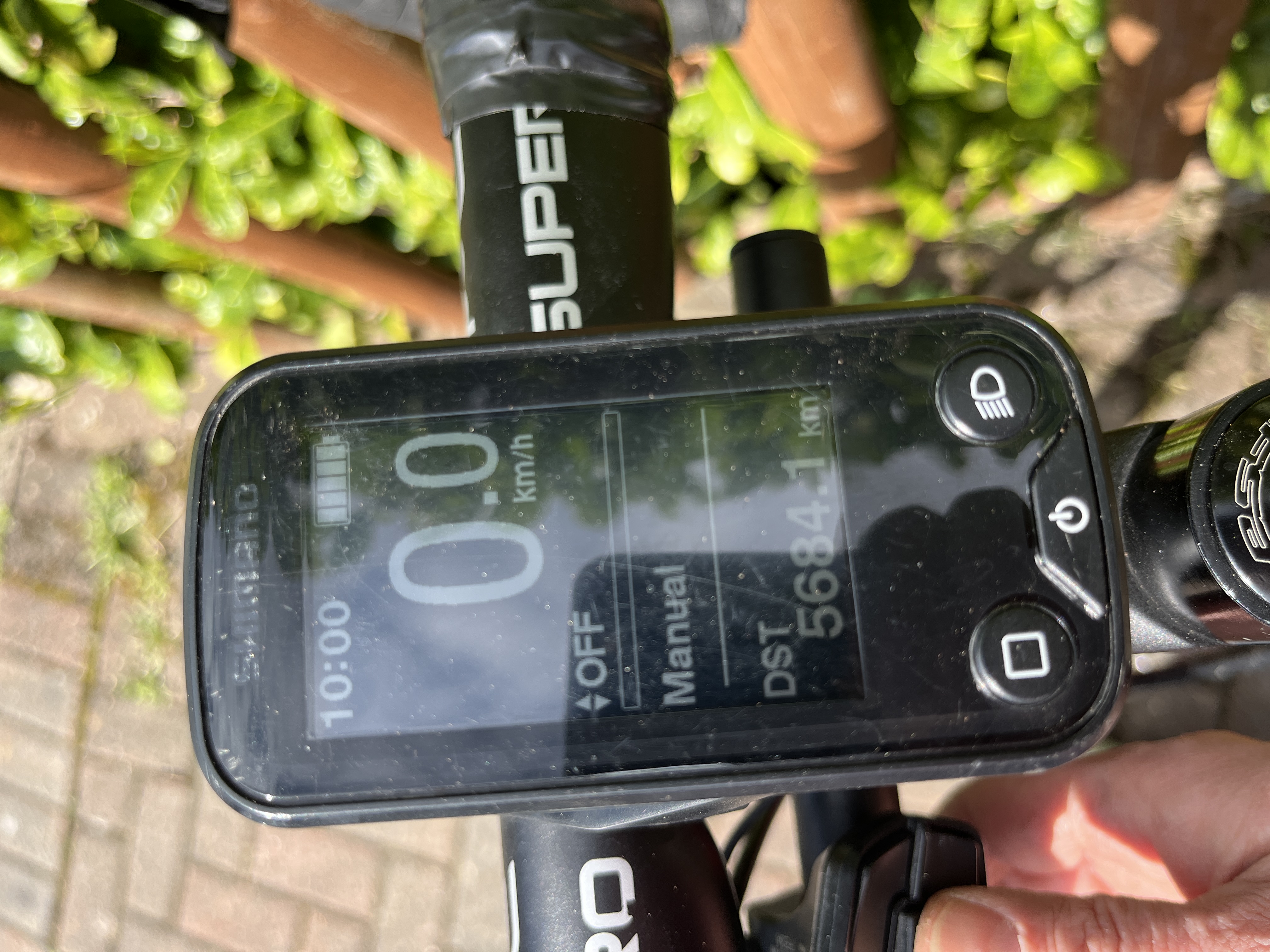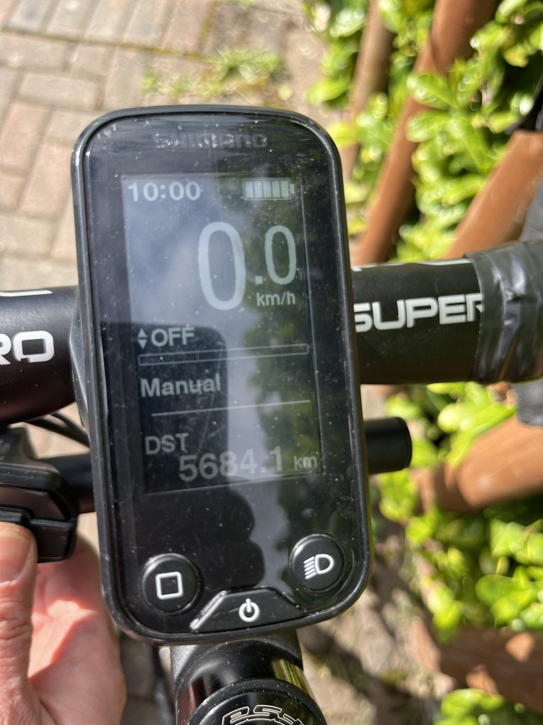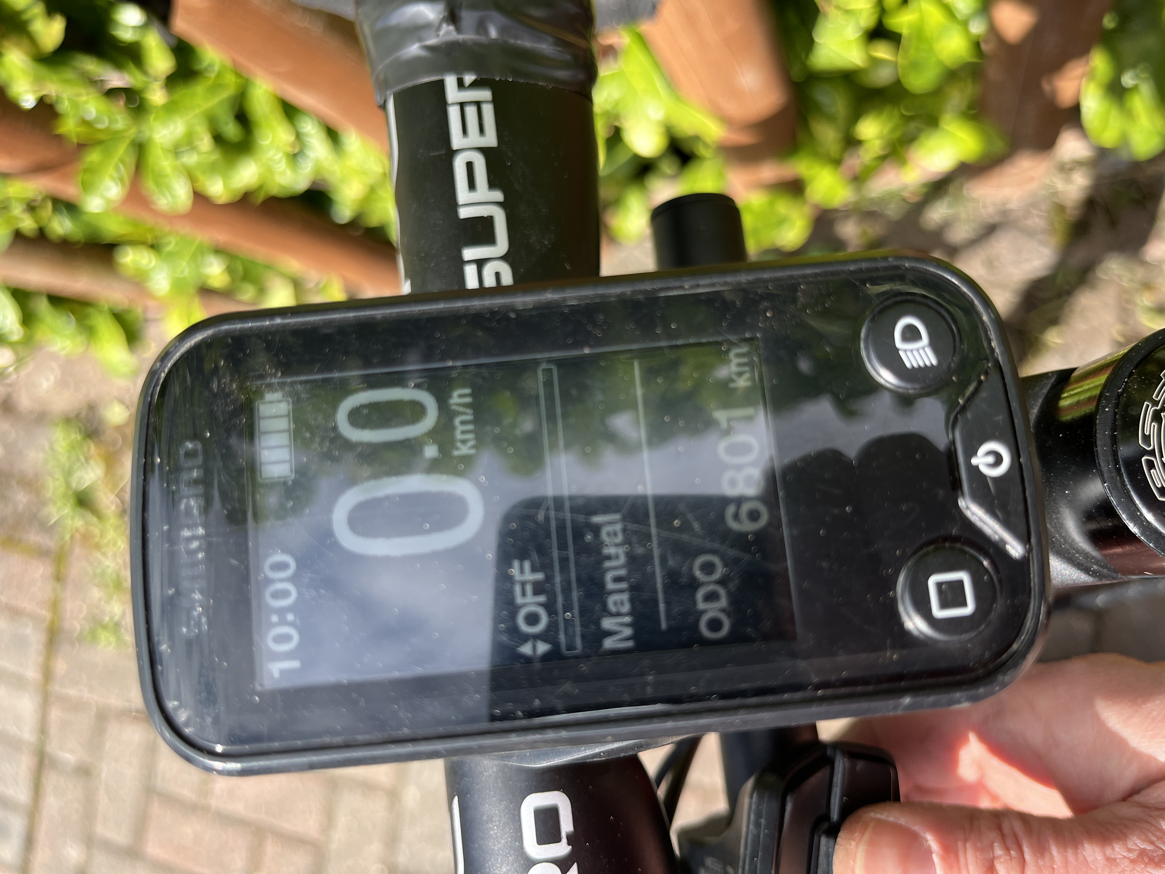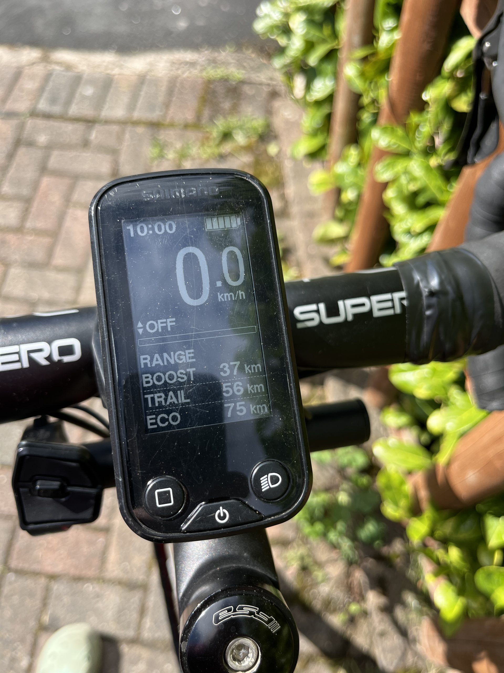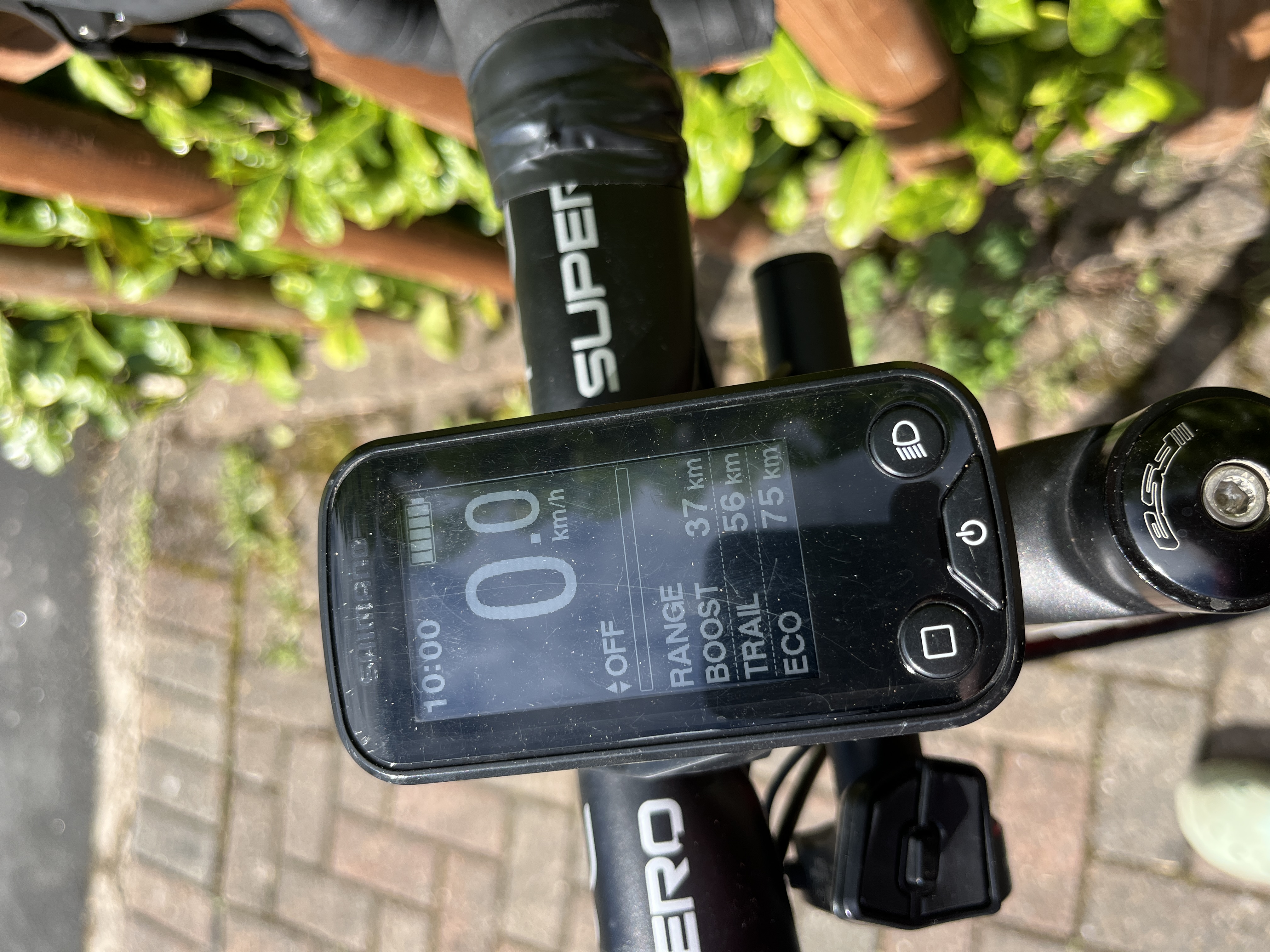 110mm stem Motor control on a little switch on a bar attached to steerer tube. Easy to change with thumb while on tops of bars.