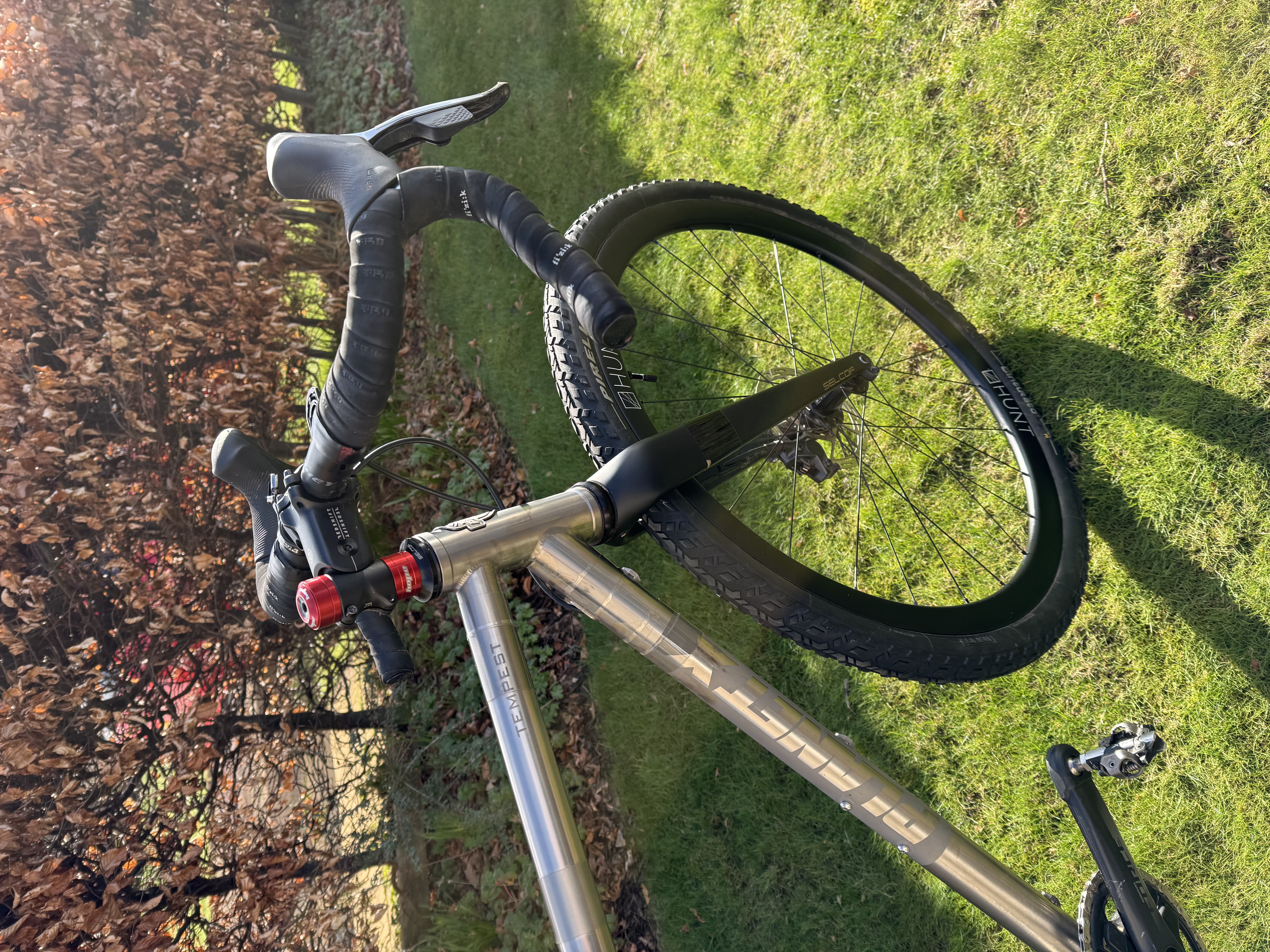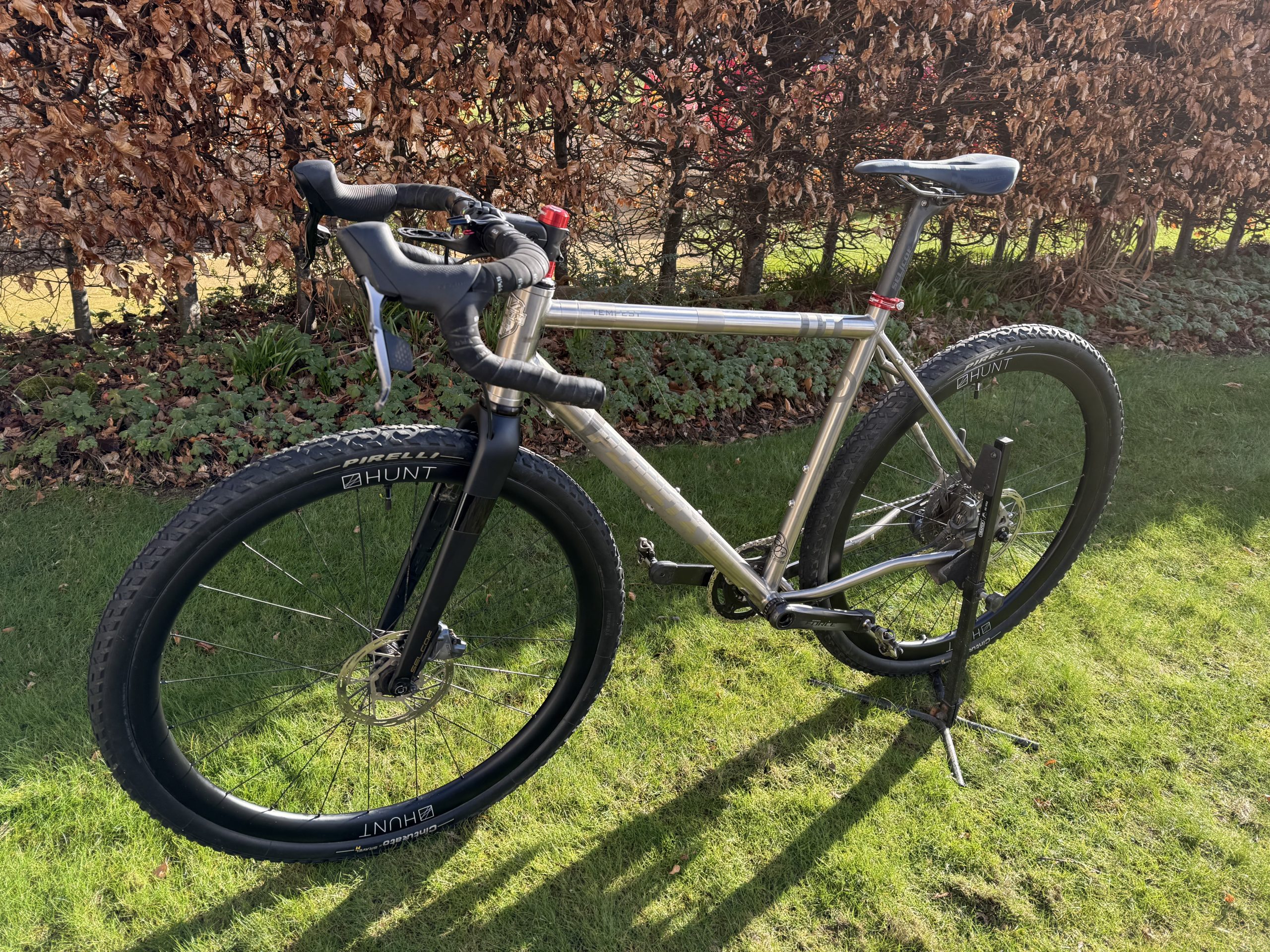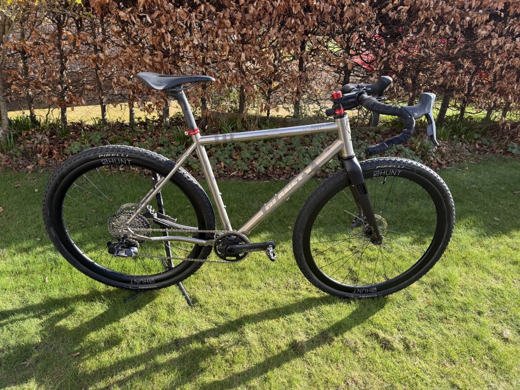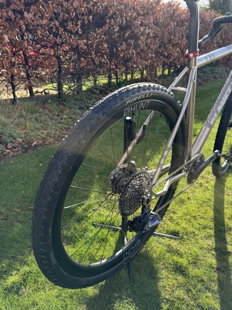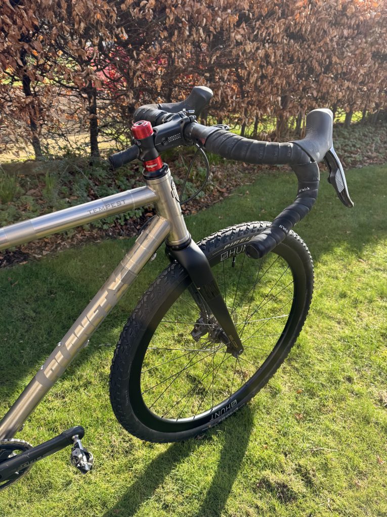 SRAM Force XPLR AXS 1×12 (10-44t) with power meter, Hunt 35 Carbon Gravel X-Wide wheels, Ritchey WCS Venturemax handlebars, Redshift Shockstop stem, Pirelli Cinturato M 45mm tyres, Reserve Fillmore valves.
