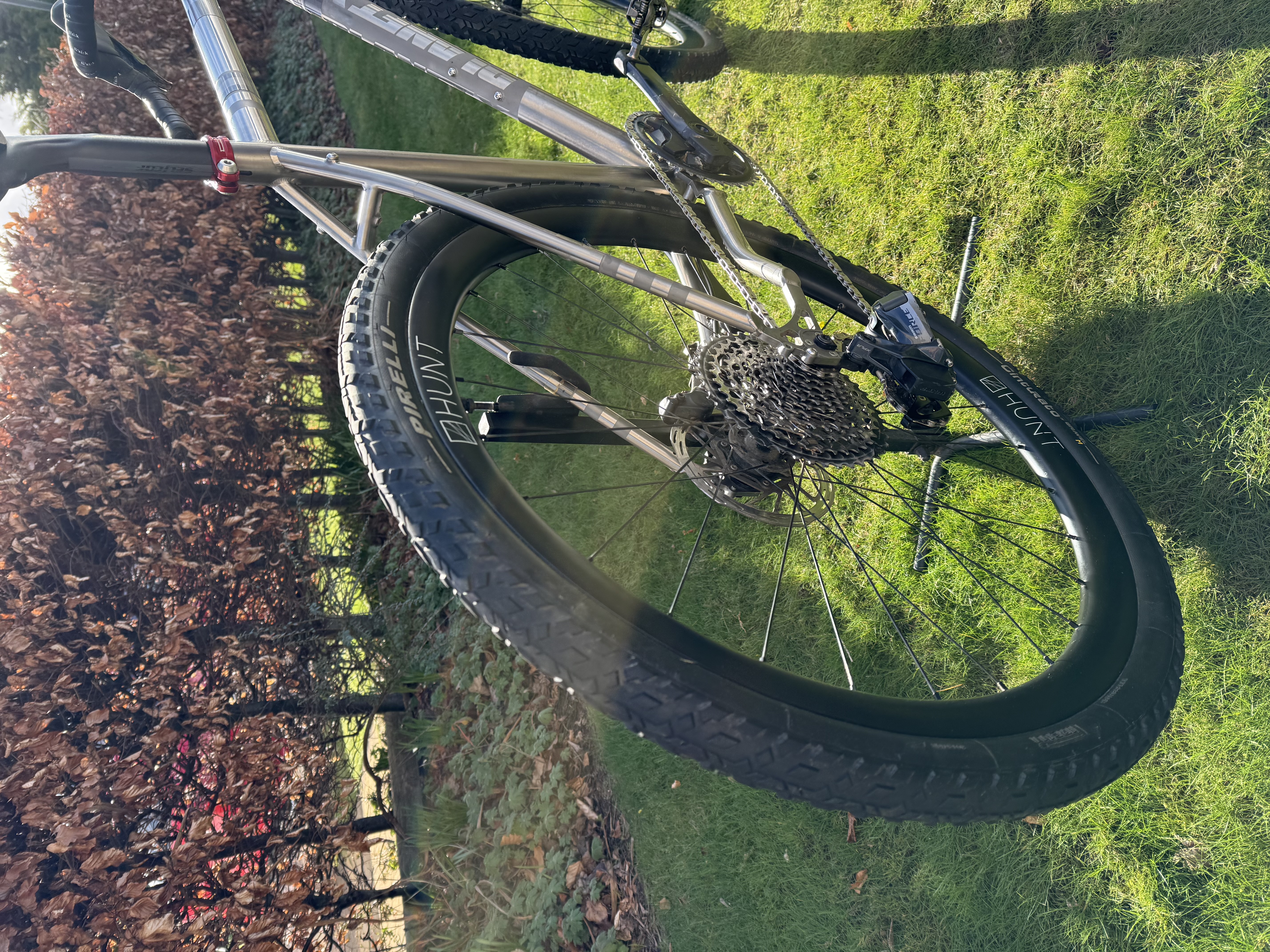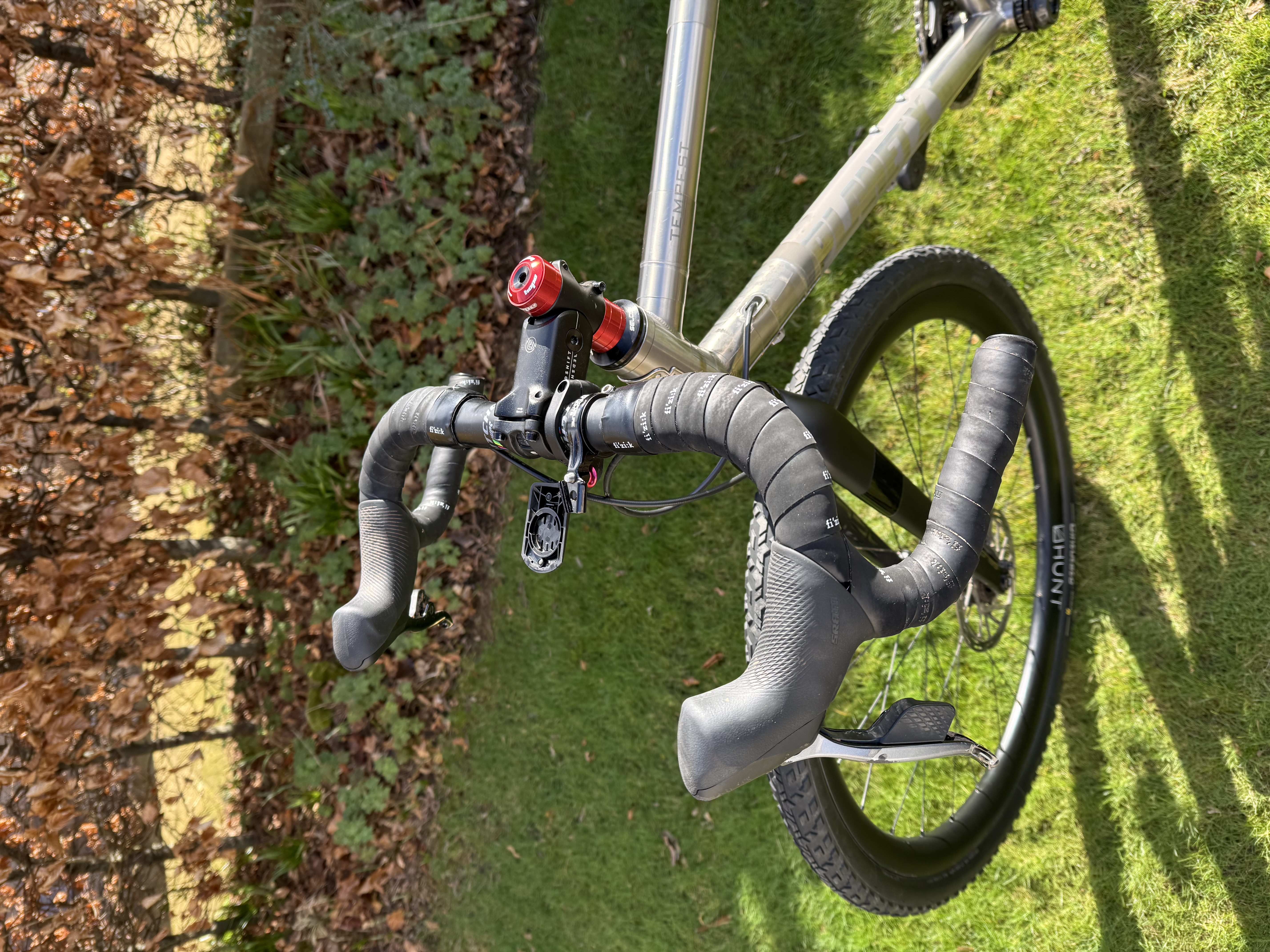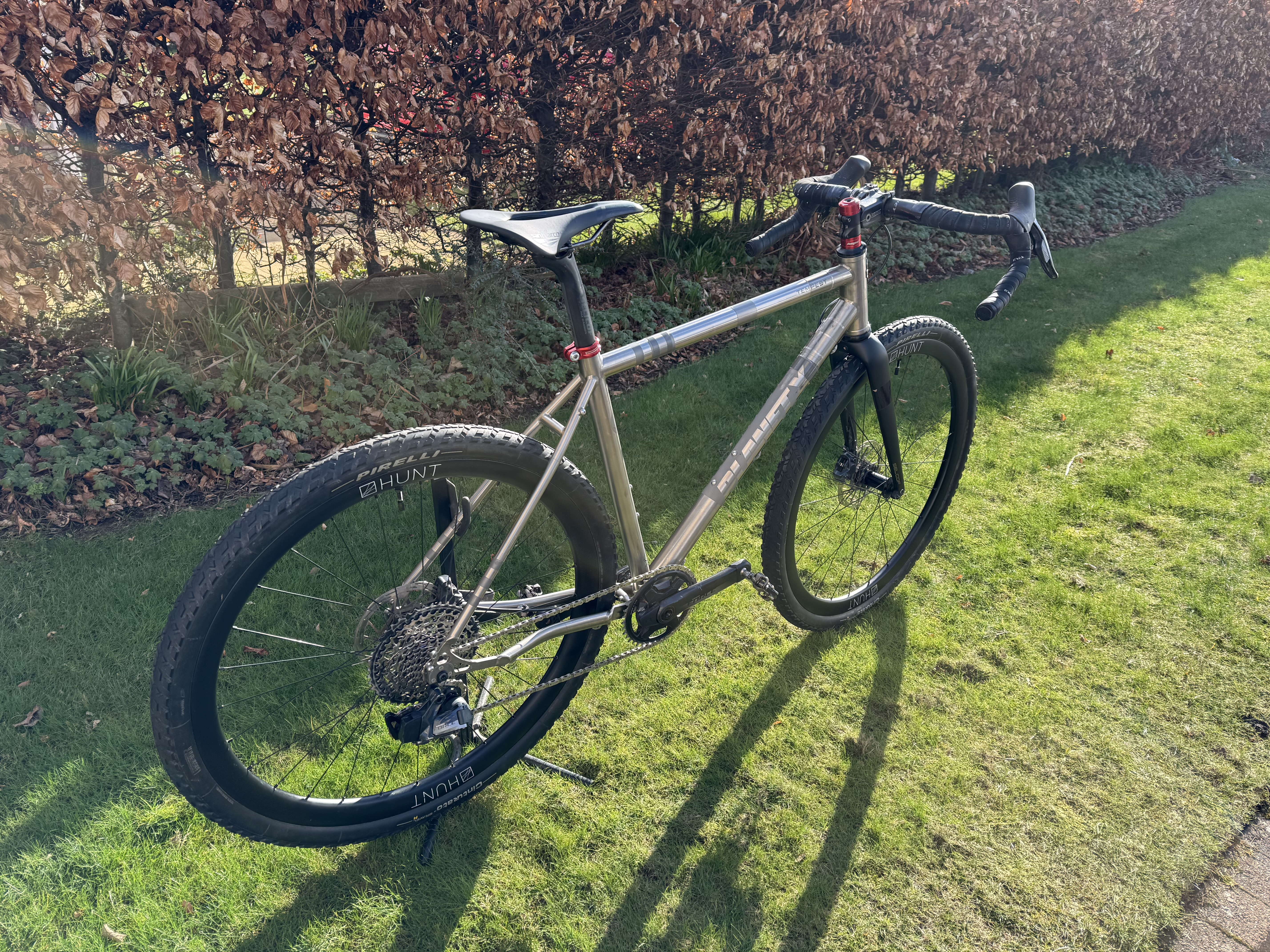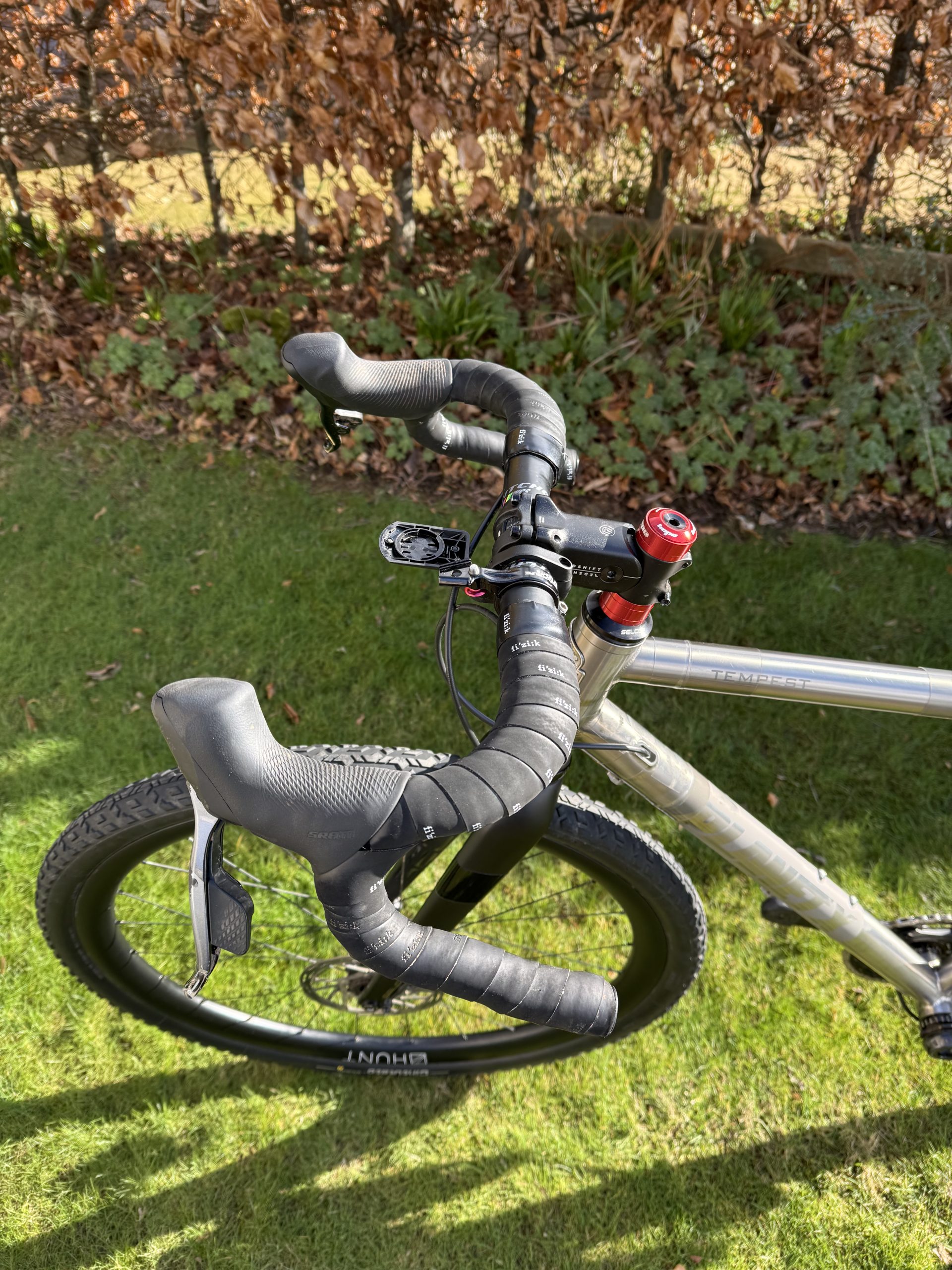 SRAM Force XPLR AXS 1×12 (10-44t) with power meter, Hunt 35 Carbon Gravel X-Wide wheels, Ritchey WCS Venturemax handlebars, Redshift Shockstop stem, Pirelli Cinturato M 45mm tyres, Reserve Fillmore valves.
