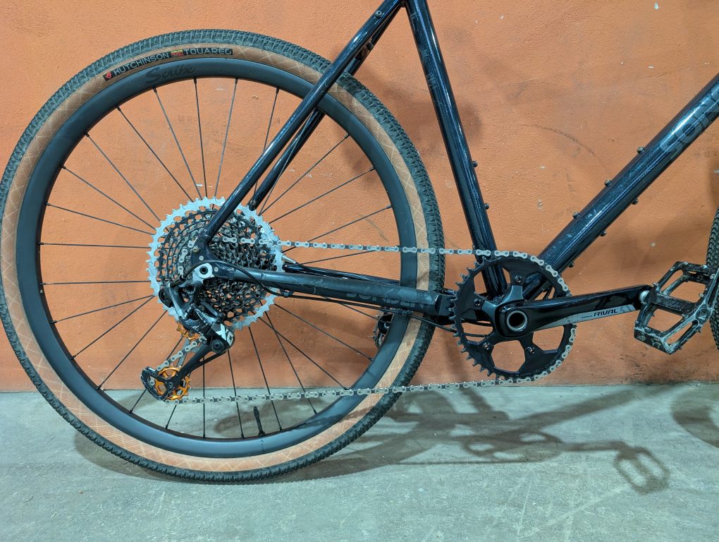 – drivetrain: SRAM X01 derailleur, waxed chain and 12 speed cassette, with a 44 tooth oval Garbaruk chainring and Rival 175mm cranks and shifters. I’ve done a Ratio 12 speed conversion allowing the use of a 12 speed MTB Group set on Rival shifter, making for a wide range 1×12 speed setup – shifts perfectly.