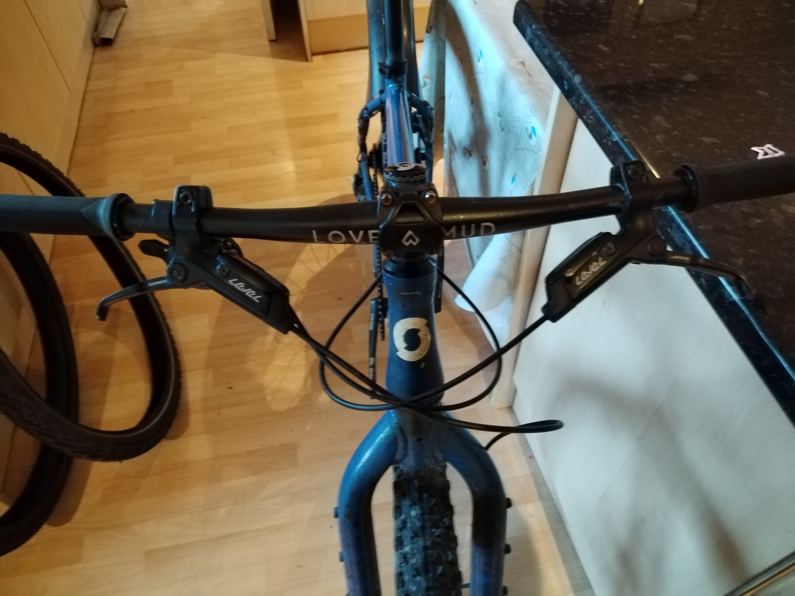 SRAM level brakes, working fine, rear lever is a bit bent.