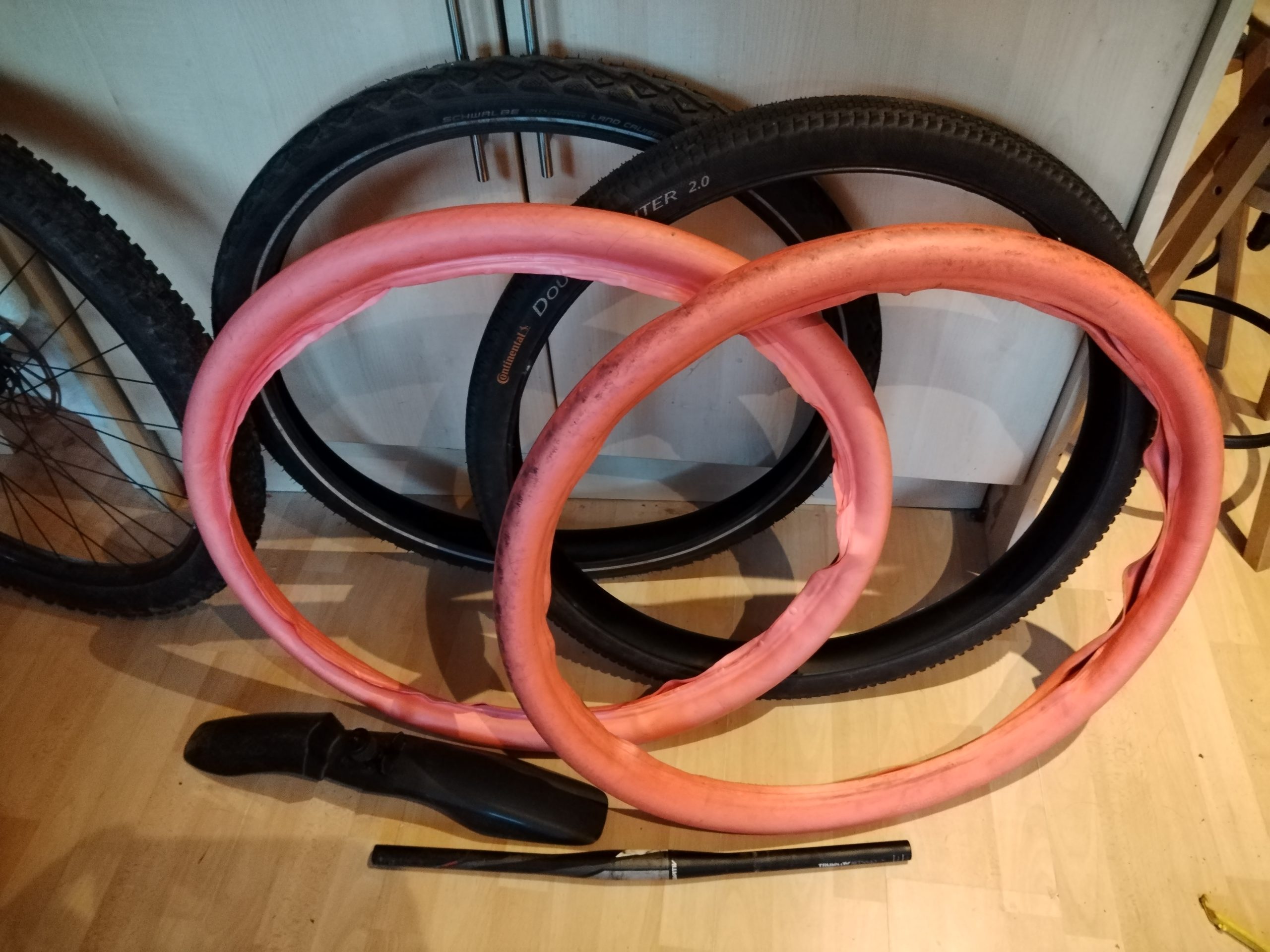 Maxis ardent tyres with good tread. Also included in sale are the commuter bits that were on it: Tannus armour inserts, narrow flat bar, conti double fighter 2.0 and schwalbe land cruiser plus. (Buyer obliged to take these to get them out of my life?).