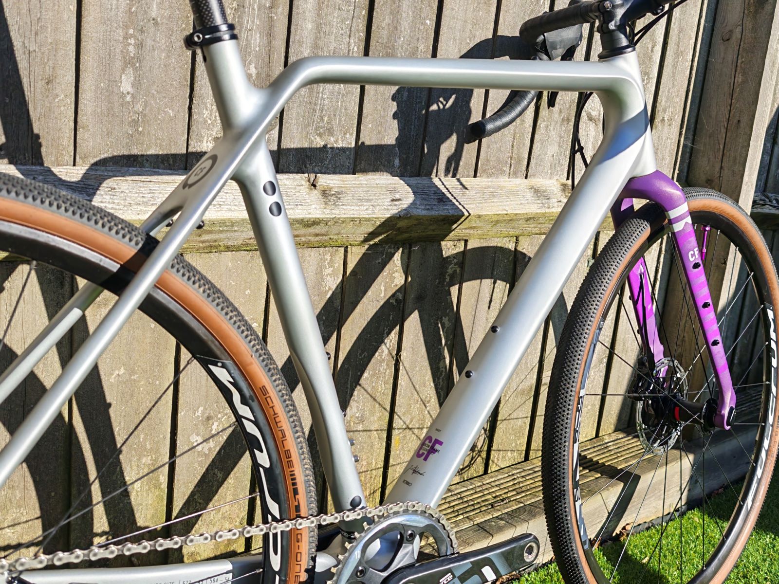 Schwalbe G-One Allround 700 x 40c folding tan wall tyres setup tubeless with purple valves