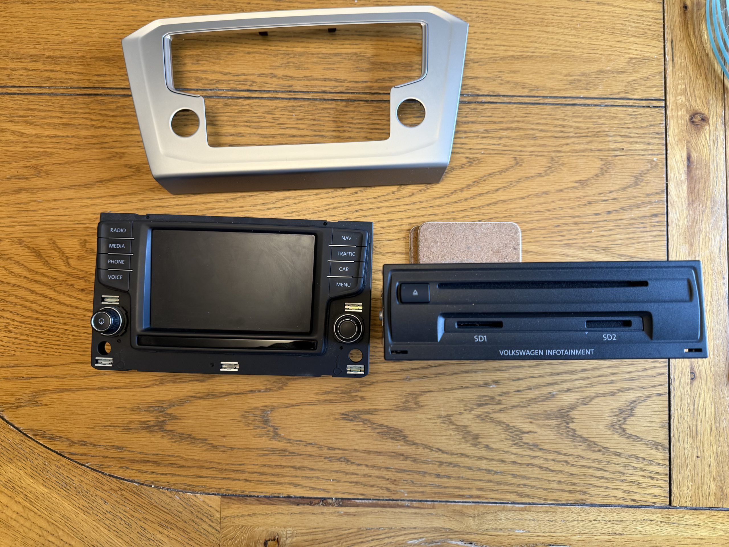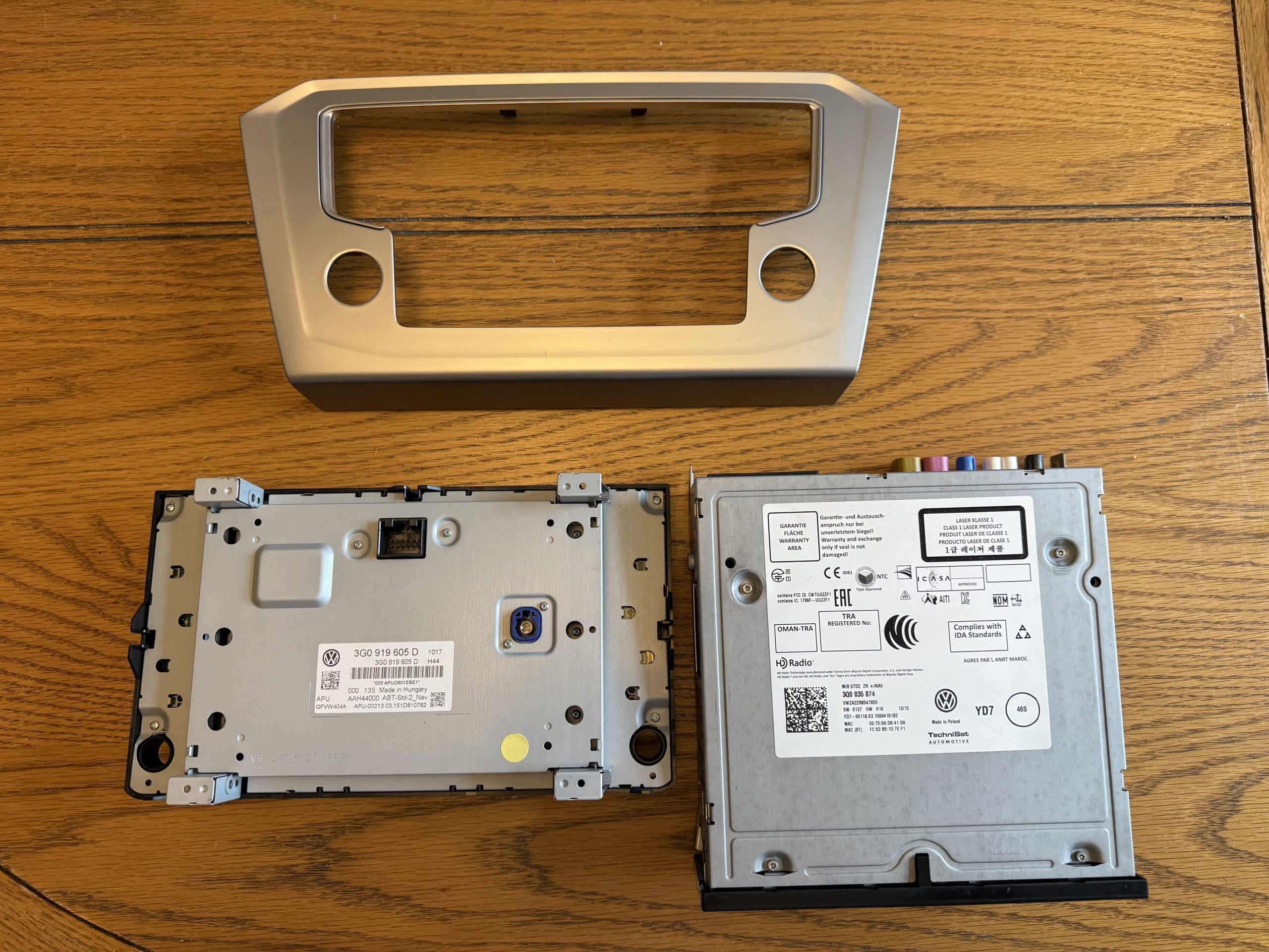 This is a listing for the VW head unit (3G0919605D), glove box computer (3Q0035874 MIBSTD2) and a surround to fit a Passat B8 (circa 2015).