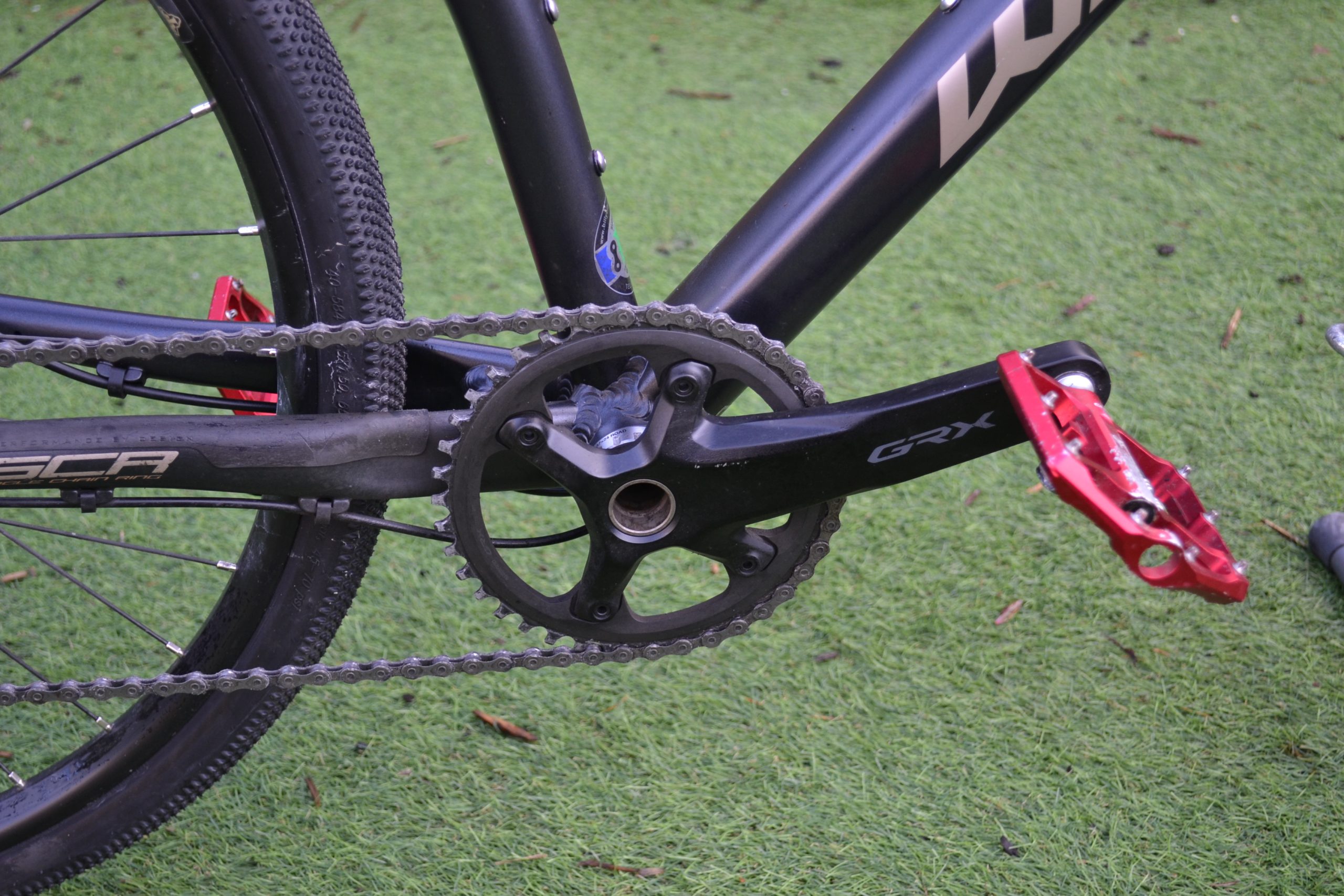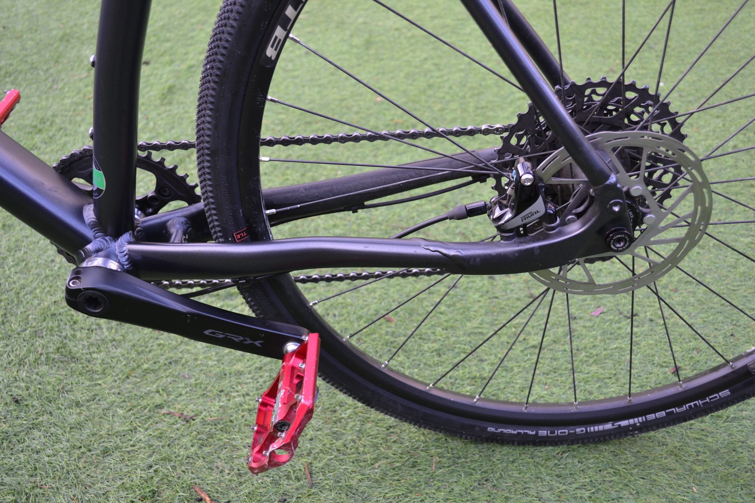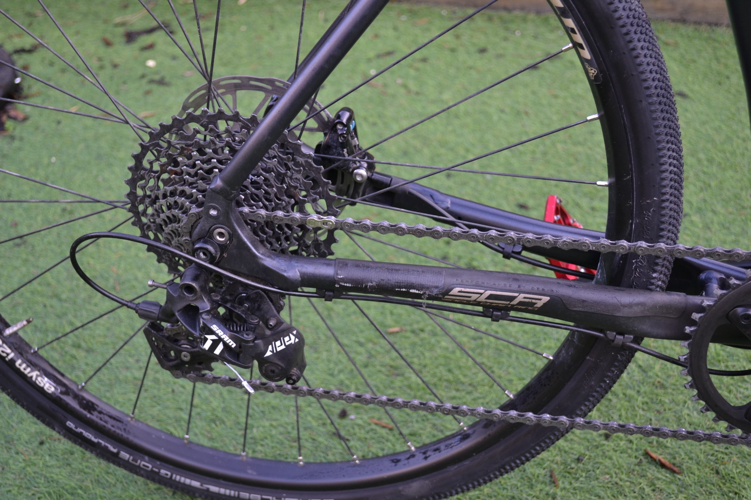 1 x 11 drive train – SRAM Rival levers, SRAM Apex rear mech, Shimano GRX cranks