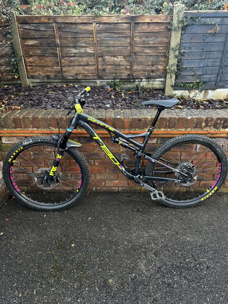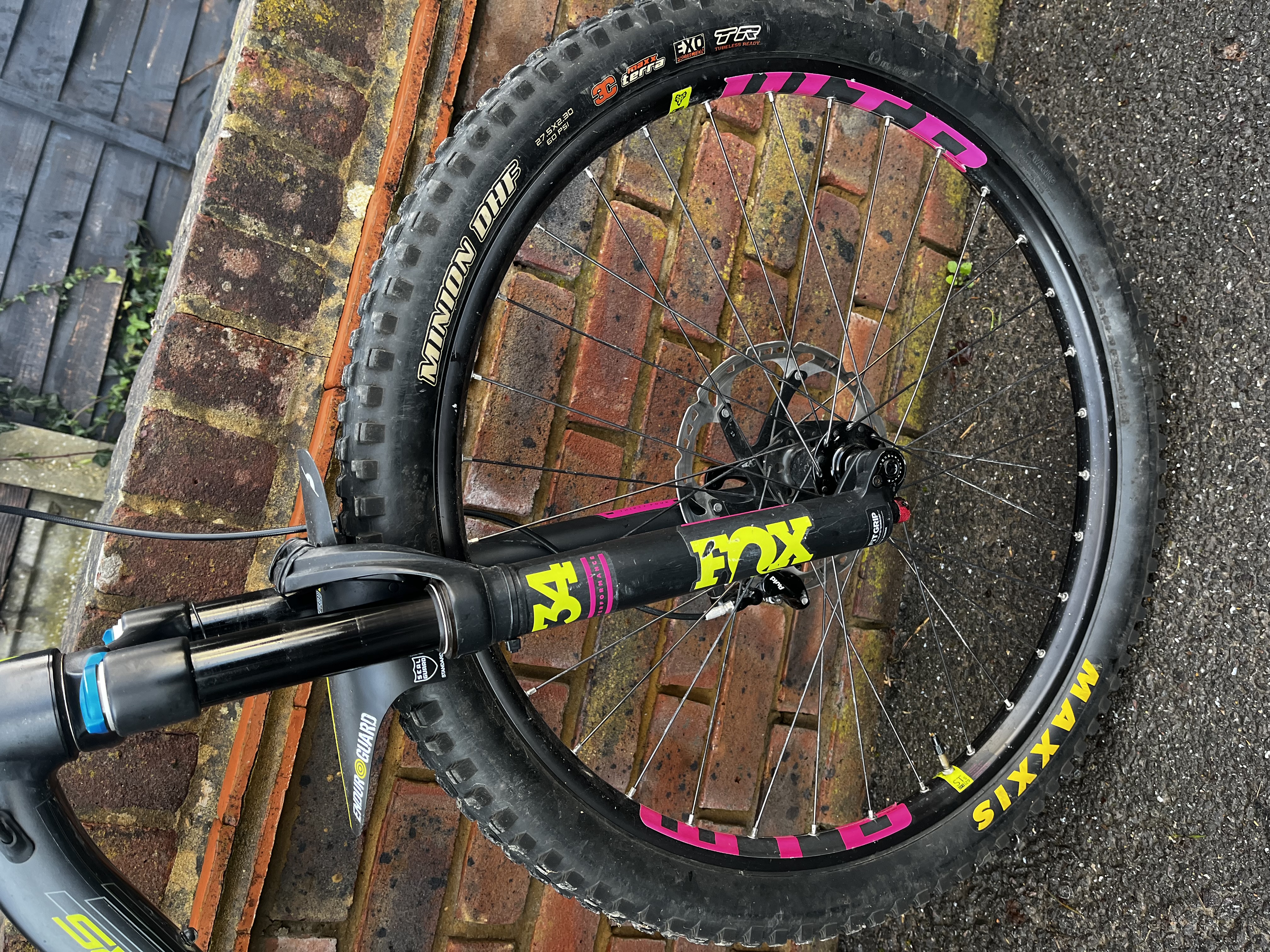 Pretty standard, but a few changes from original spec – 140mm air shafted fitted in forks (old one included as well), different brakes and dropper to originals, better Maxis Minion tyres, Nukeproof saddle, Ergon lock on grips but stated below.