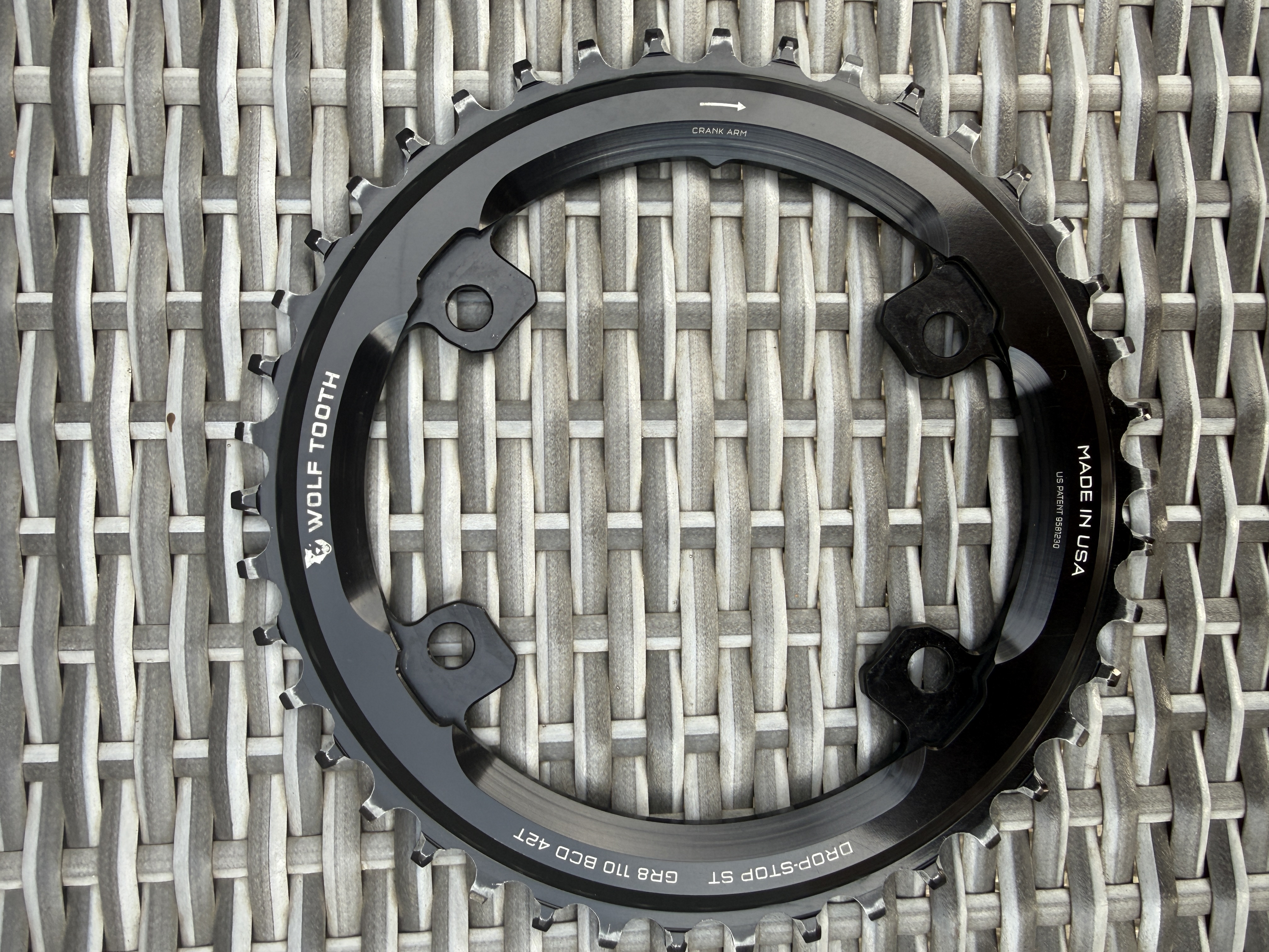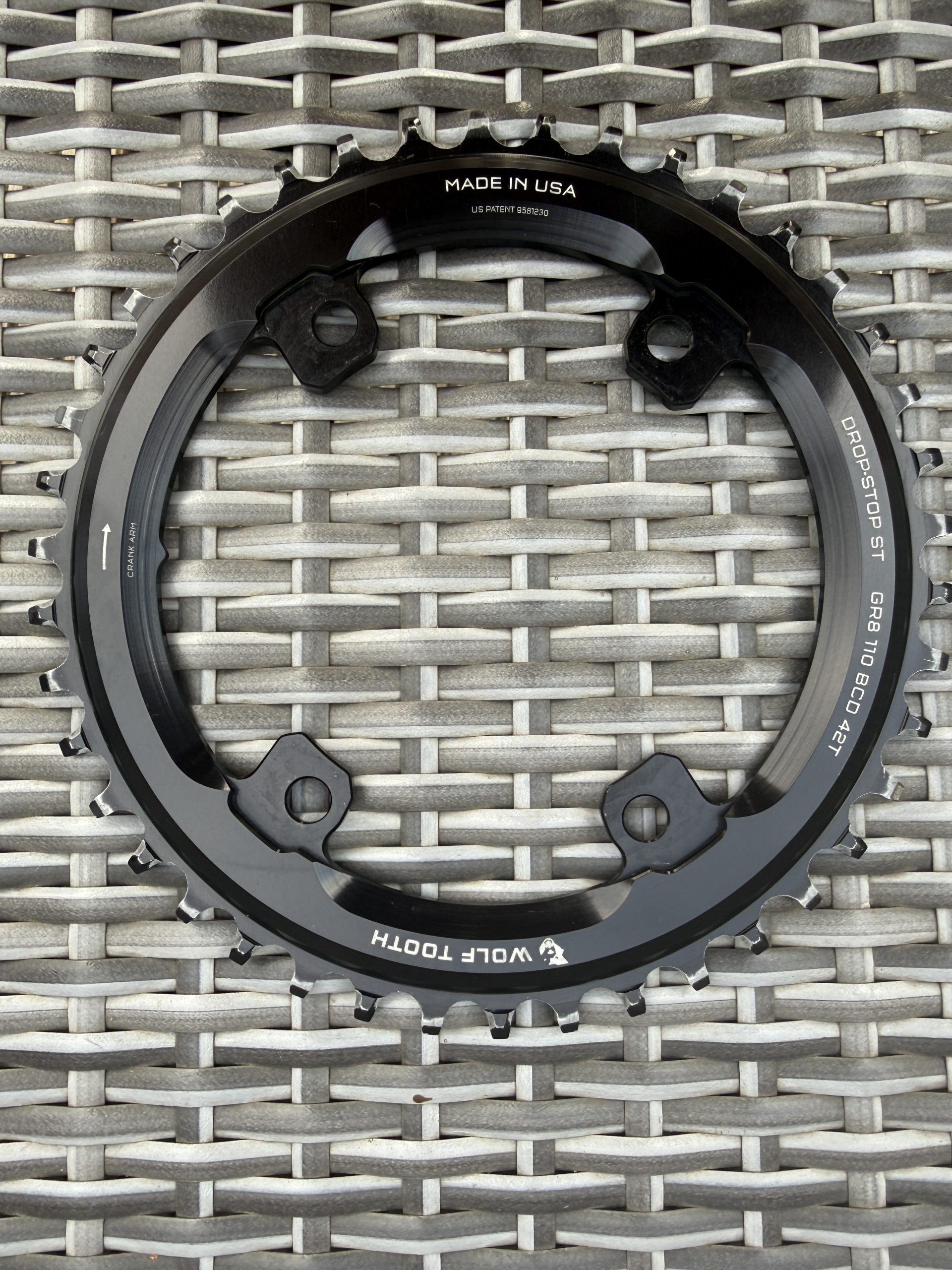 Wolf Tooth GR8 110 BCD (Shimano GRX series chainset) 42 tooth chain ring. Very little use and in great condition. For use with 12 speed chains (I believe they’re fine with 11s too, but not something I’ve tried).