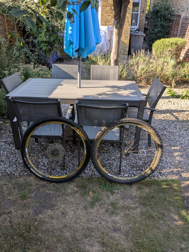 29er Stans Black Flag Pro Rims laced to Sunringle 15x100m (front) and Hope Pro 2 Evo gunmetal (rare colour) (rear). Rear wheel unfortunately has two broken spokes and the Hope hub is a little rough. Otherwise straight and true. Set up tubeless with Maxxis Rekon Race 2.25 and Specialized Ground Control 2.1 – £40