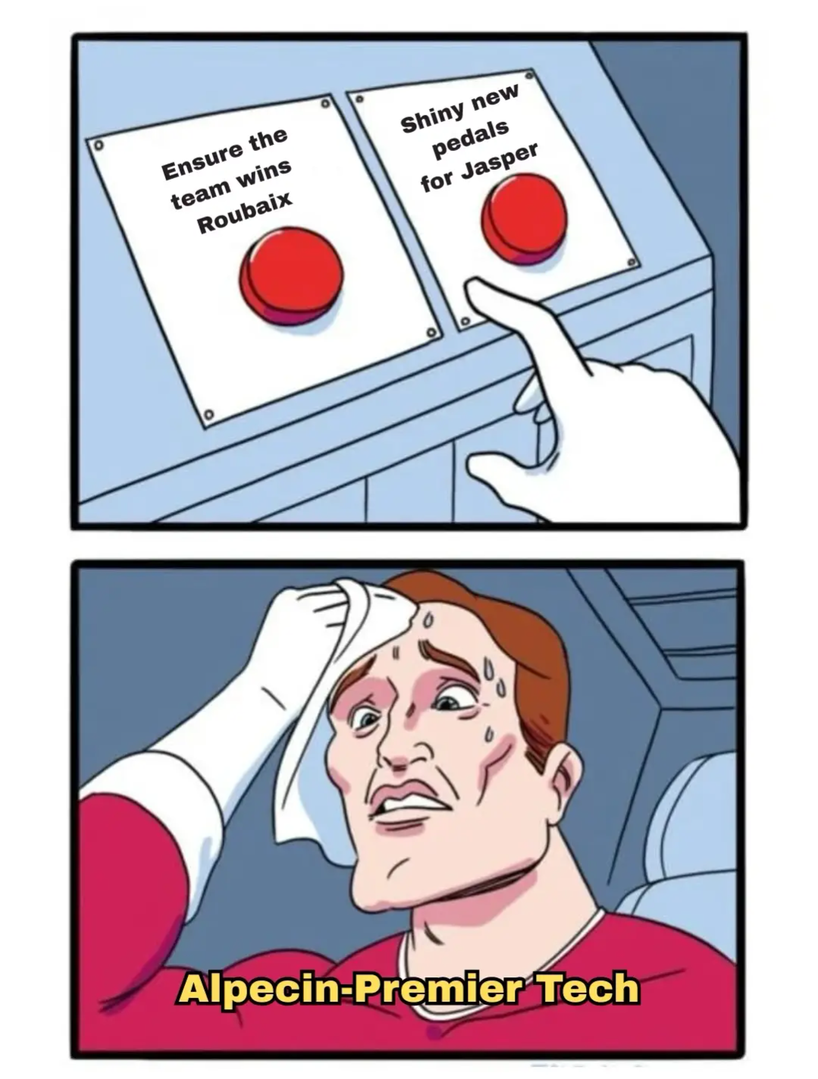 The pedal thing, if true, is insane. One of the absolute basics is ensuring that all riders in the team are on the same pedal system.