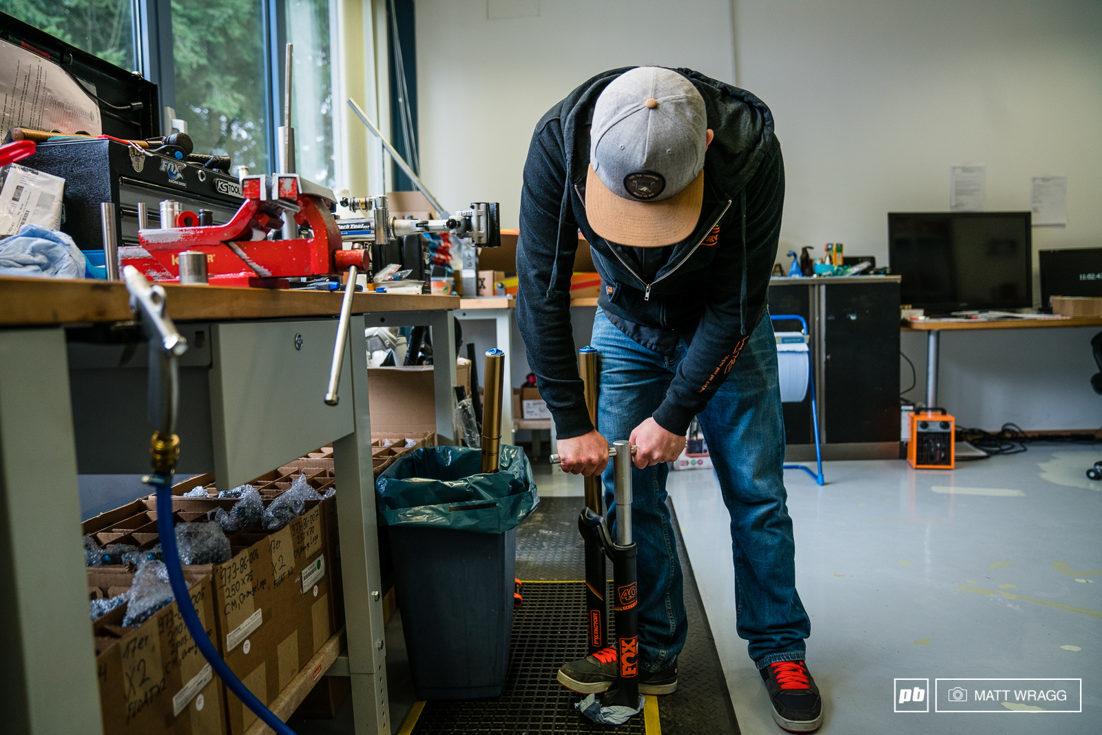 [b]With the stanchion carefully set aside[/b], Kolja does one of the things that he says makes the biggest difference to the feel of the fork—he works the bushings.