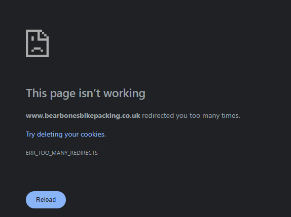 Can’t get on to it (bearbonesbikepacking.co.uk) on my iPhone or iMac. I get the message “Safari can’t open the page because too many redirects occurred”.