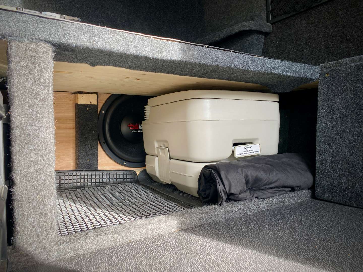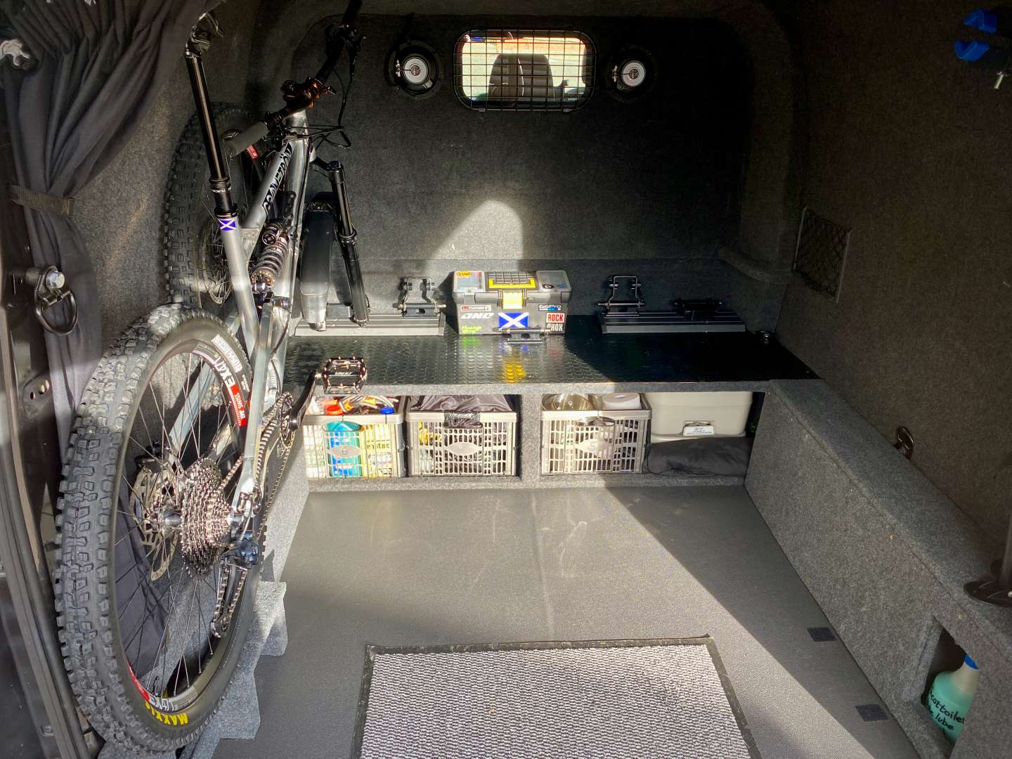 Then for camping i built a false floor and space to slide storage boxes in underneath. That required removing the front wheels and i bought 4 of the roof rack fork mounts and bolted them to the false floor. The wheels went down the side in bags.