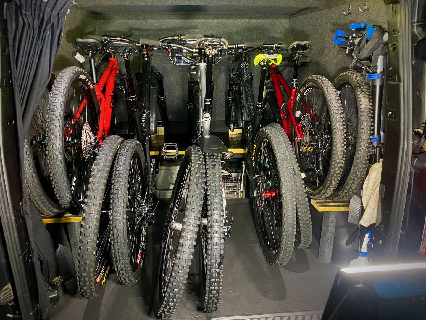 I went further and built a platform against the bulkhead: storage below (essentials for 'day van' use - gas stove, kettle, etc and a portapotti, plus bike wash etc) and multiple fork mounts on top. Fork attachments are on sliding mounts so I can accommodate different bike combos without anything clashing. 5 bikes easily with space for more. Also 2 x 12" subwoofers and a big amp under there but that's another story.
