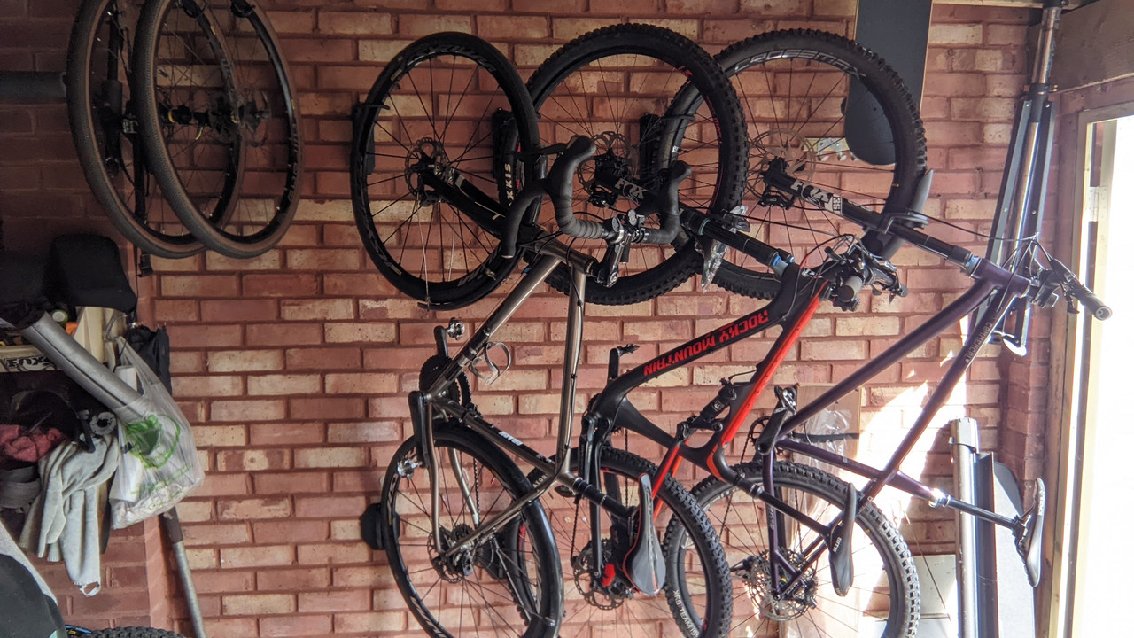 Another option would be to hang the bikes by the bars so the saddle is against the wall, not so ergonomic for getting them up and down but would mean i can clean and oil chains and remove wheels etc while still on the wall. If i followed the angle of the roof with the bars (hooks either side of the stem) then that would let me get them up close to the roof. Time to get the bikes out from their current storage and try a few options with wood, screws and bungees