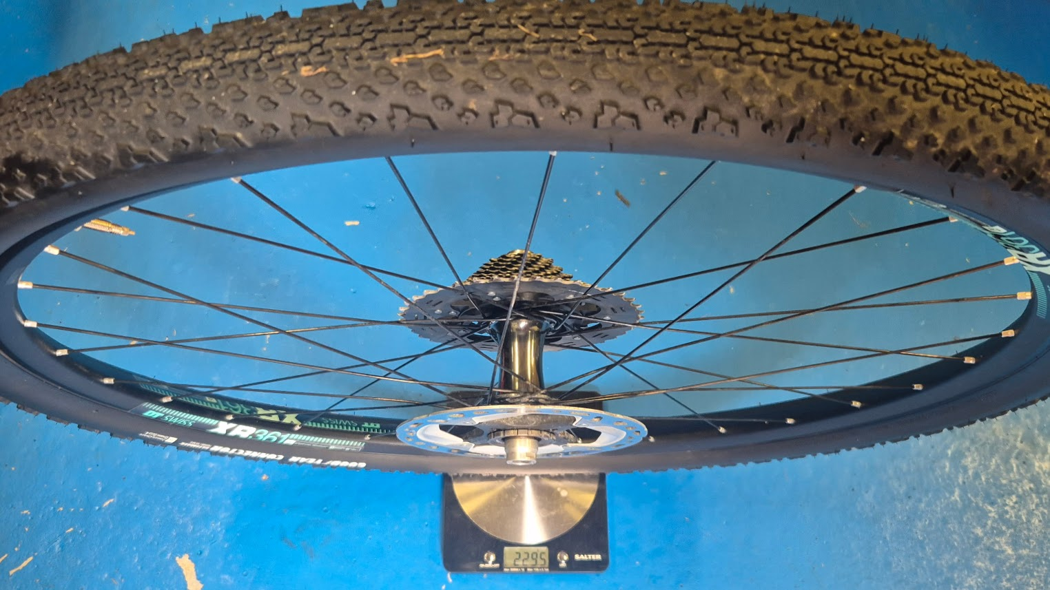 2295 grams! No wonder it feels a bit 'steady' on the road. To be fair, it is basically a 2010ish spec Mountain bike wheel.
