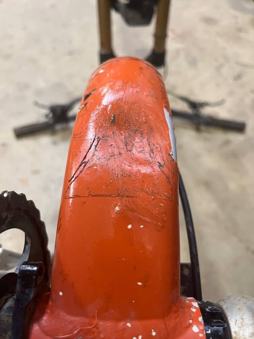 Note to frame designers, stop designing downtubes with 7 or 8 inch of horizontal section sprouting from the bb shell, it's asking for damage, back in the day a bash guard or the chainring would've took the brunt of that instead of the frame, but that frames been missing a protector for quite some time by the look of it, not that it would've helped that much.
