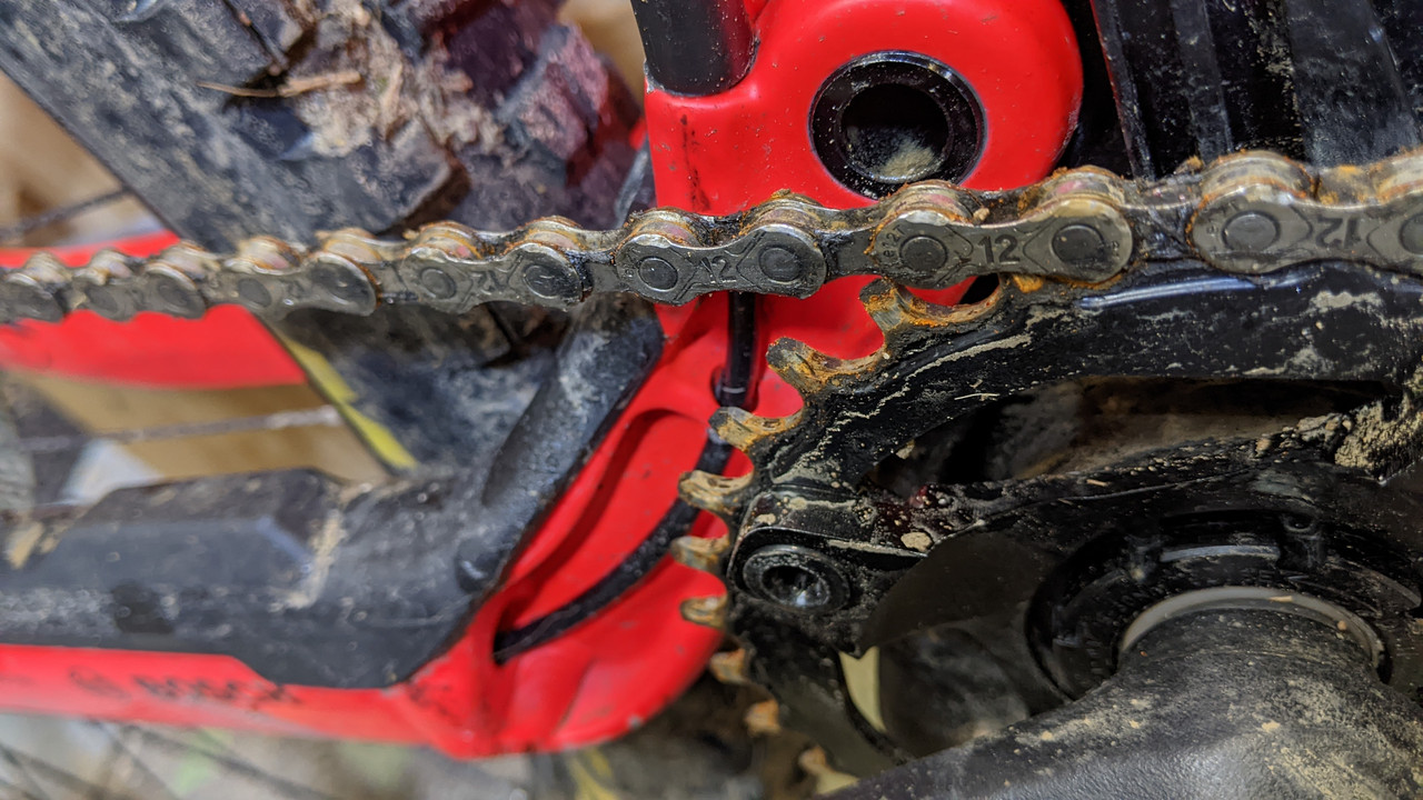 Thing is, even if you splatter the chain with mud it doesn't really get gritty and grindy. Not exactly sure how, I think maybe that there's enough wax all over it to repel the water. It's a strange sensation ploughing through slop with a silent chain, but it's what happens.