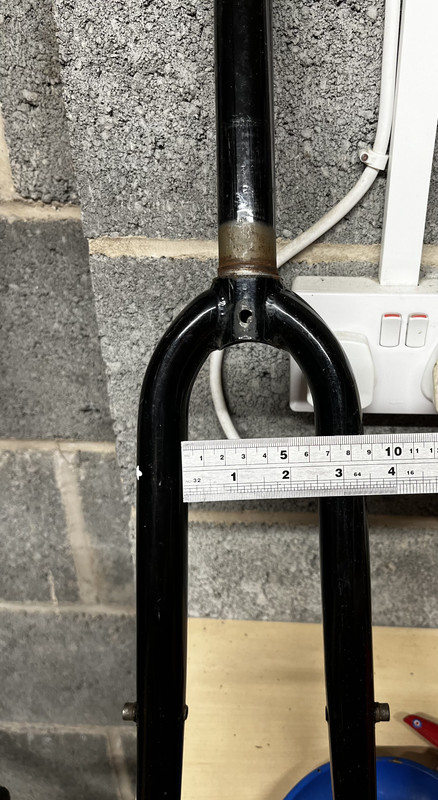 @squirrelking - approx 62mm between the legs. Very gentle taper. I was using 700x40mm tyres with more than enough clearance.