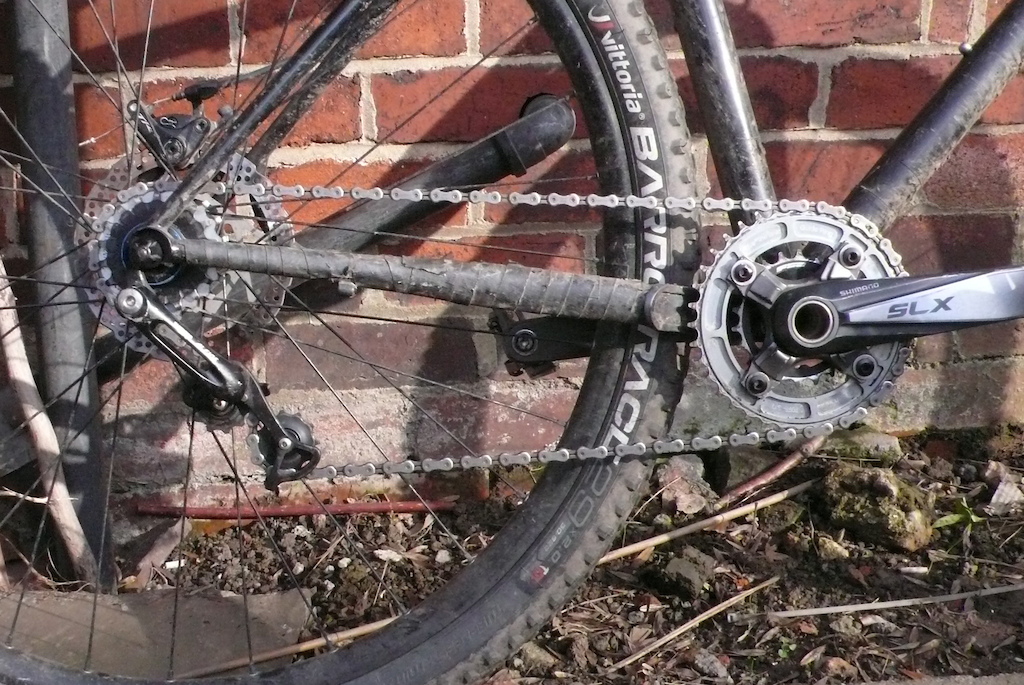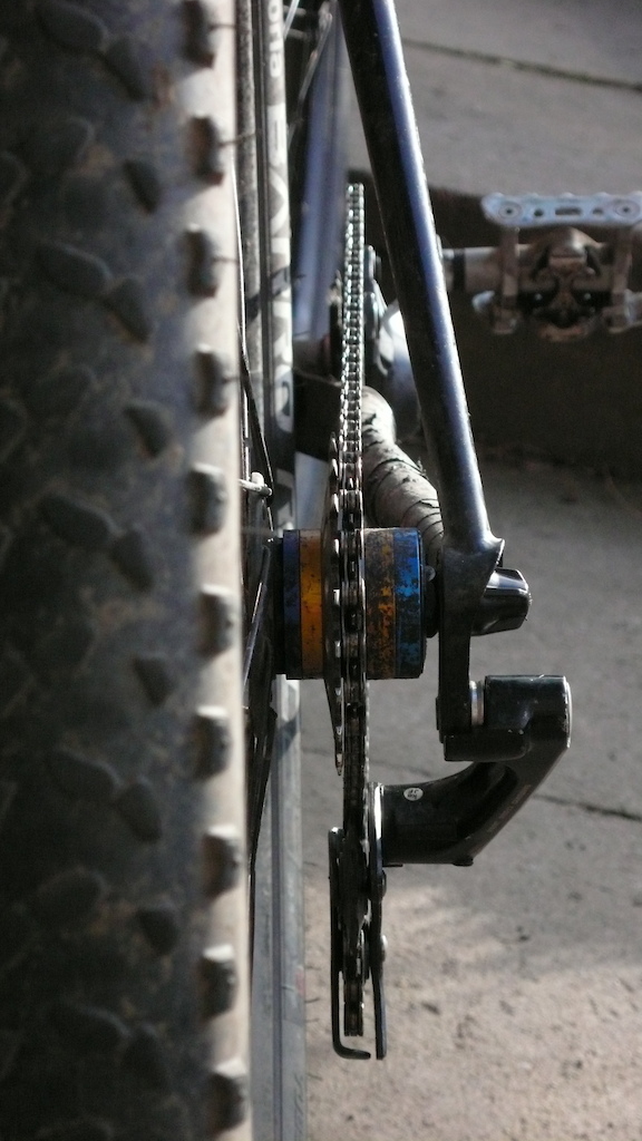 The two jockey wheels idea is a good one, if I ended up adding another chainring to the front I may try that. Or the rear mech with a short length of cable idea, that's a nice fix. That would be good as I'd technically then have a fingle speed, if all four combinations of cogs were different. Although that's beginning to defeat the object of not having gears 🙂
