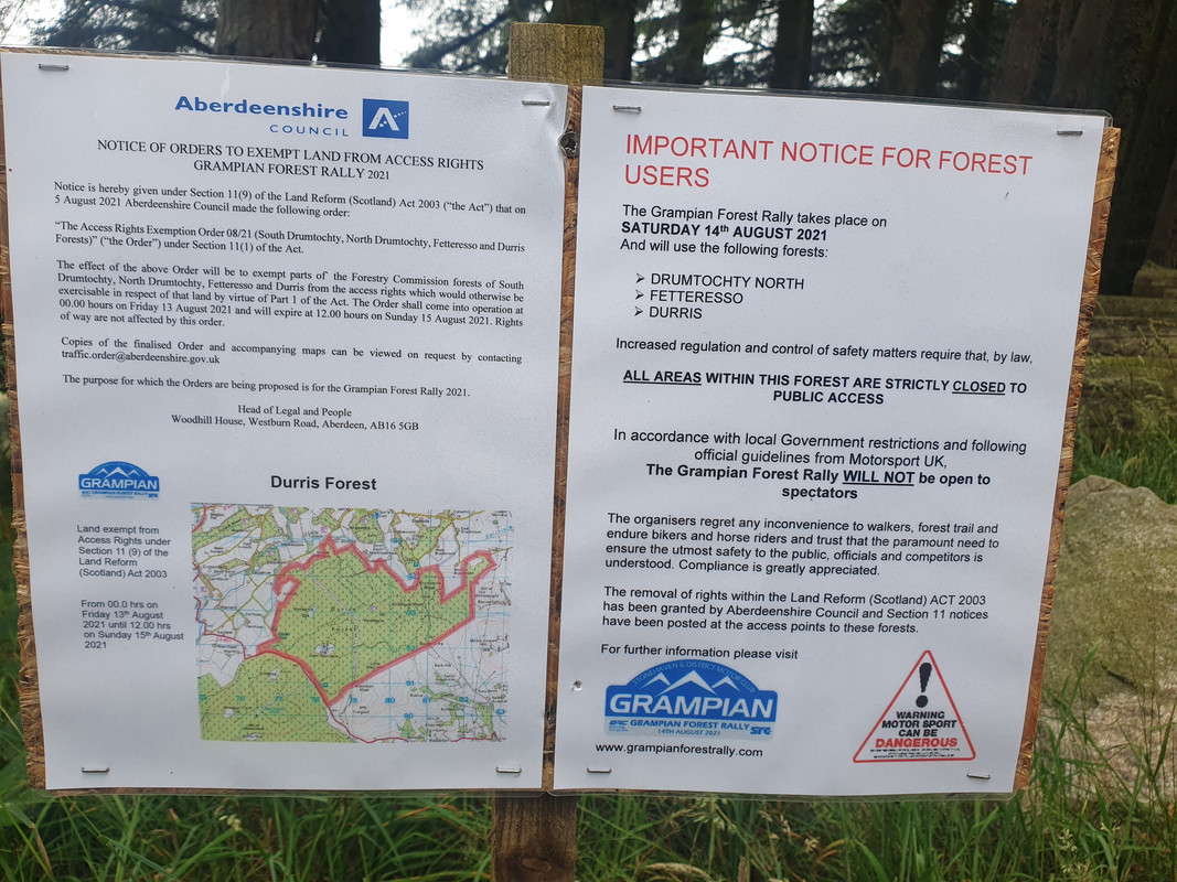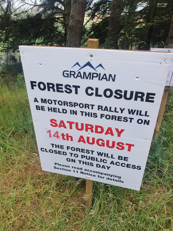 Was there today and there are signs for a motorsport event in forest 13-15th Aug. Also in Drumtochty North and Fetteresso