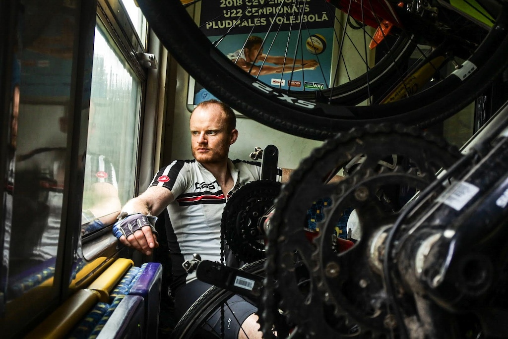 The last stretch didn’t involve a lot or riding- we got up at 5am to catch the 6.20am train from Vilnius to Warsaw. This is a complicated journey, only possible from Friday to Saturday and only twice a day (well, once in the day and once in the night). The first train went to Kaunas, in Lithuania, quickly, so we got breakfast there and did a mini criterium around the circular church in the middle of the town.