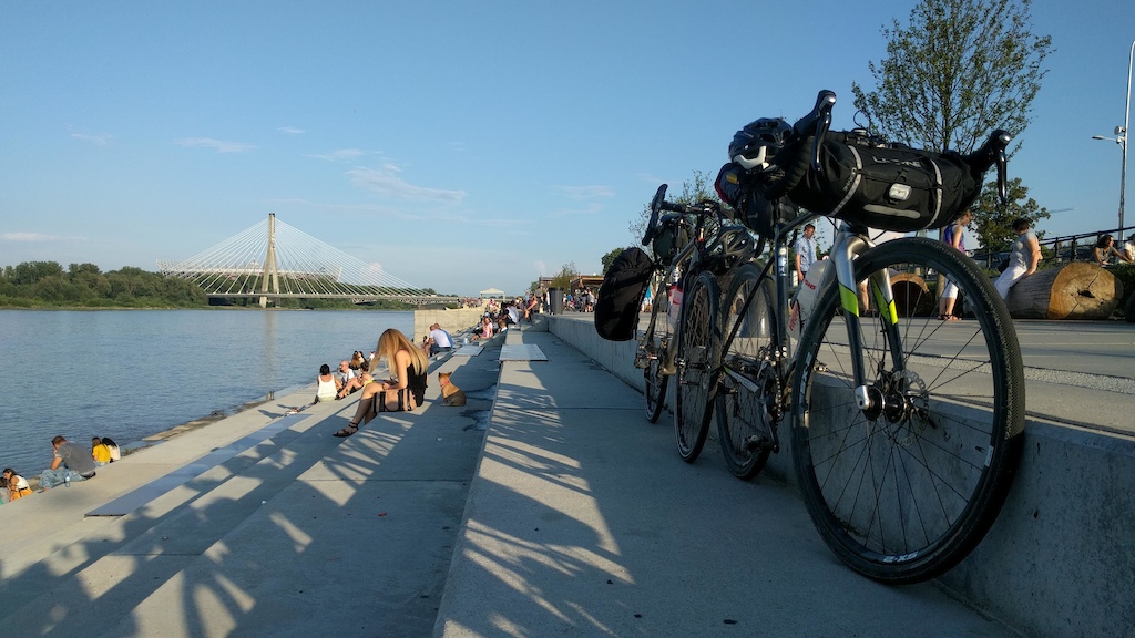 Then the final drag to Warsaw on a bigger but even more packed train in 36<sup>o</sup>C heat- fortunately our reserved seats were in the one carriage with air conditioning. We ended with beers by the river, then at the pub where a very kind bike shop had left four bike boxes. Despite being the closest bike shop to our accommodation this led to a 4 mile ride completely drunk with a bike box each. There was some blood and a set of handlebars got bent.