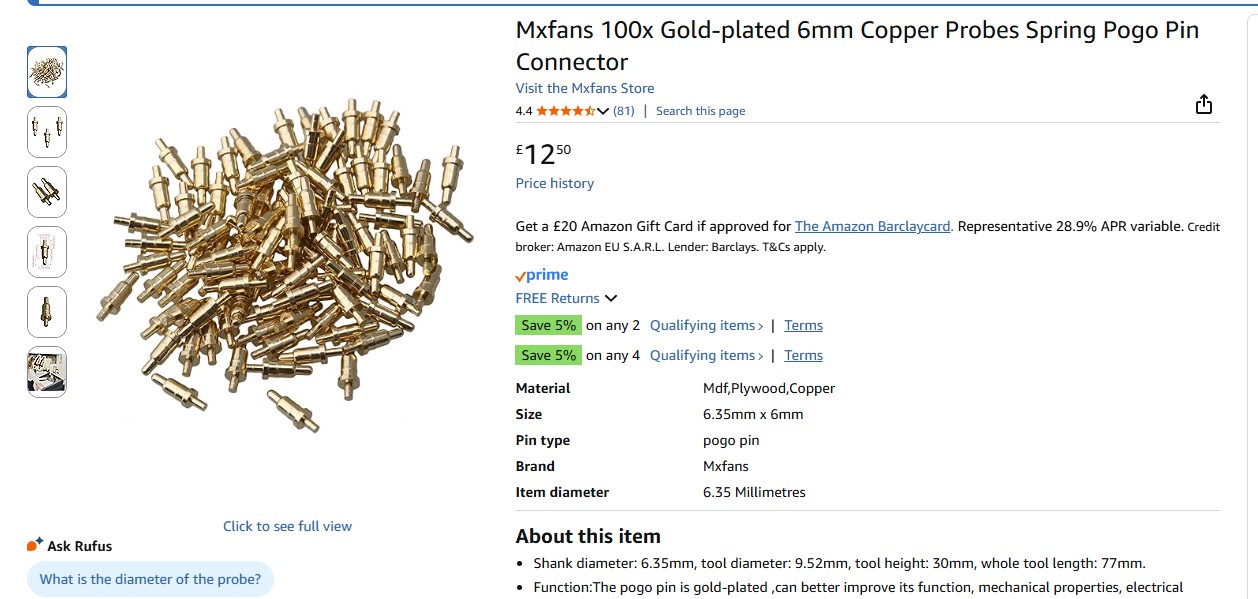 bollox amazon link won't work - look for this on amazon: "Mxfans 100x Gold-plated 6mm Copper Probes Spring Pogo Pin Connector"